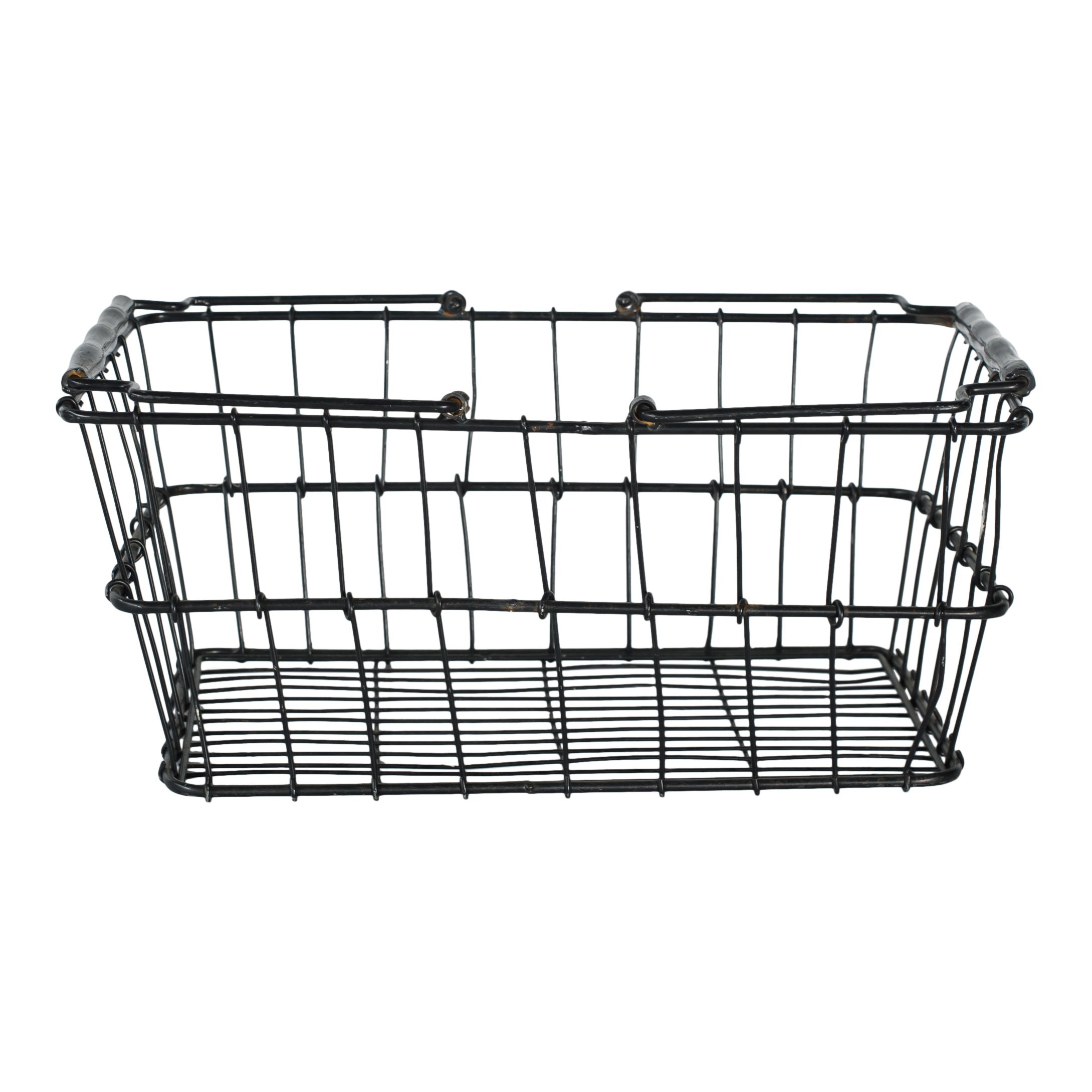A structured wire market basket with a sleek black finish and easy-grip handles. Great for gathering welcome essentials, corralling ceremony programs, or adding a touch of utilitarian style to any display. Dimensions: 18 x 11 x 8