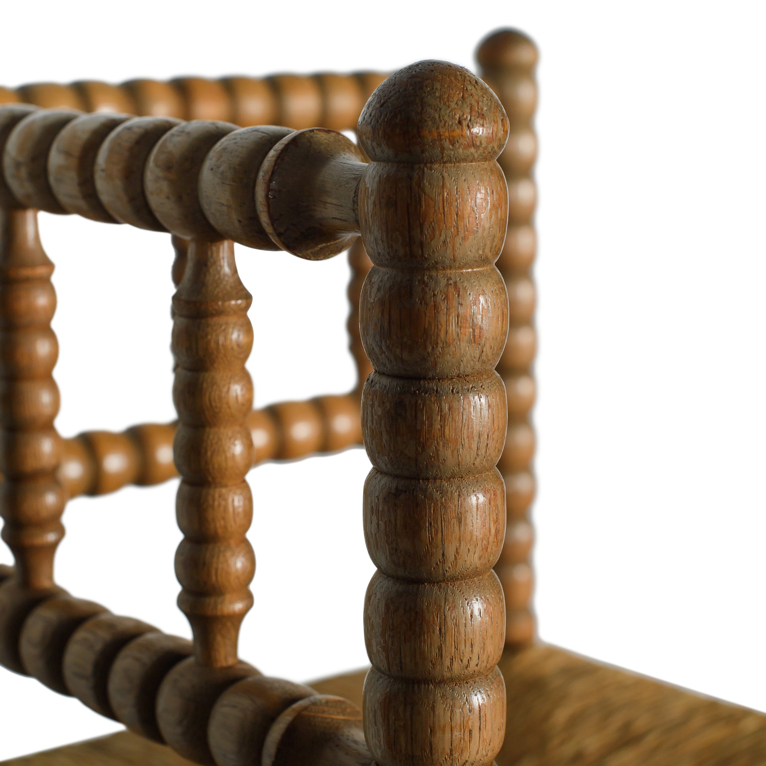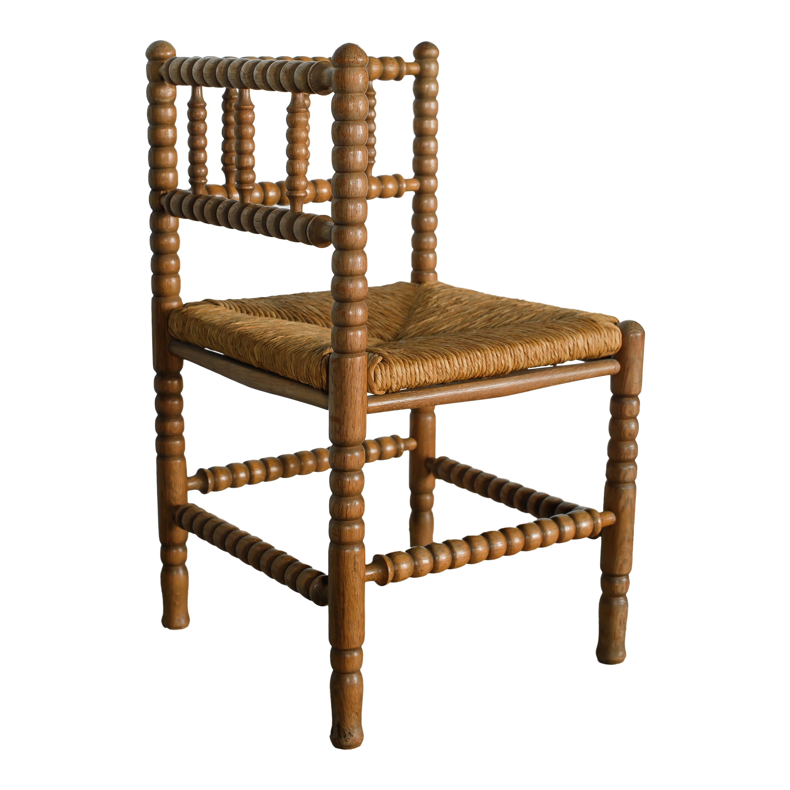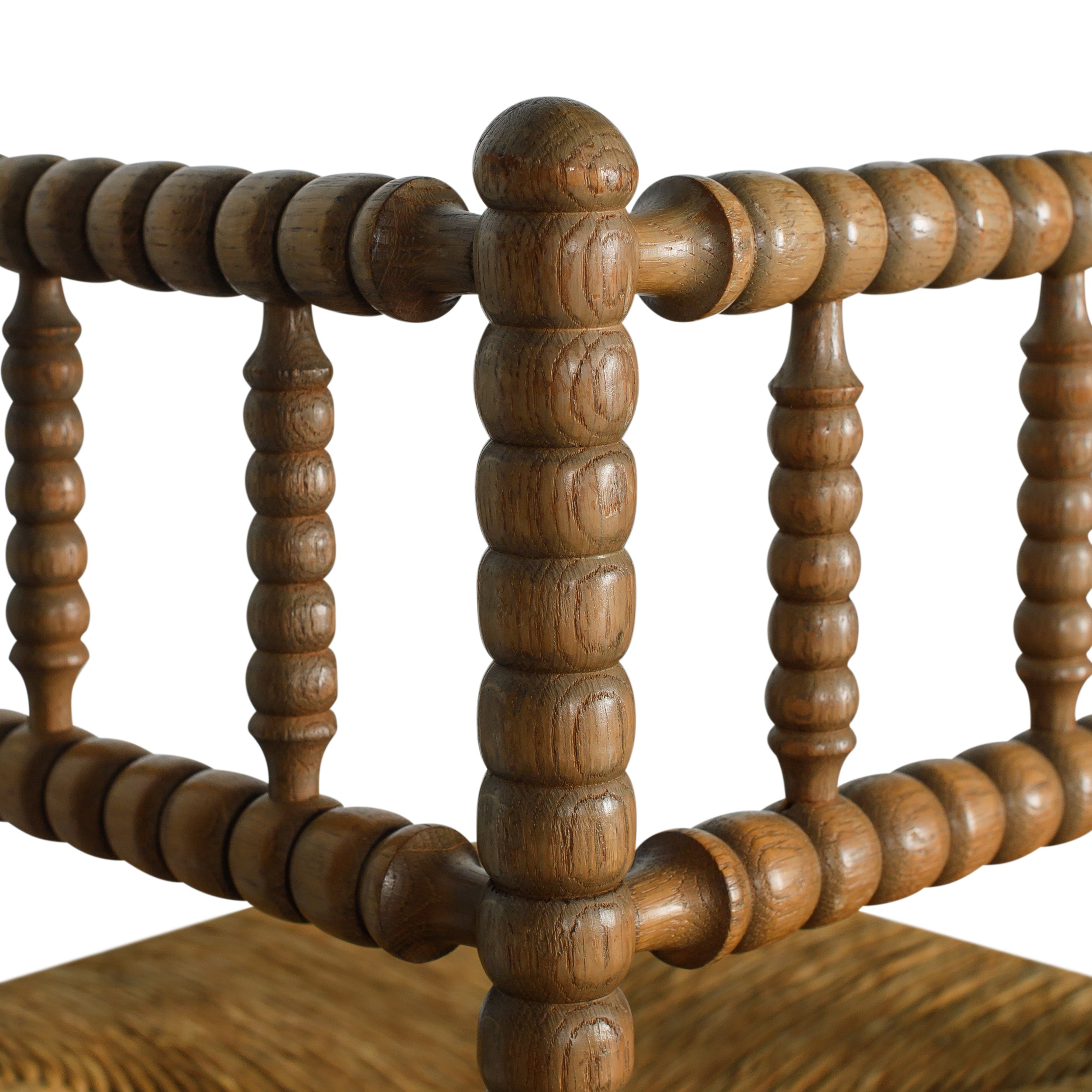 A vintage accent chair crafted with detailed bobbin-style turnings and a hand-woven rush seat. Its warm wood tone and sculptural frame bring character to any space. Use it as a standalone accent, a decorative pull-up chair, or a charming addition to an entry vignette. The visible wear and patina reflect its age, giving it a collected, time-honored feel perfect for layered styling.