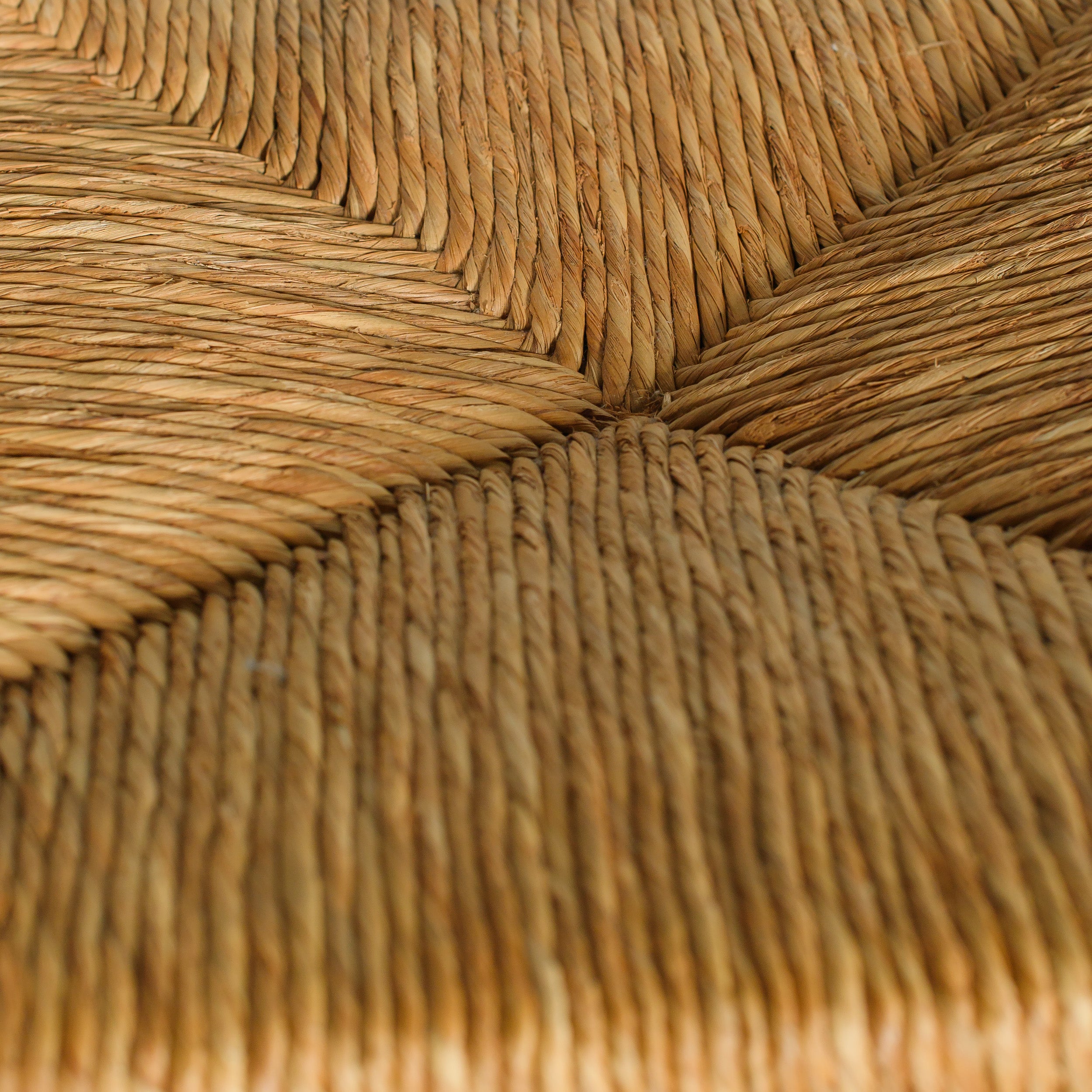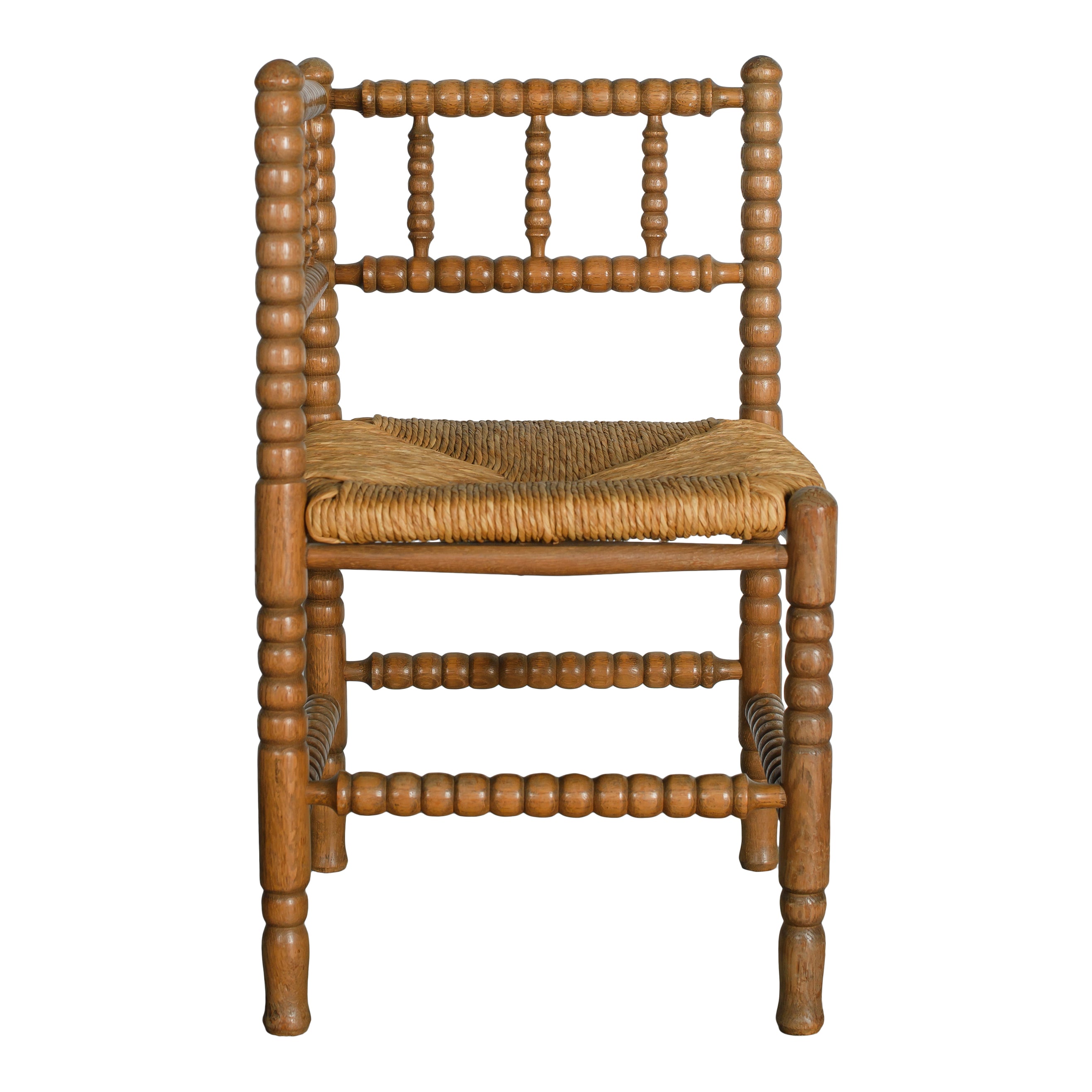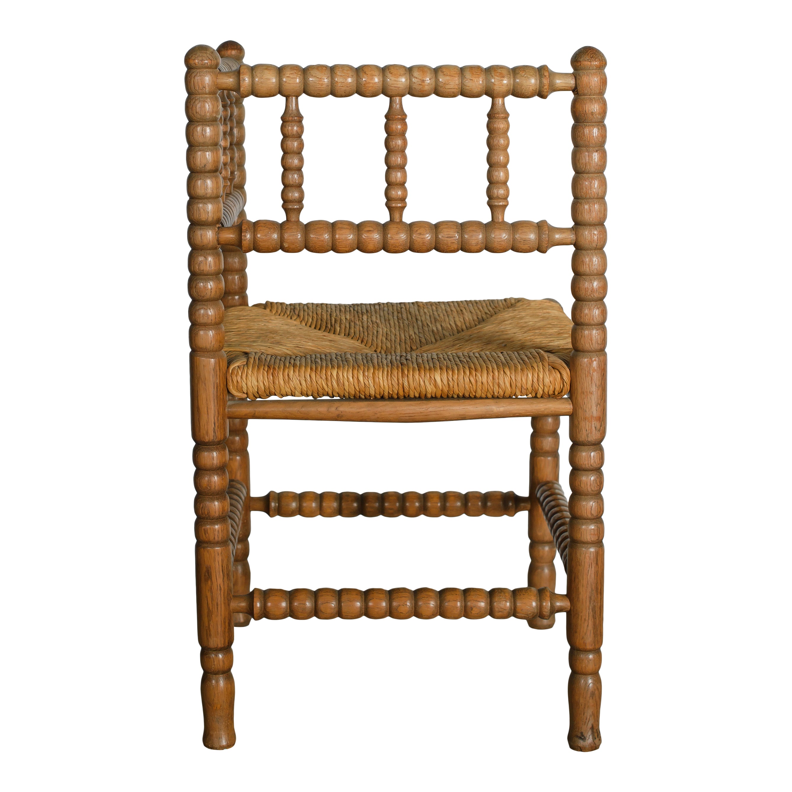 A vintage accent chair crafted with detailed bobbin-style turnings and a hand-woven rush seat. Its warm wood tone and sculptural frame bring character to any space. Use it as a standalone accent, a decorative pull-up chair, or a charming addition to an entry vignette. The visible wear and patina reflect its age, giving it a collected, time-honored feel perfect for layered styling.