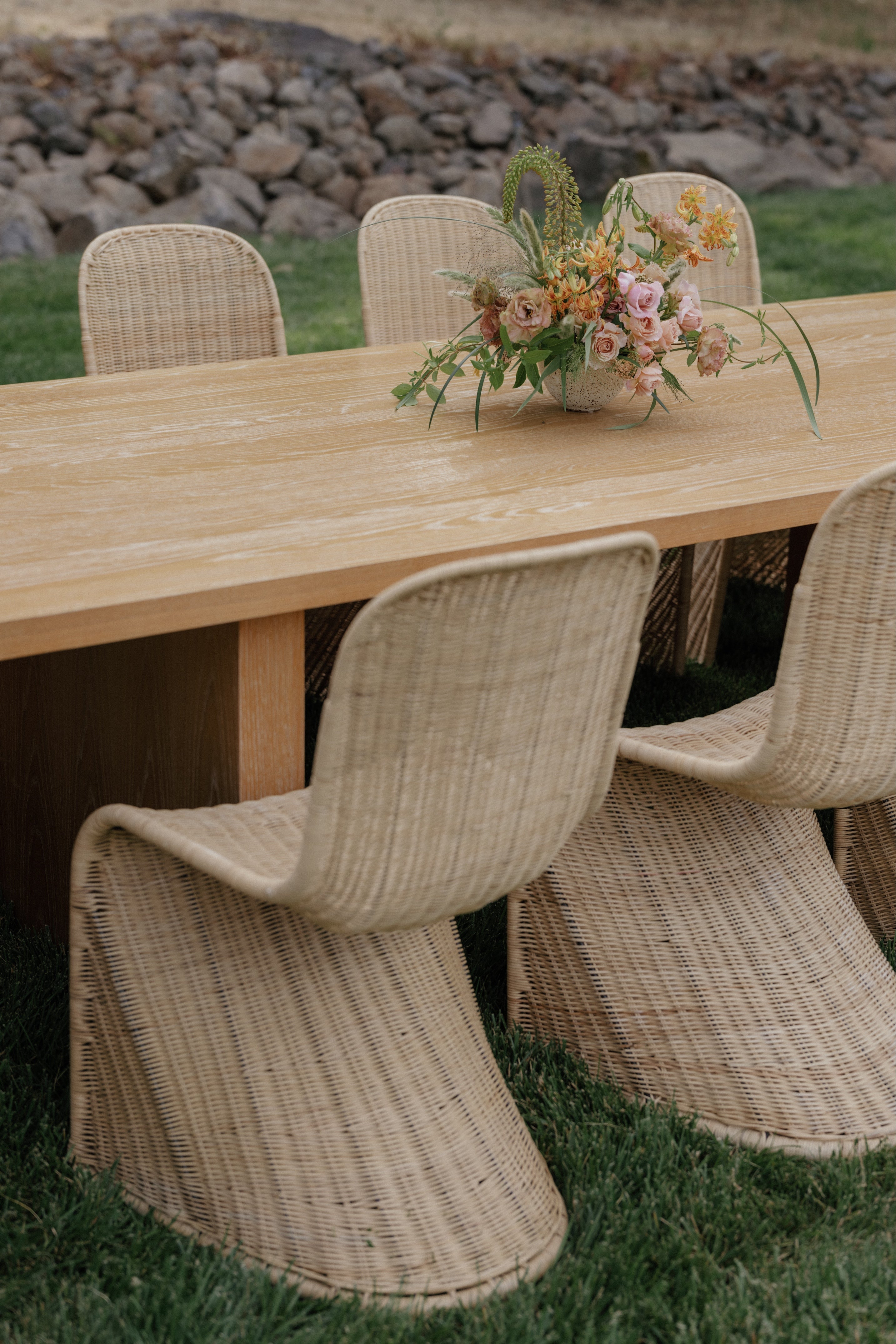 Natural rattan dining chair. Soft and natural dining or ceremony chairs perfect for any wedding or large event.