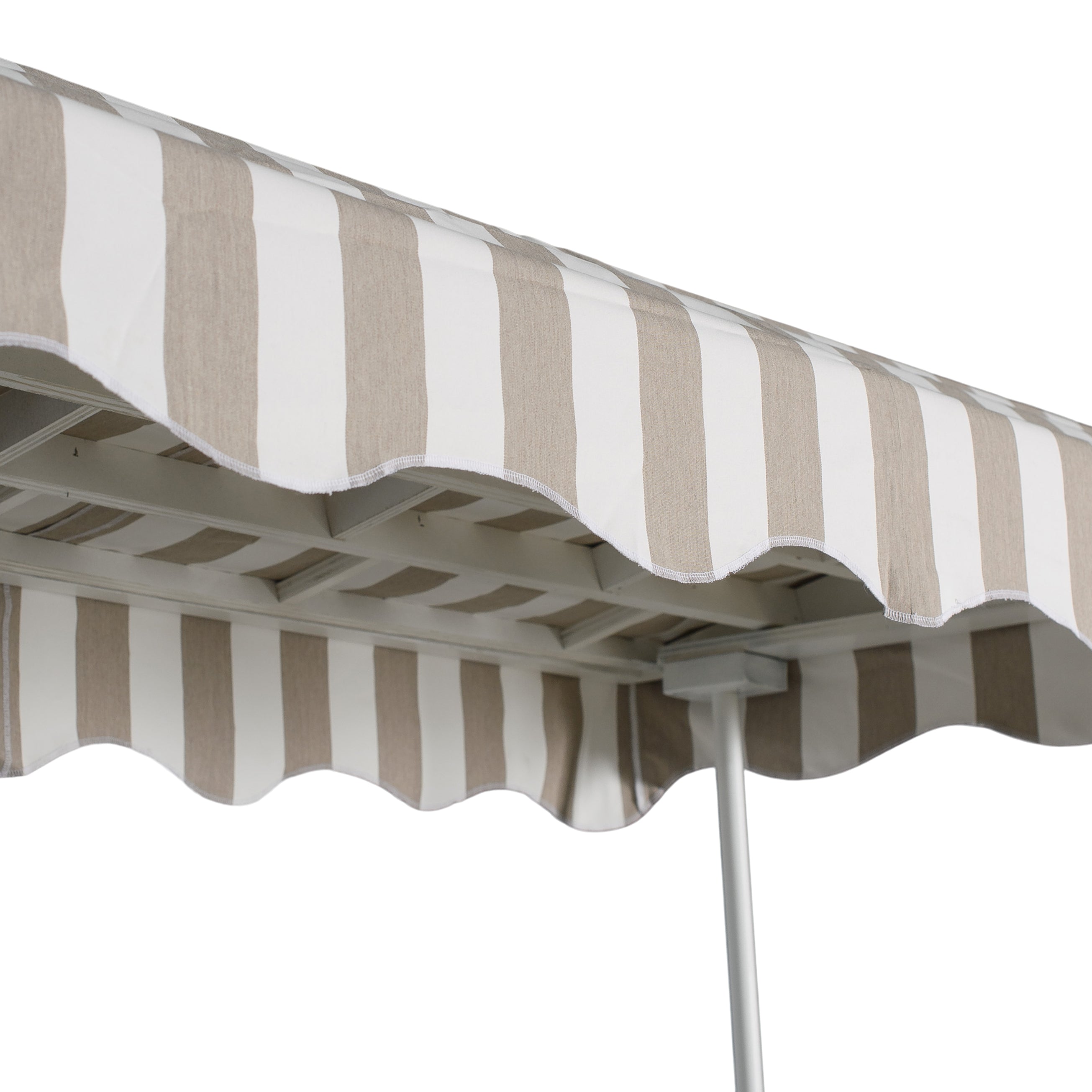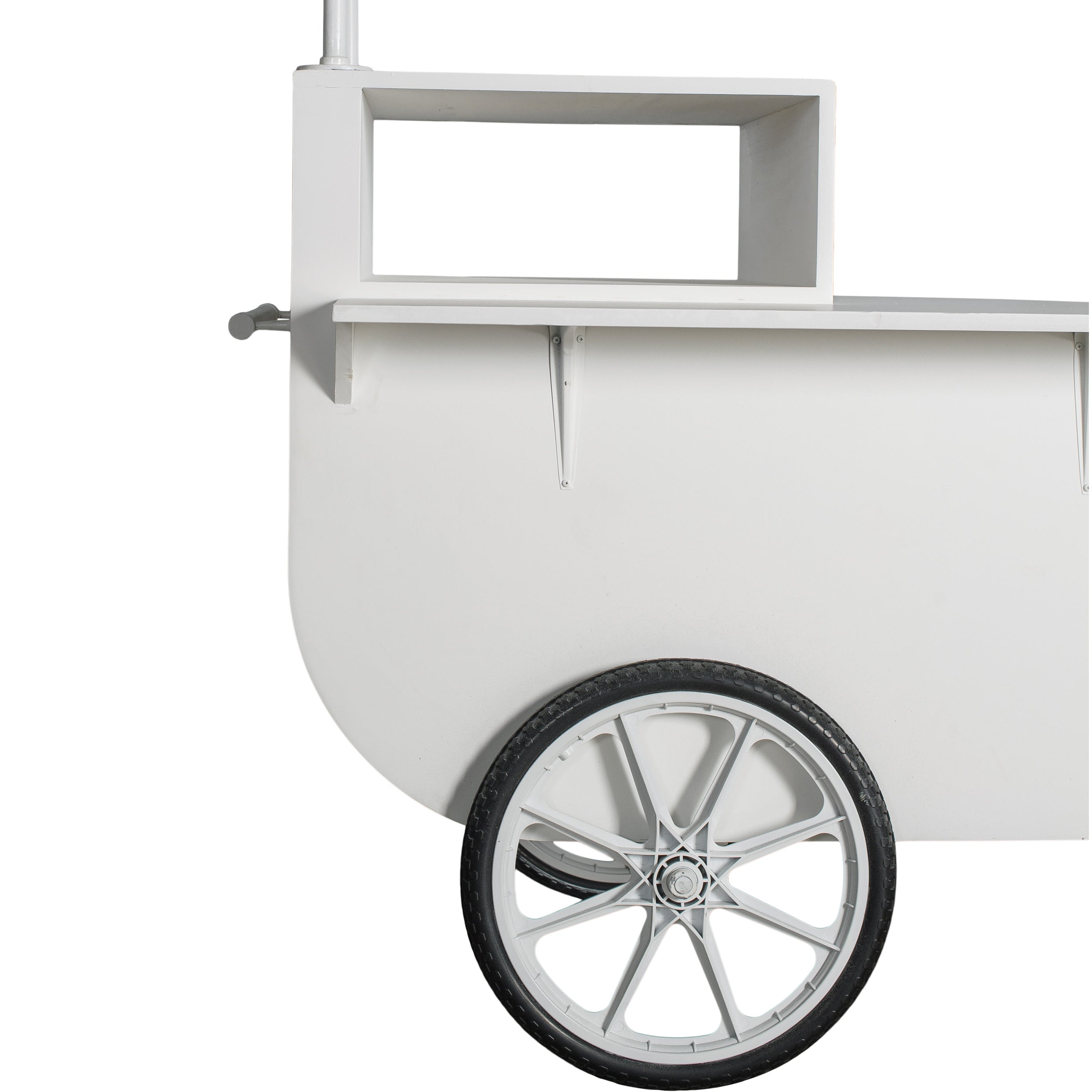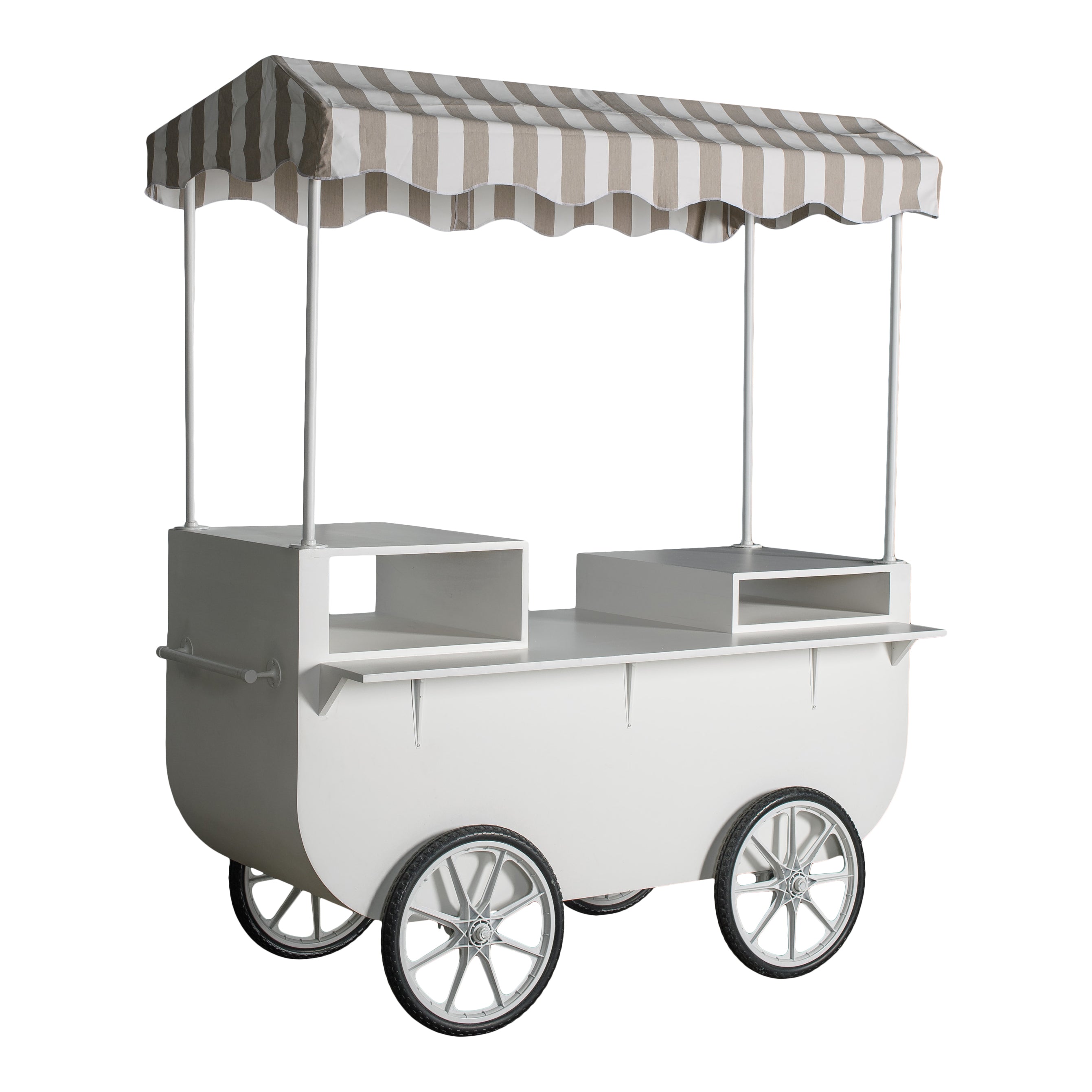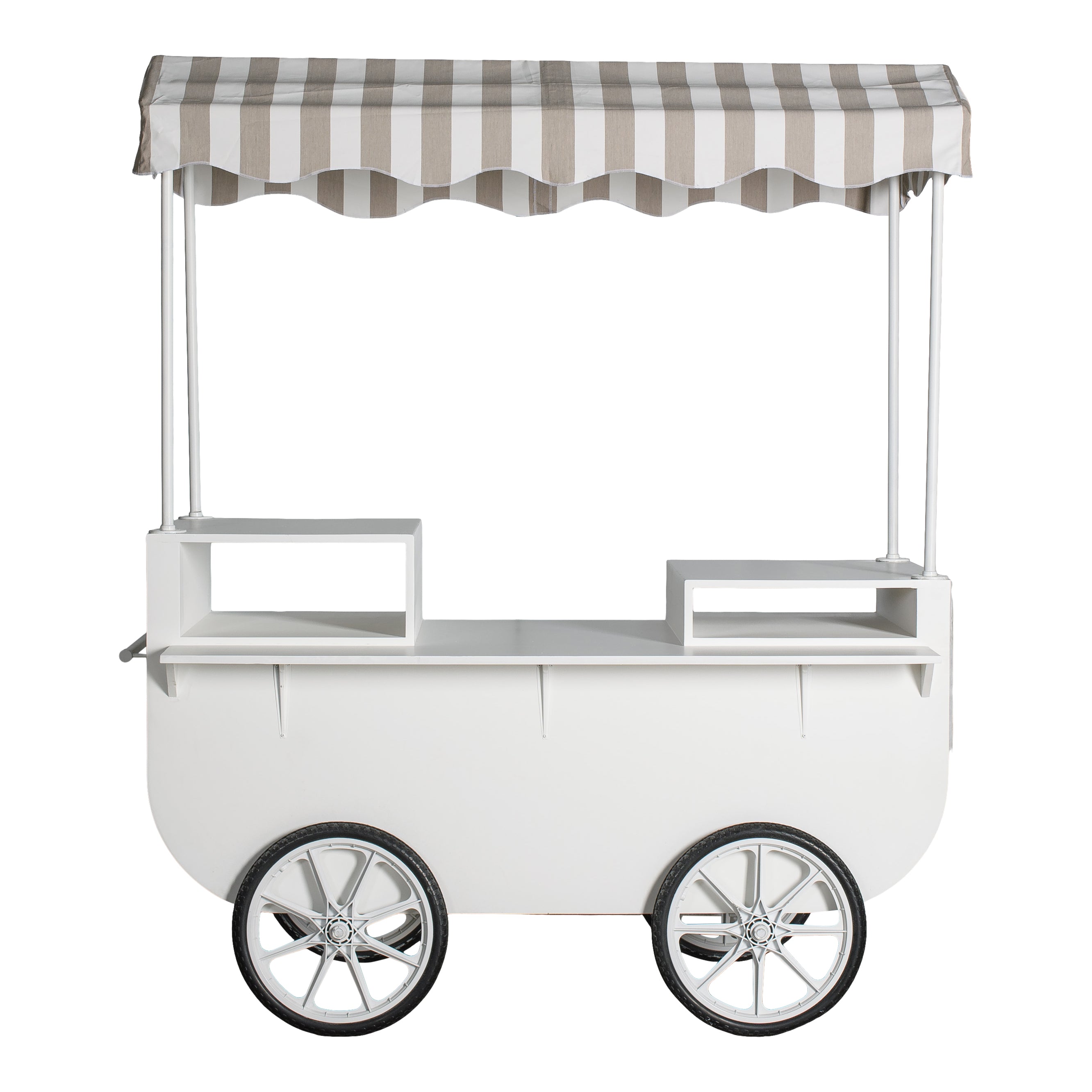 A white bar cart with a fresh, market-style silhouette, featuring a striped fabric canopy, open shelving, and rolling wheels. The clean finish and airy design make it a standout serving station for cocktails, desserts, or interactive food moments.