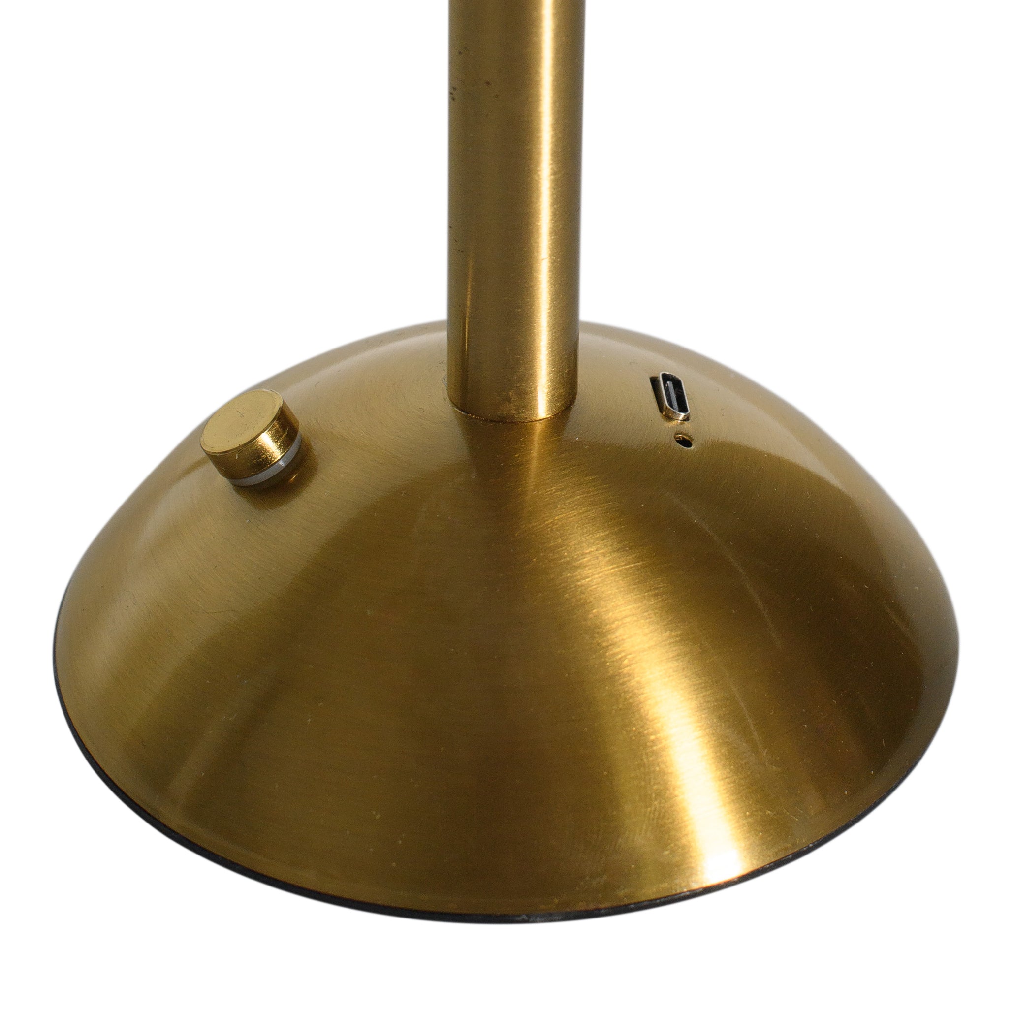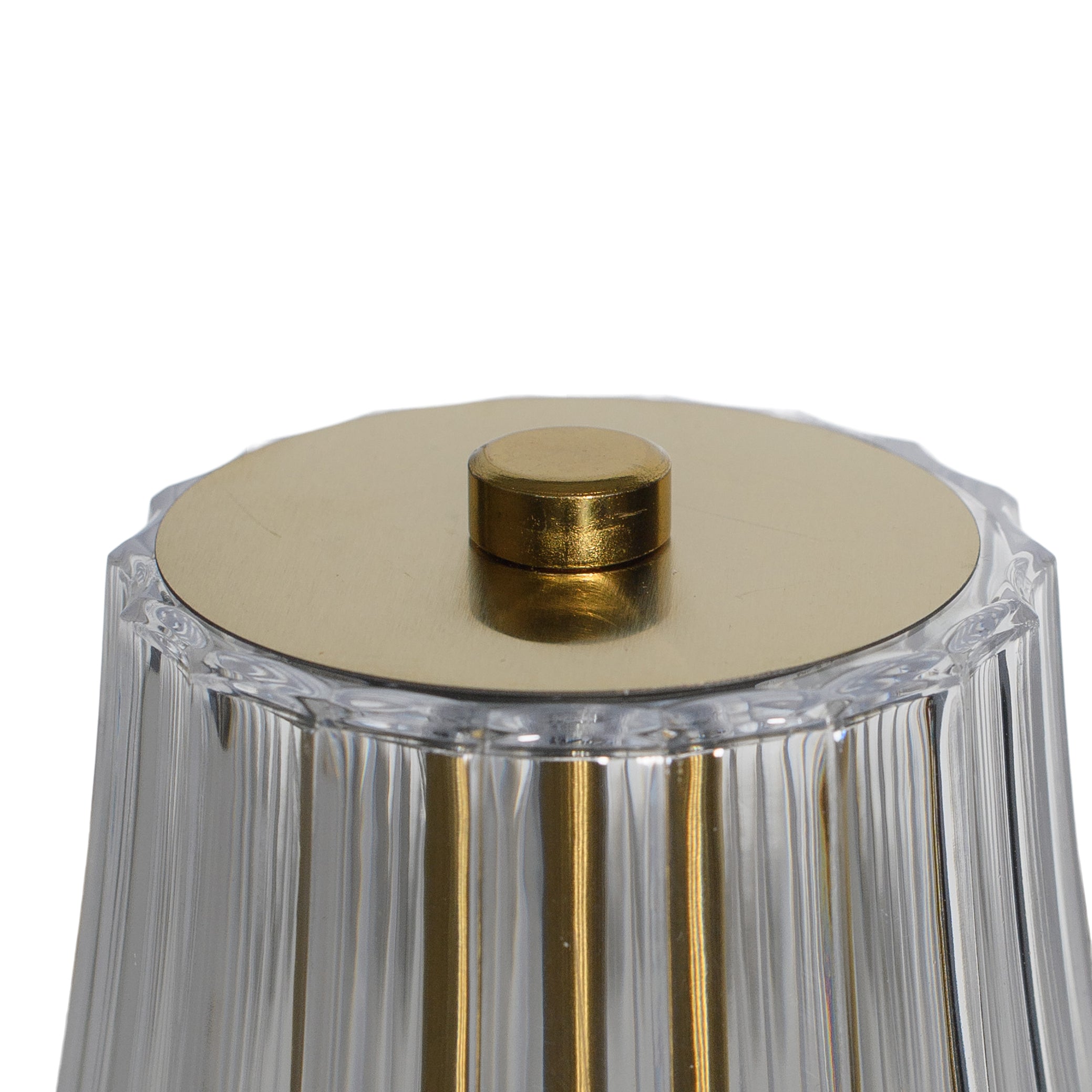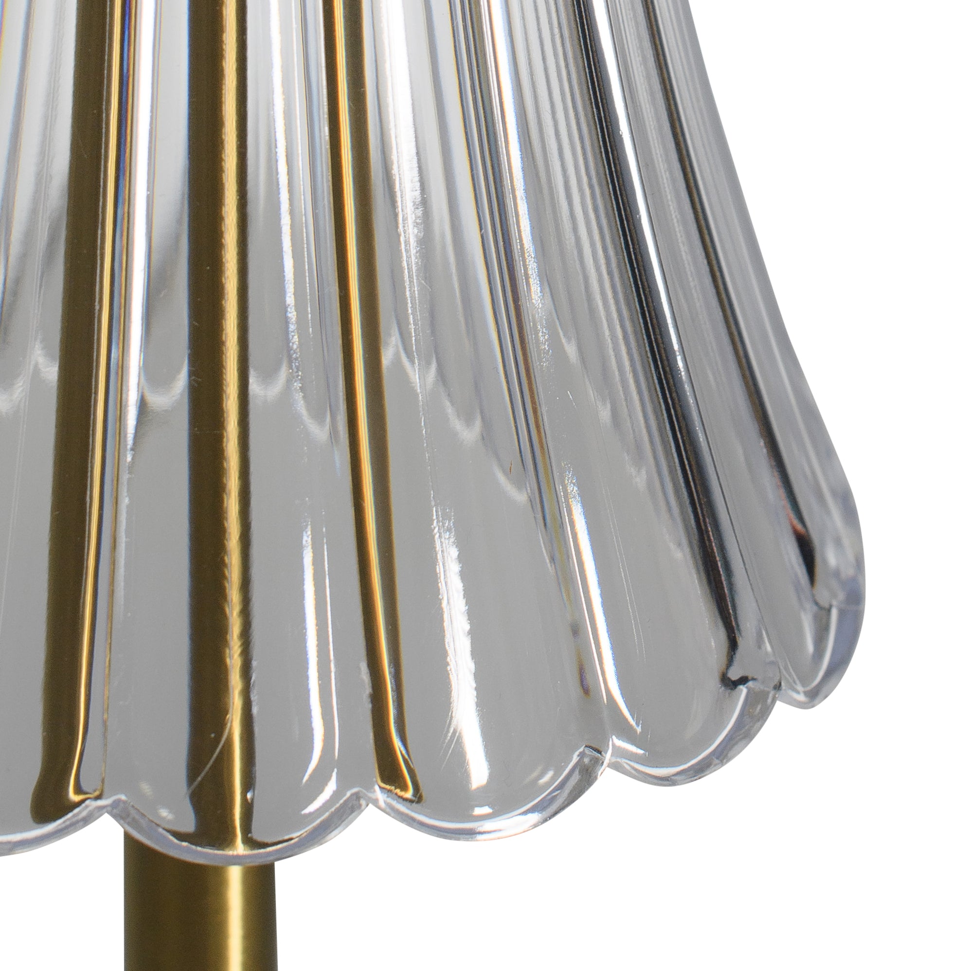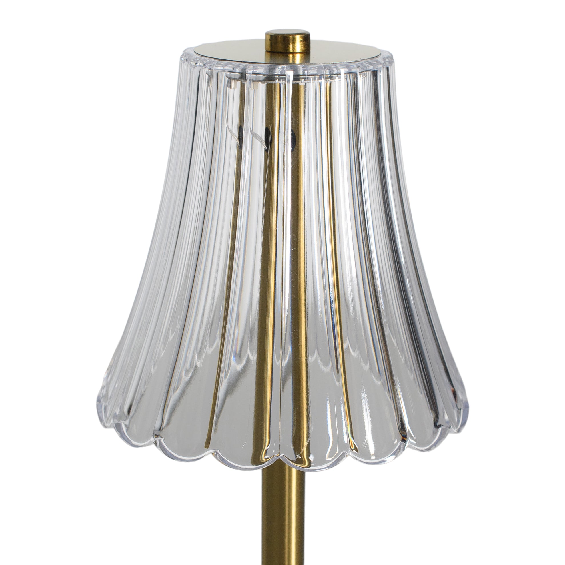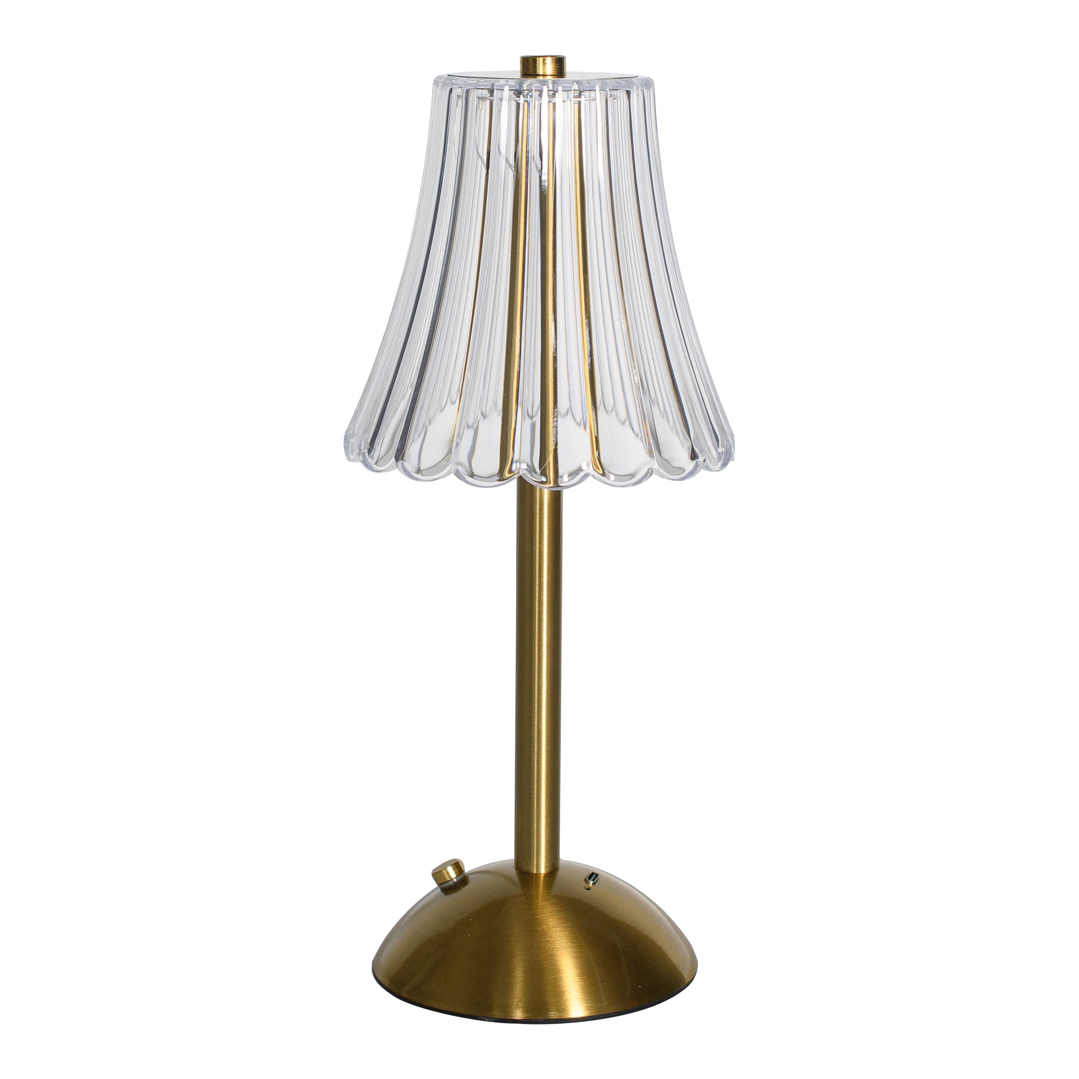 A brass table lamp with a slim column base and a fluted clear shade that softly diffuses light. The smooth metal finish pairs with the ribbed silhouette for a clean, considered look that works well on cocktail tables, bars, or lounge vignettes. This lamp is functional and rechargeable, offering both visual interest and practical lighting for event use.