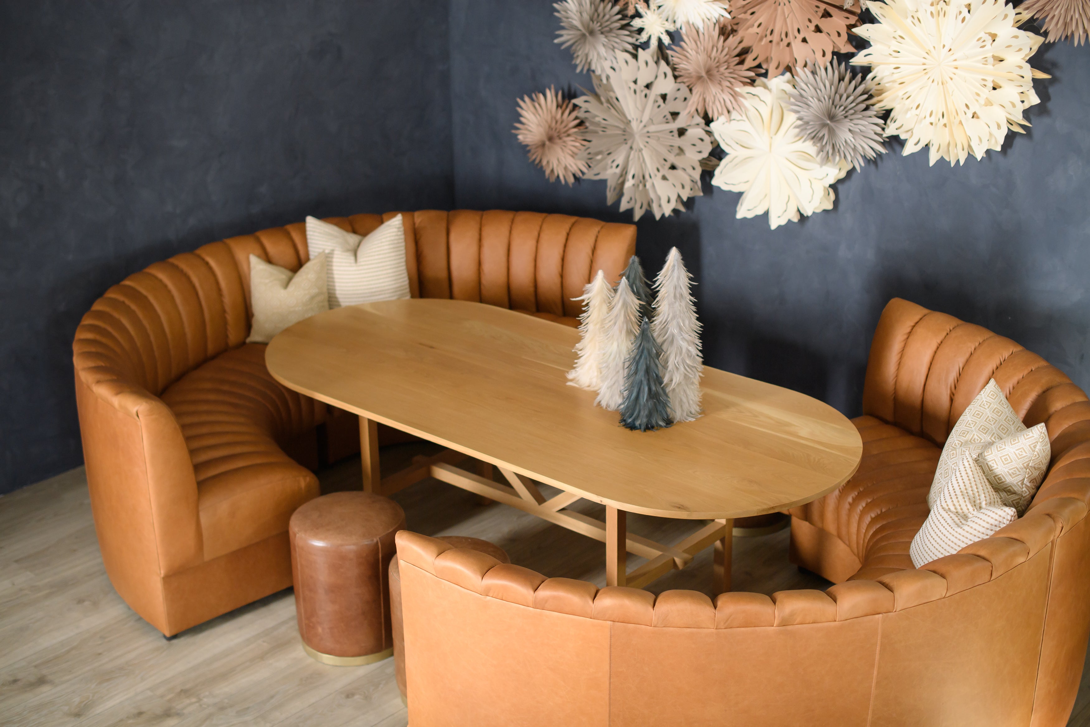 Custom made oak dining table with rounded ends and a cross base. Simple yet chic dining table for any wedding or curated event.