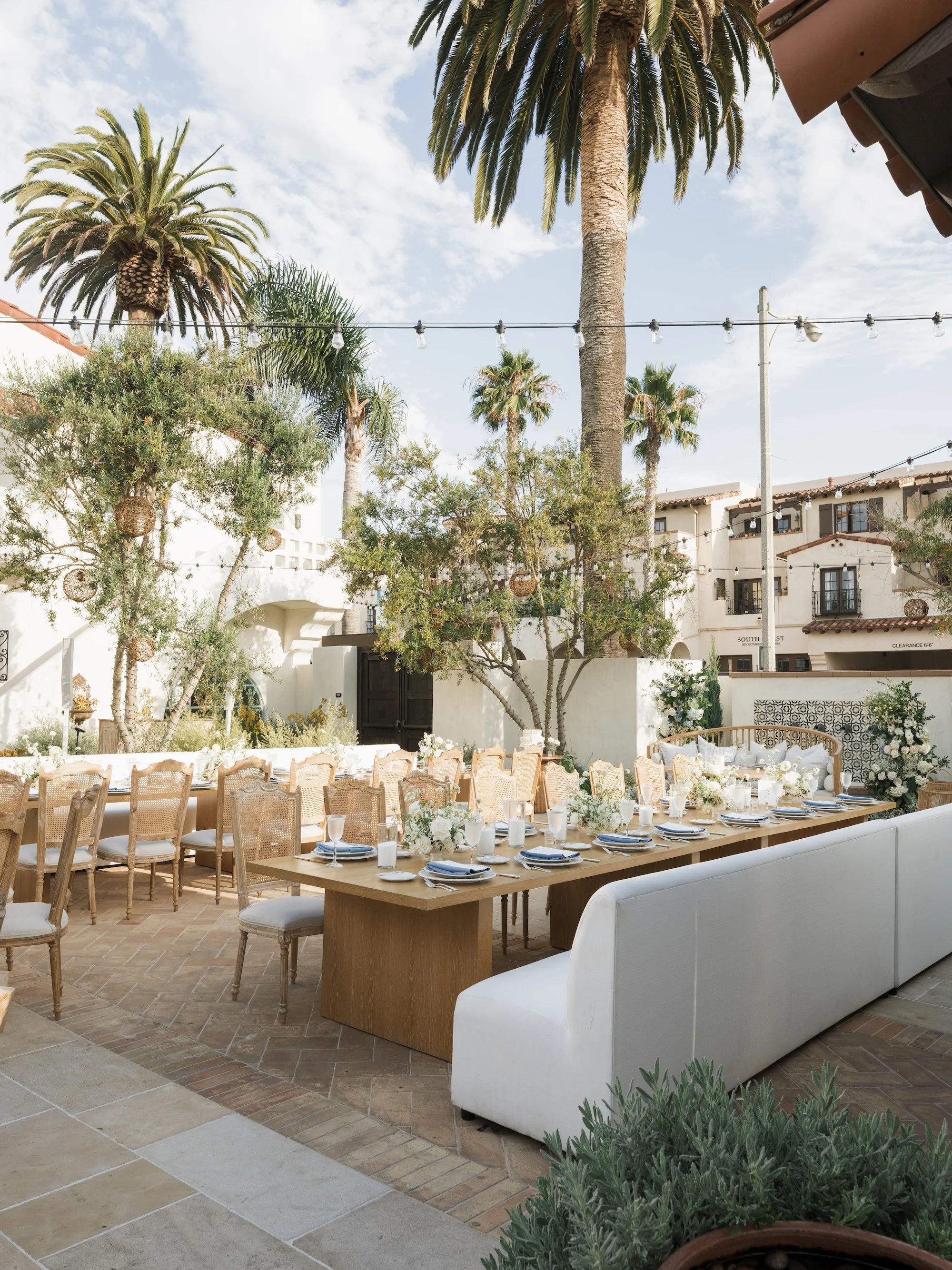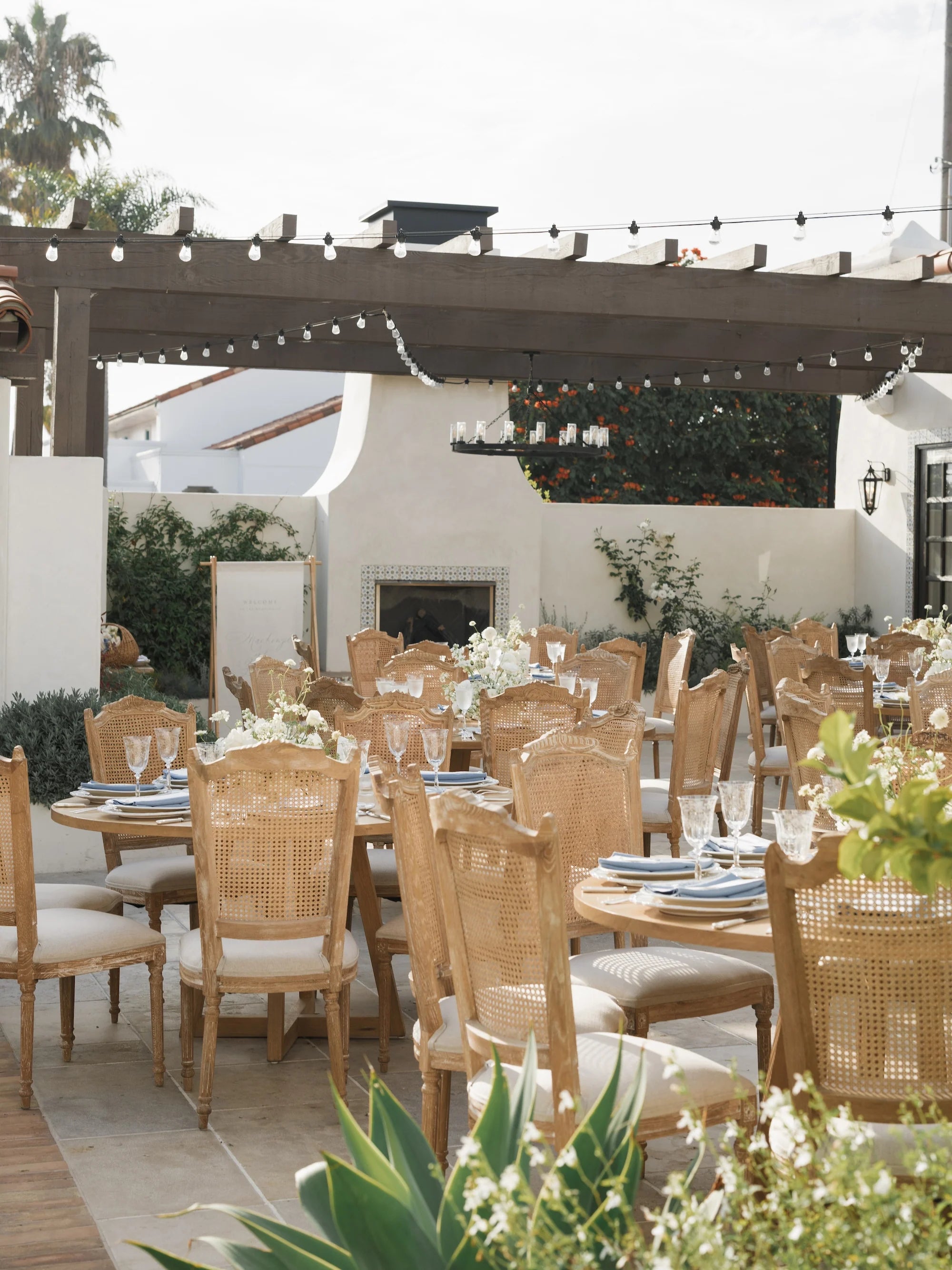 Wooden dining chair with a neutral upholstered seat, a woven cane back, and carved detailing. Great for wedding ceremony seating and dining seating at other large events.