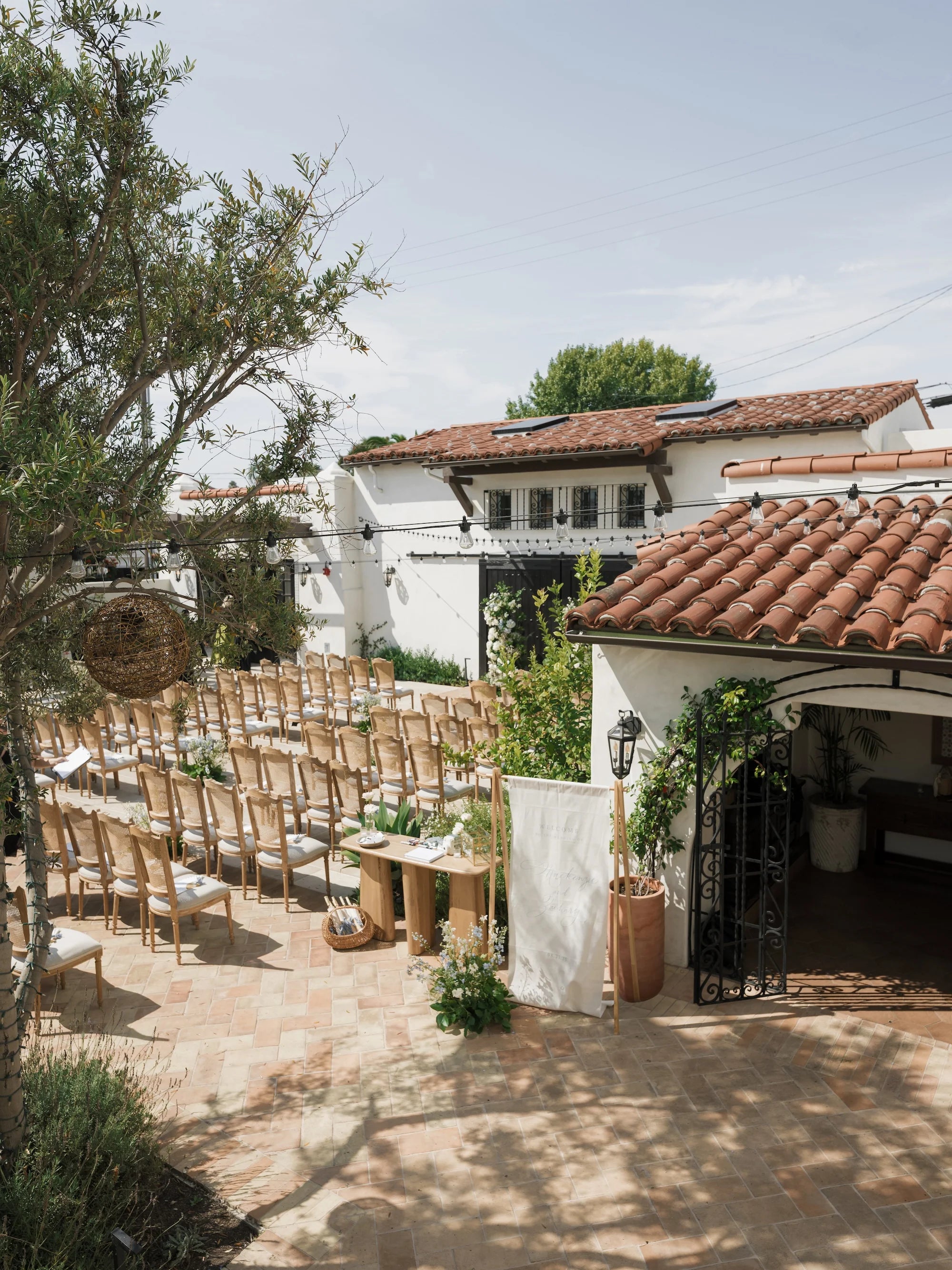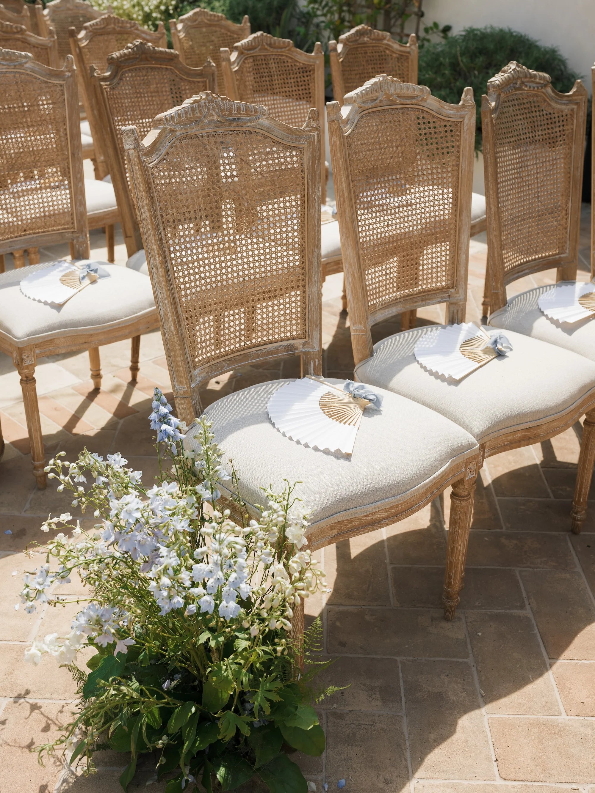 Wooden dining chair with a neutral upholstered seat, a woven cane back, and carved detailing. Great for wedding ceremony seating and dining seating at other large events. Seat height: 19" Dimensions: 19.5 x 19 x 42