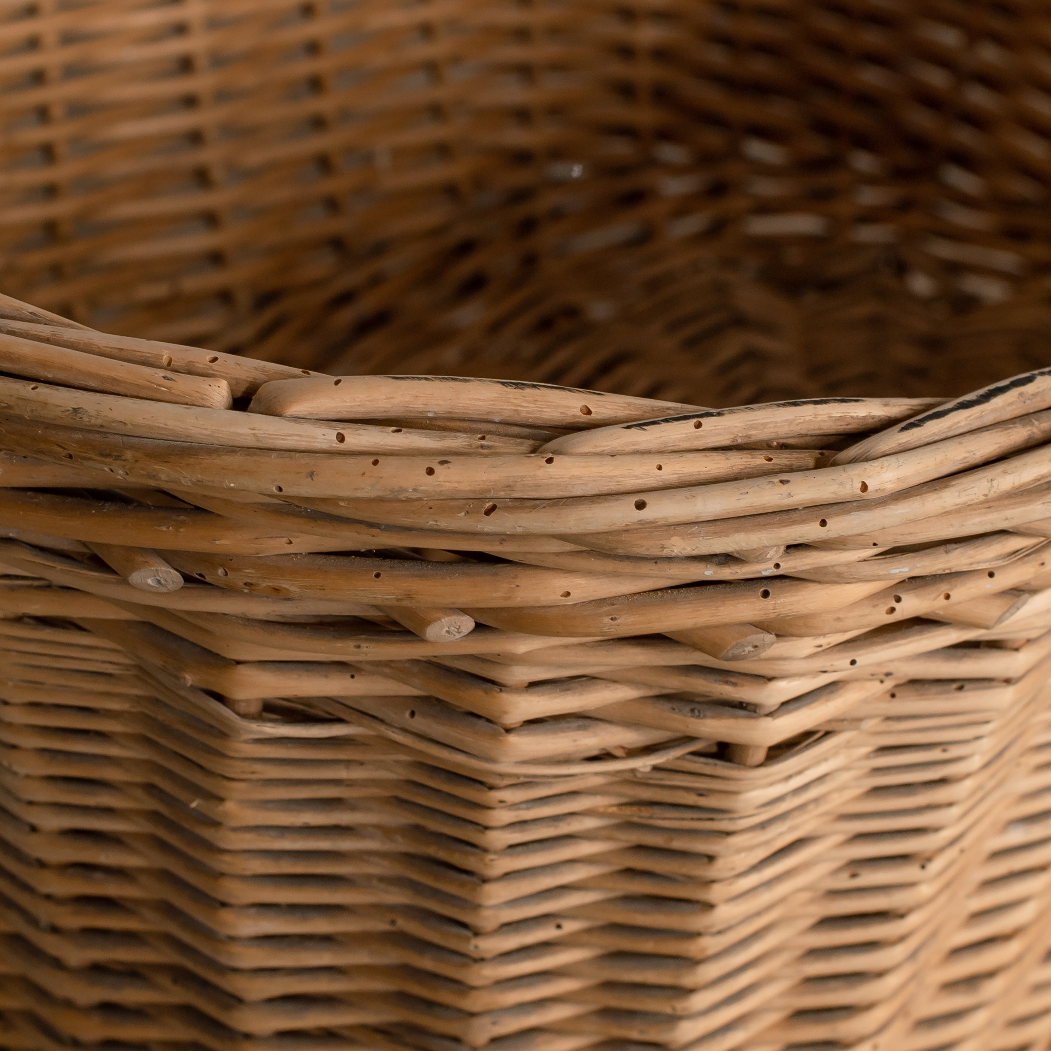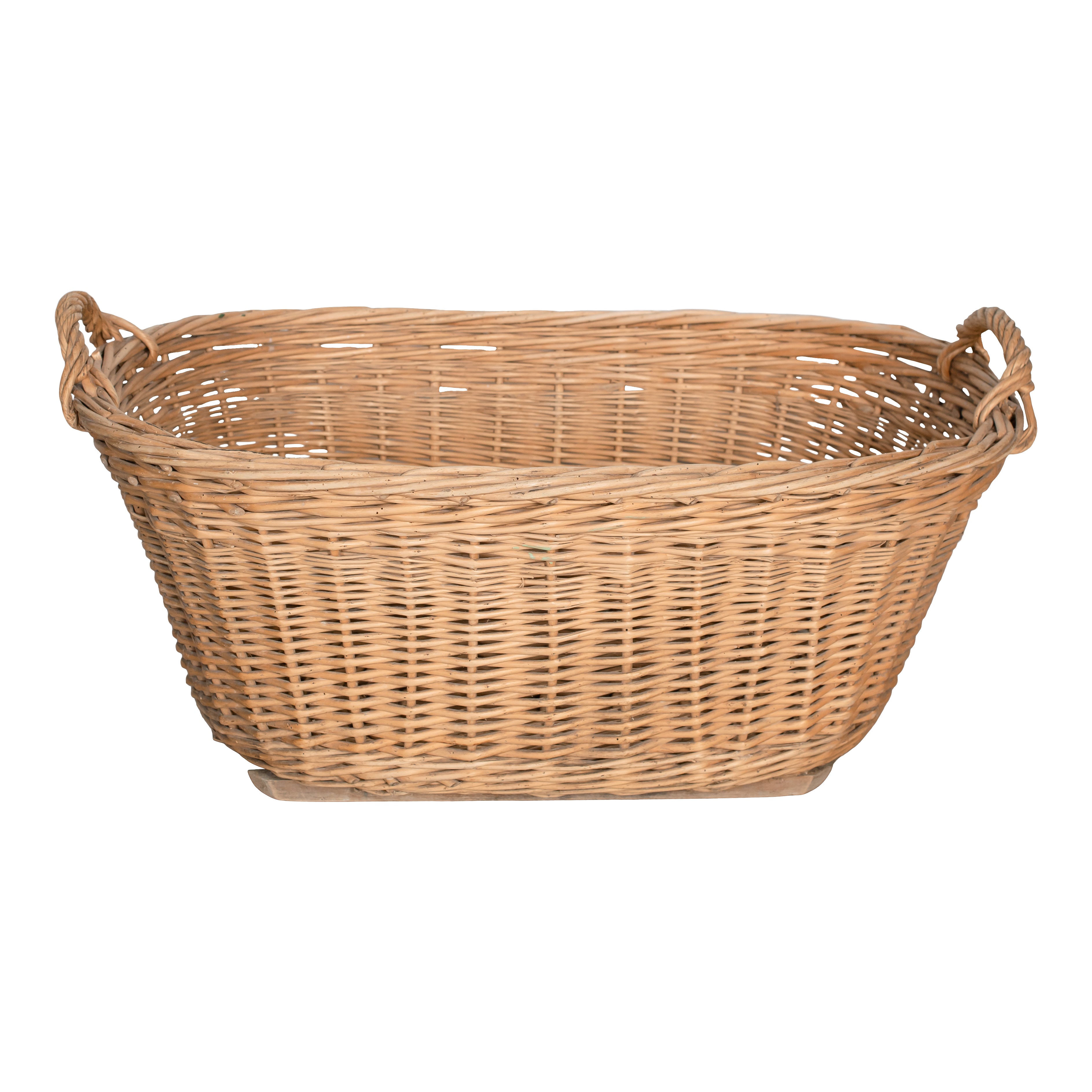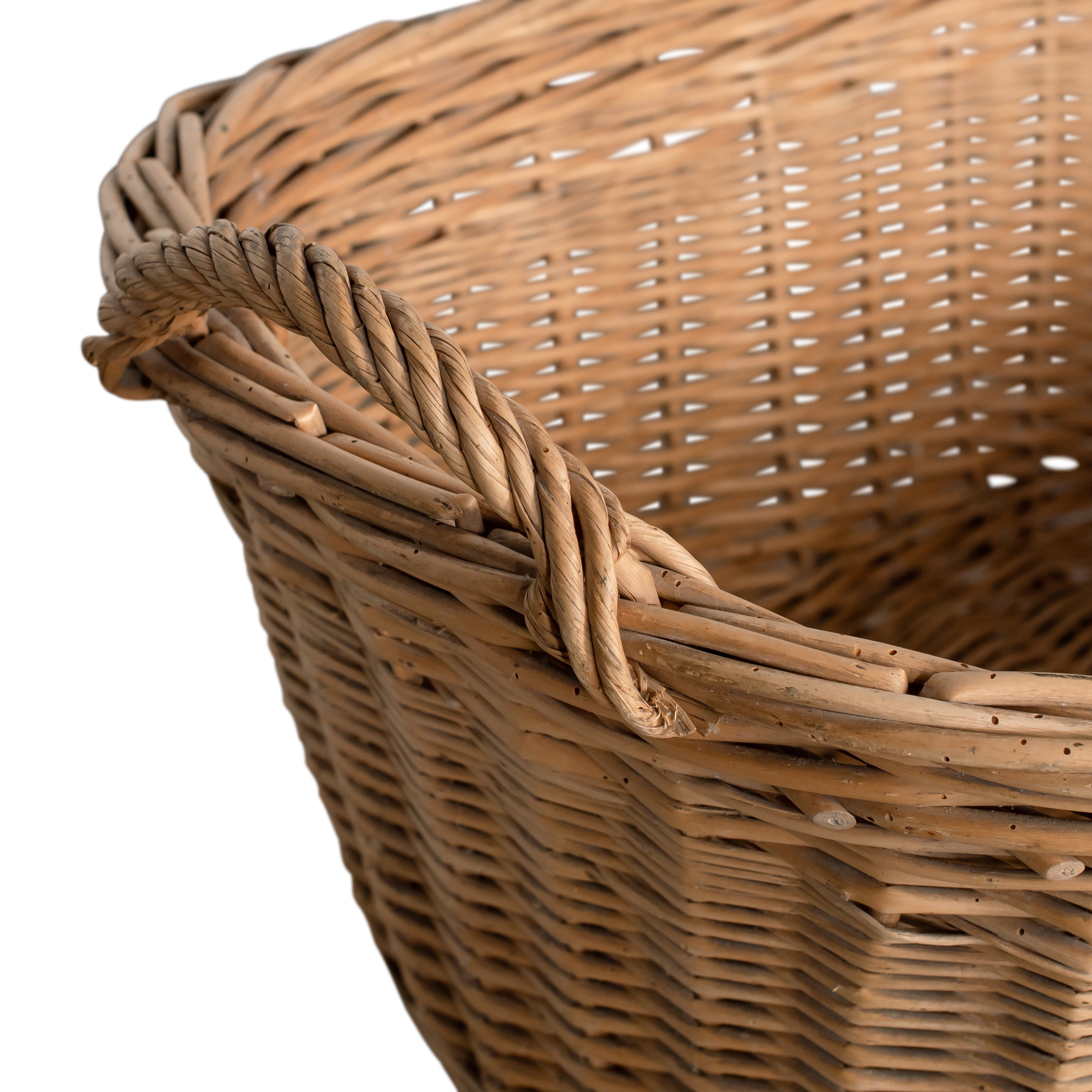 A vintage oval woven basket crafted in natural rattan with integrated side handles and a clean, structured shape. The tight weave and warm tone bring texture and an effortless, natural look to styling. Ideal for holding blankets, florals, favors, or layered décor elements.