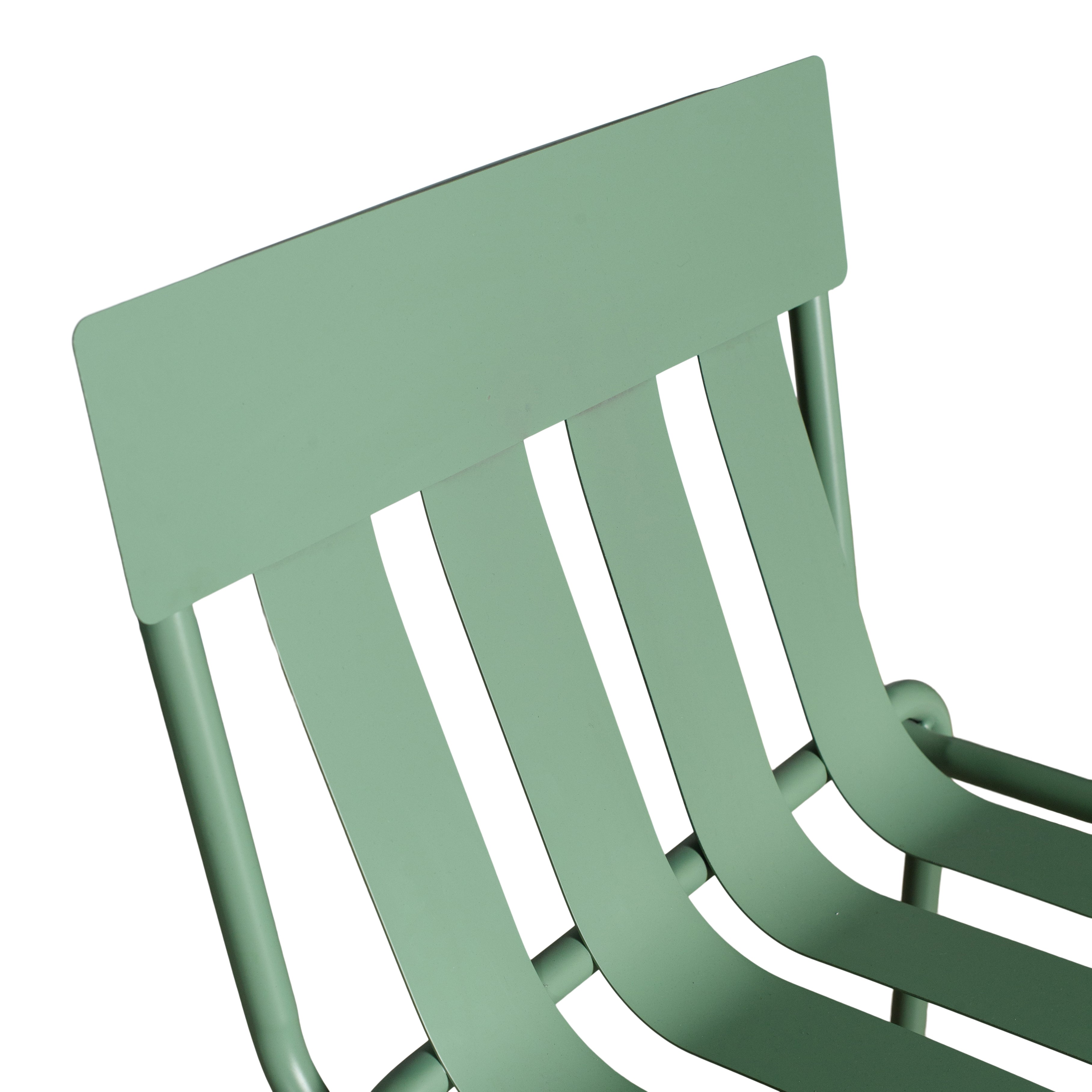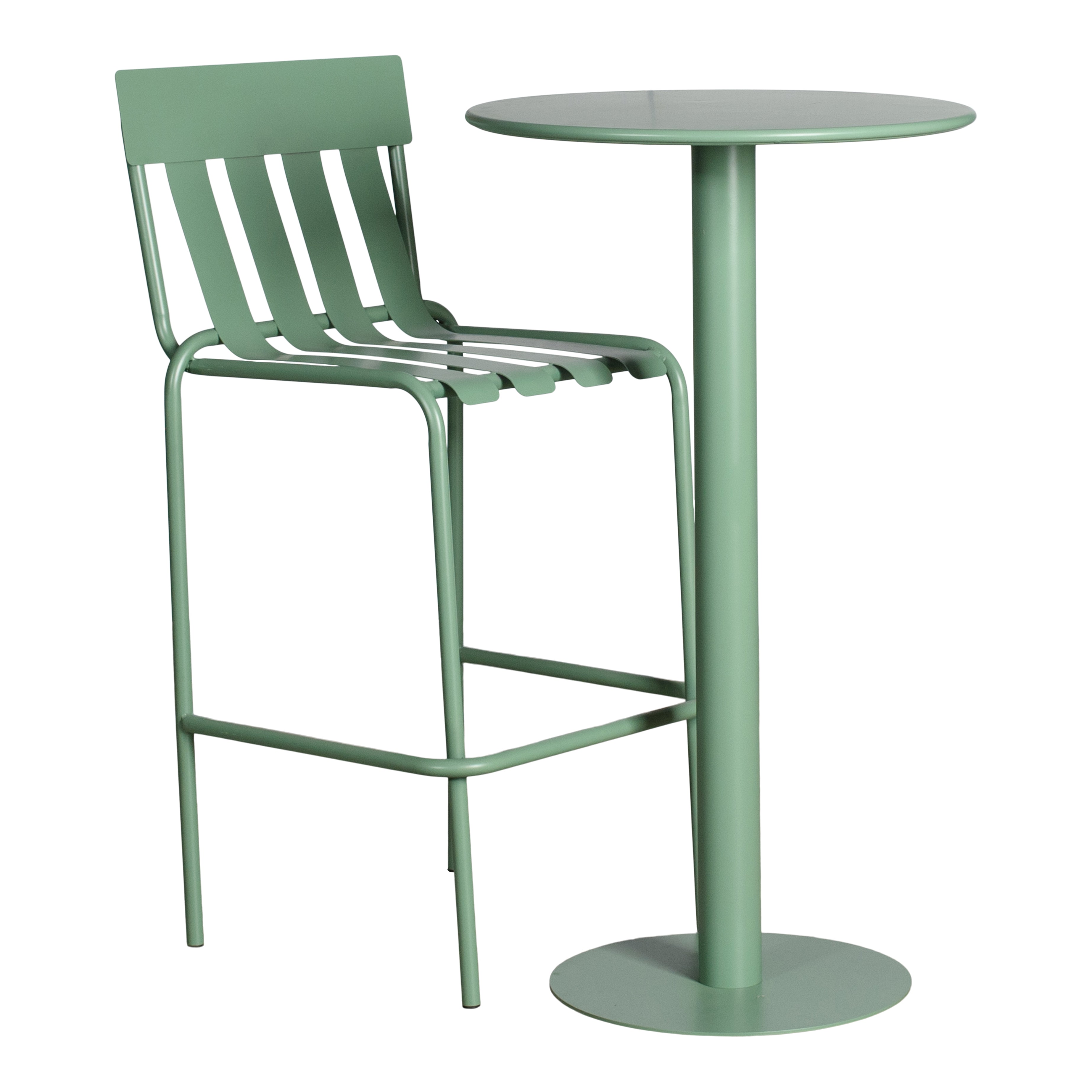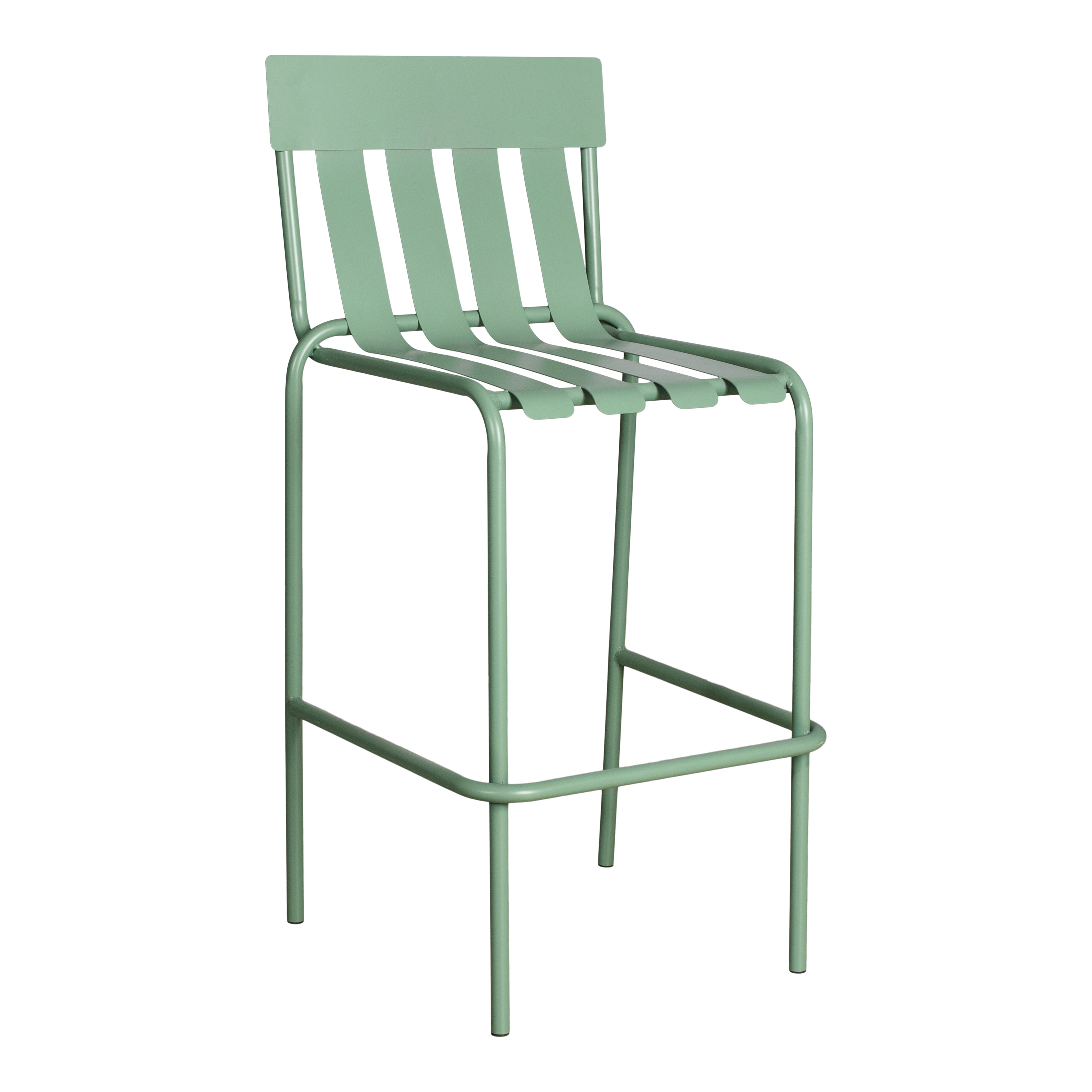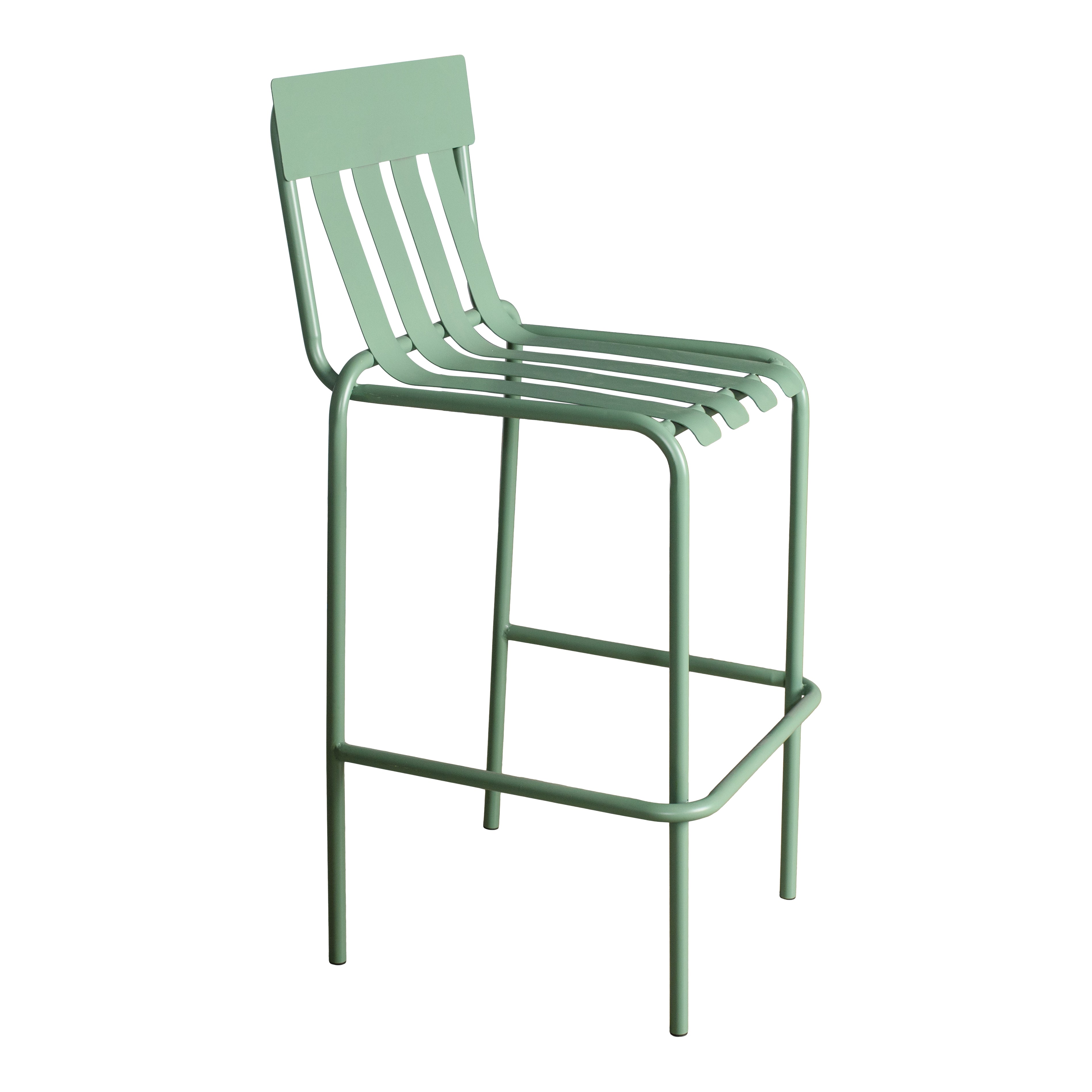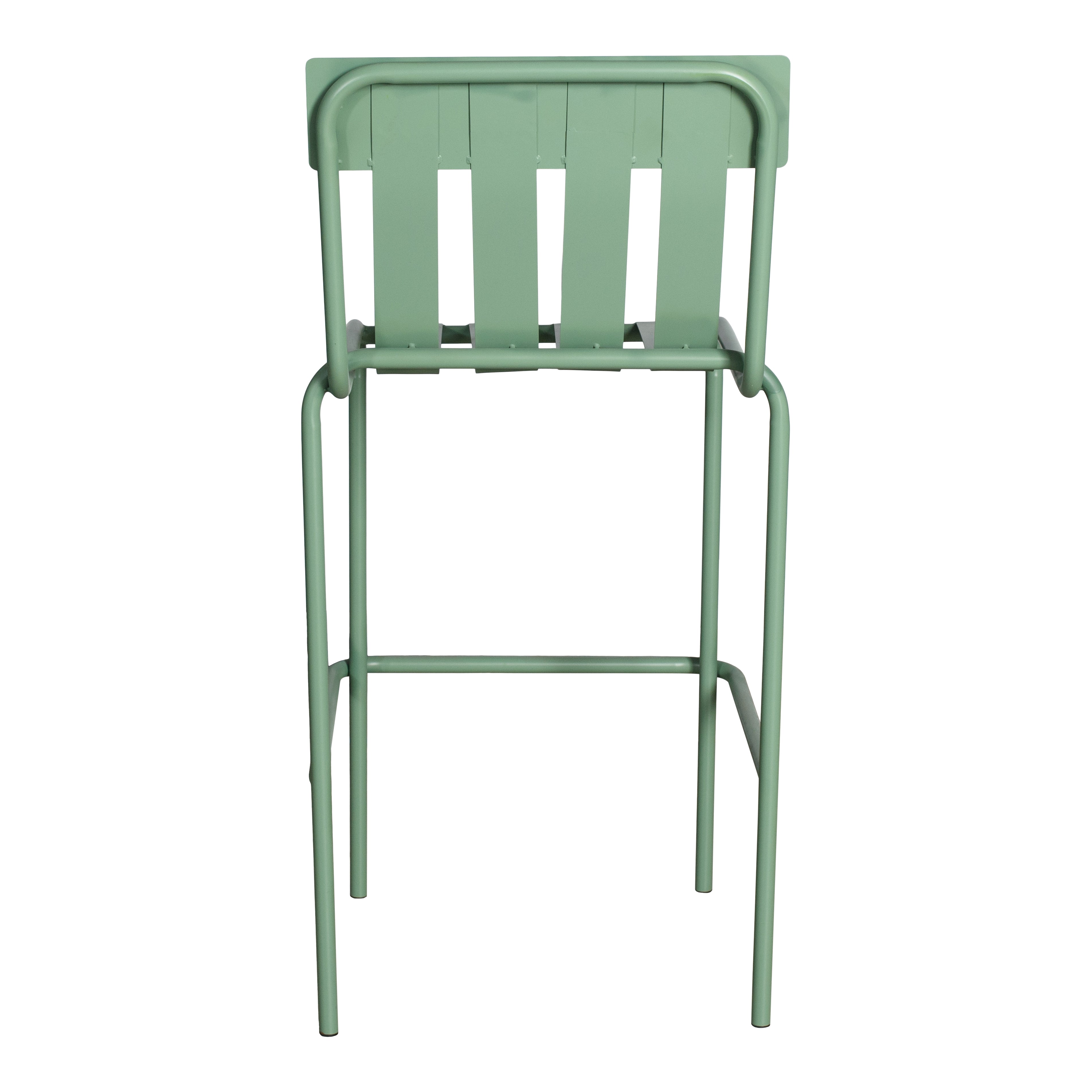 A metal bar stool with a slatted seat and back, finished in a soft green tone. The slim, streamlined frame and footrest detail give it a relaxed, café-inspired feel that works well with our cocktail tables.