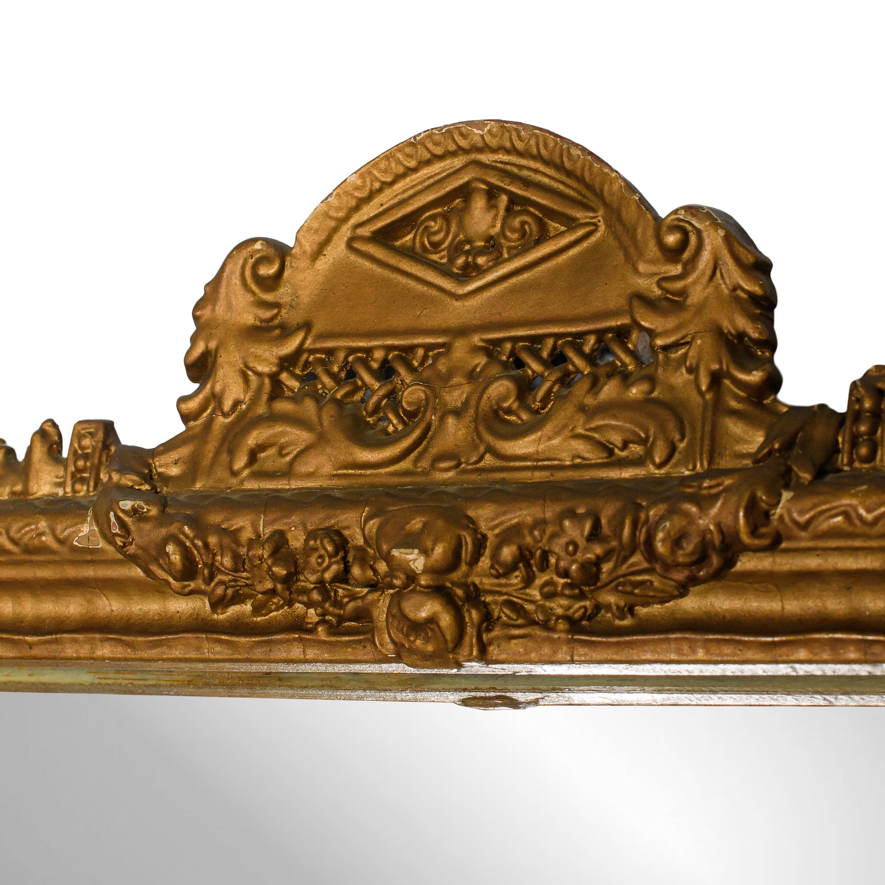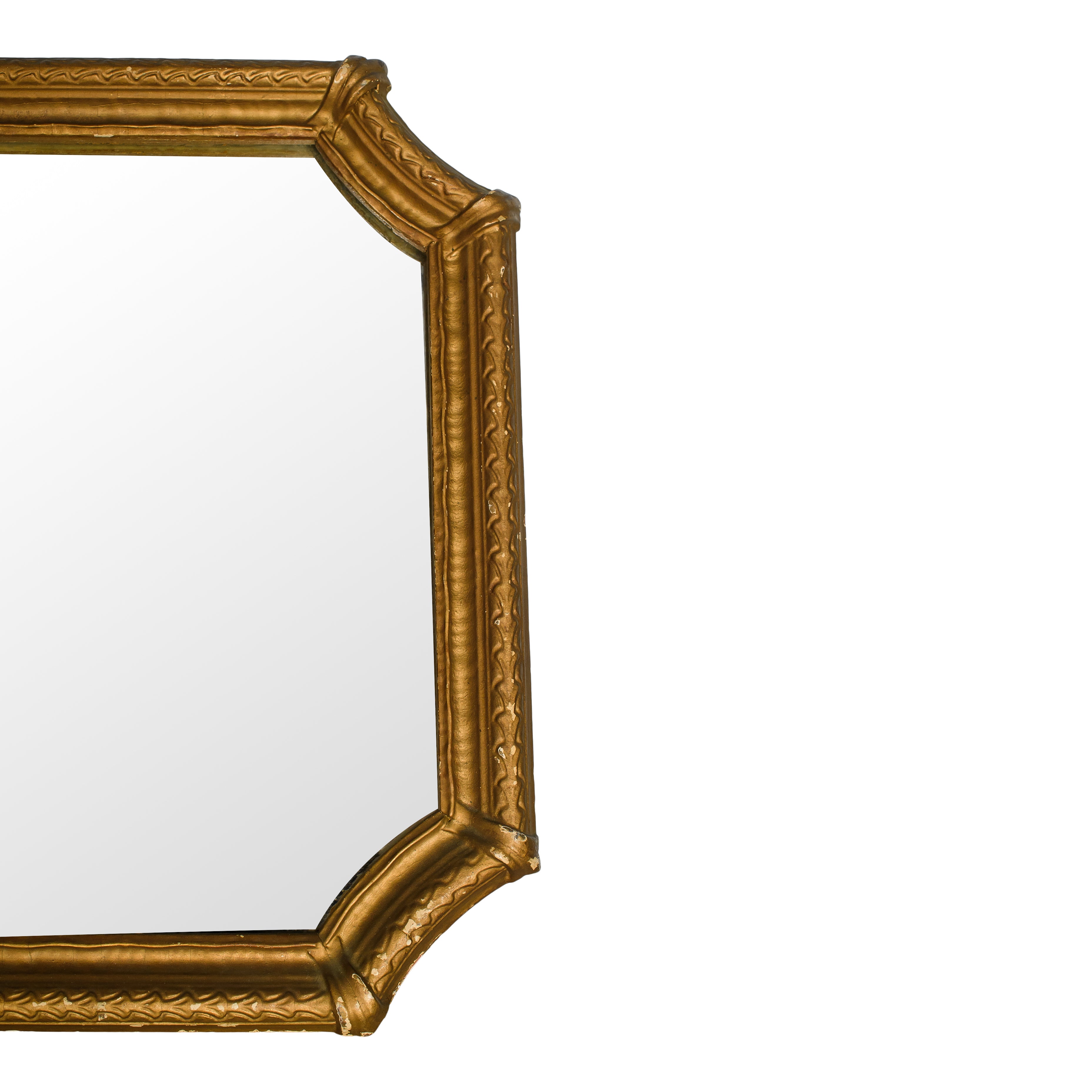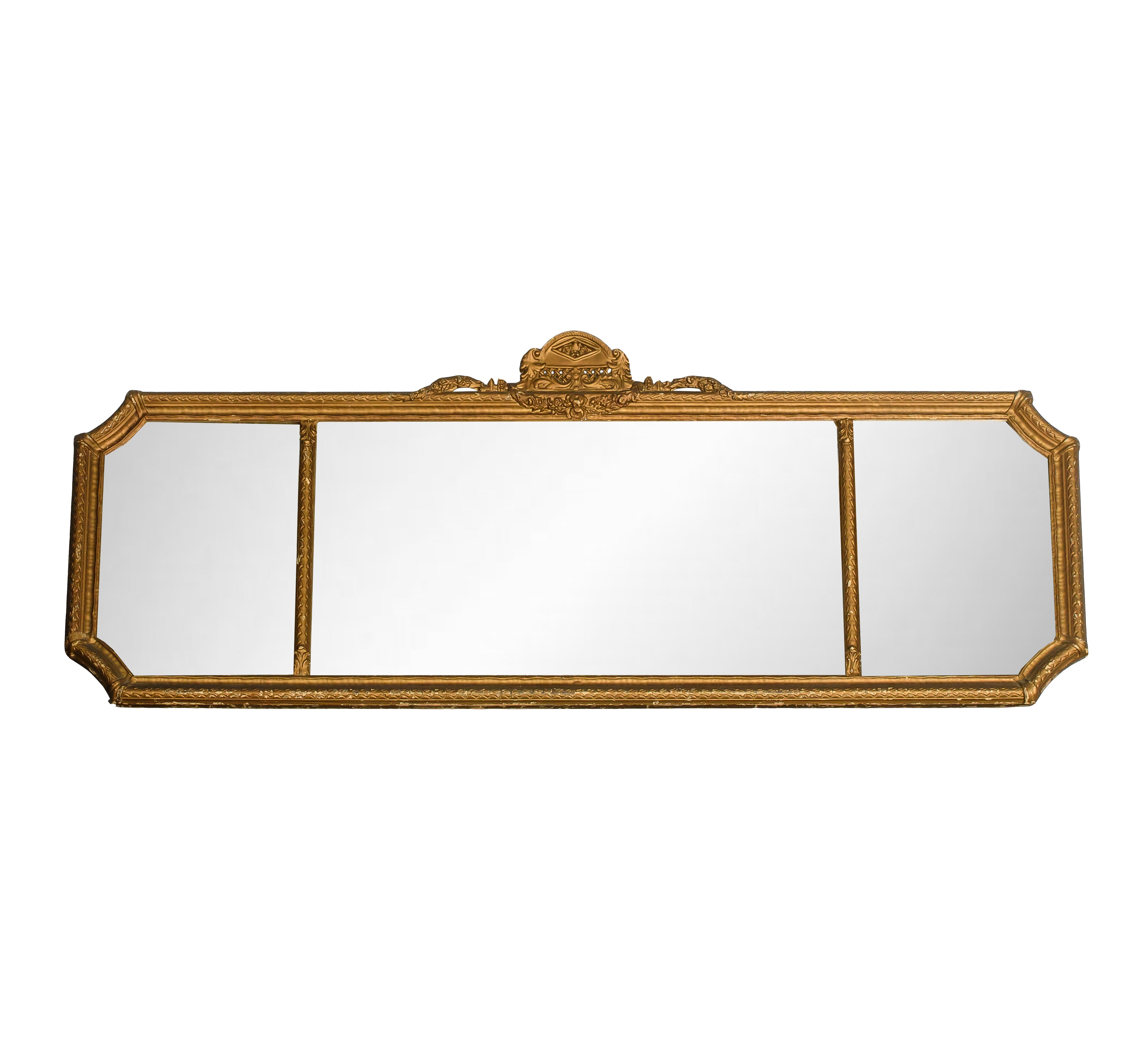 A striking statement piece, this elongated vintage triple-panel mirror features a beautifully detailed gilt frame with scalloped corners and an ornate crest at the top. The wide horizontal silhouette makes it ideal for placing above a console, mantel, or dresser, bringing both light and architectural presence to any room.
