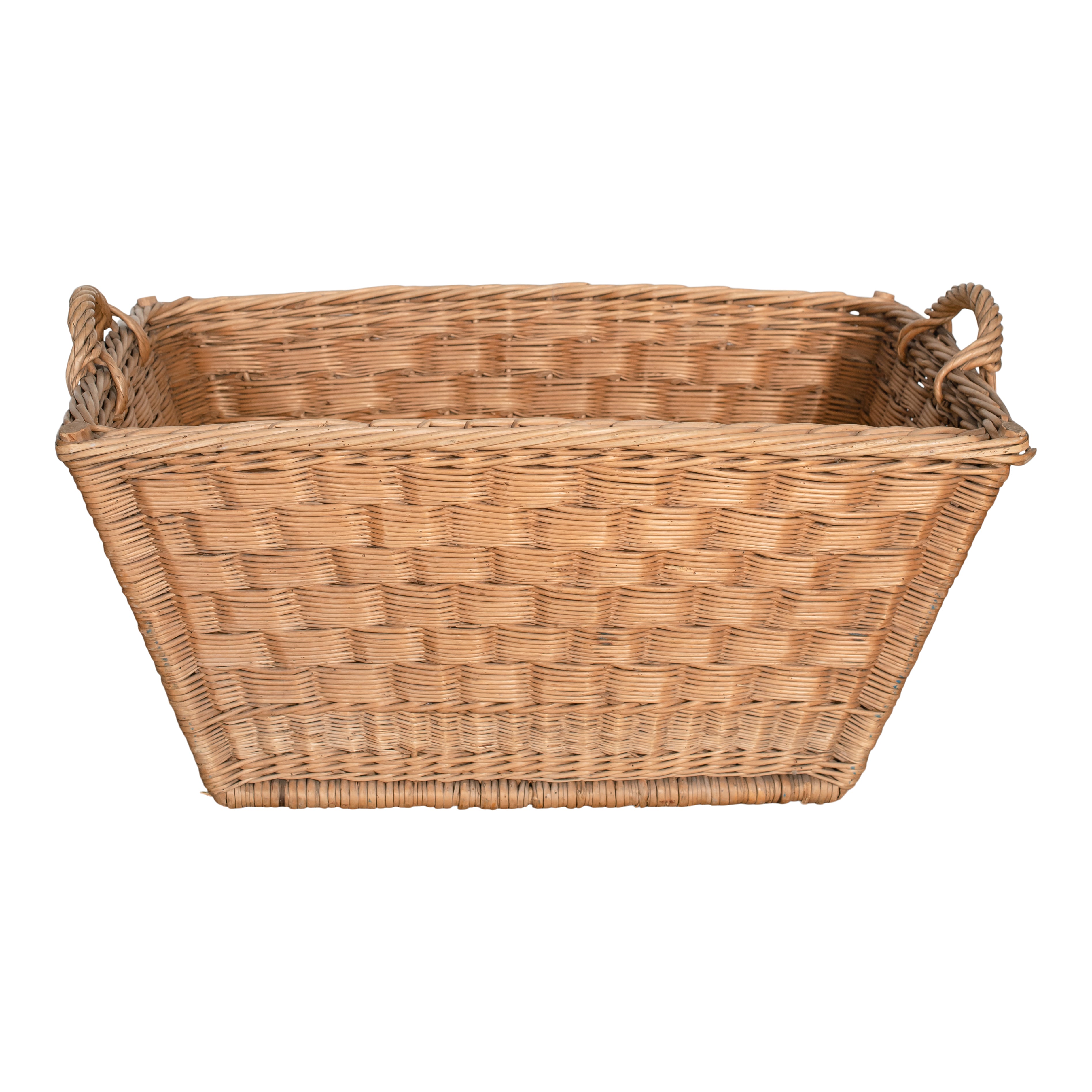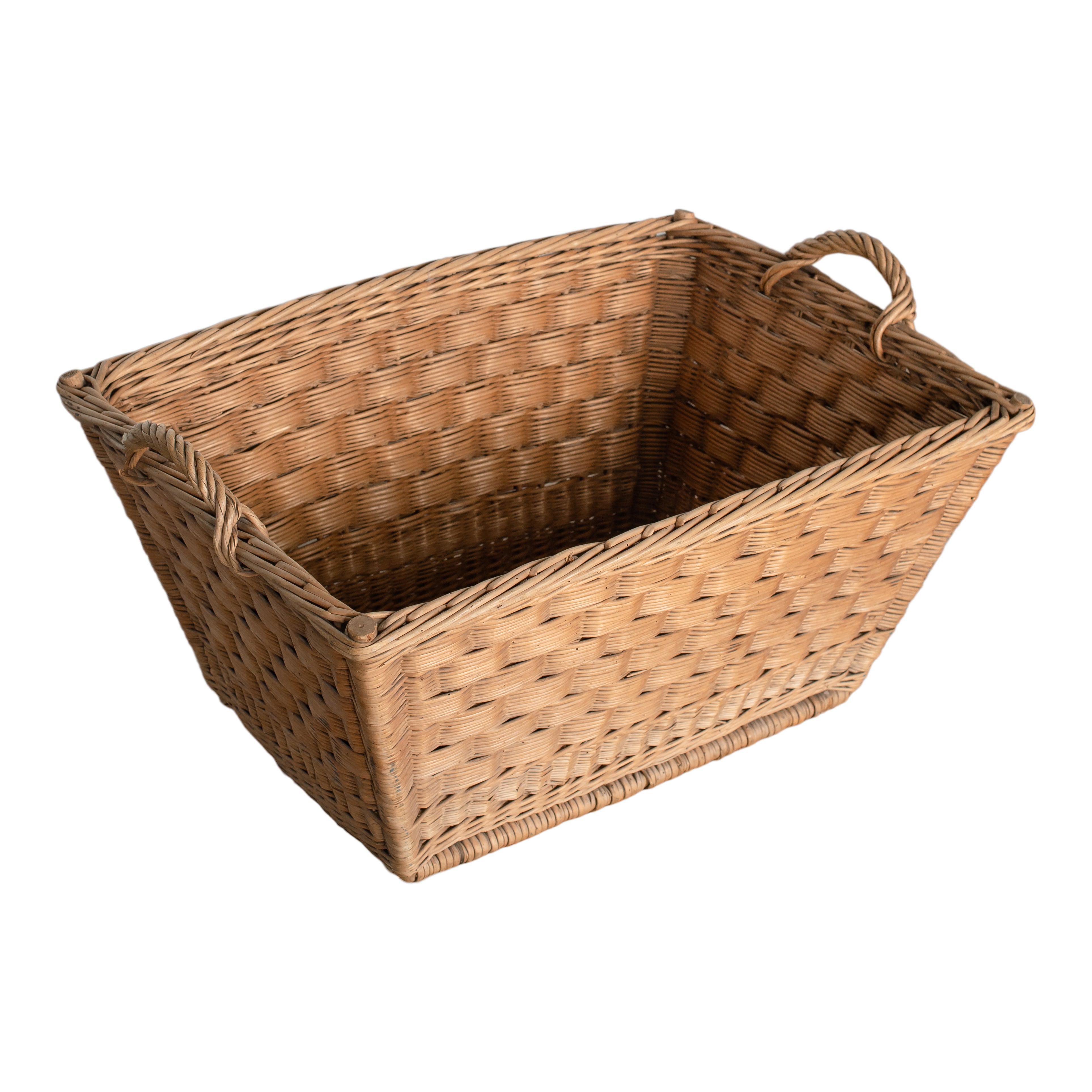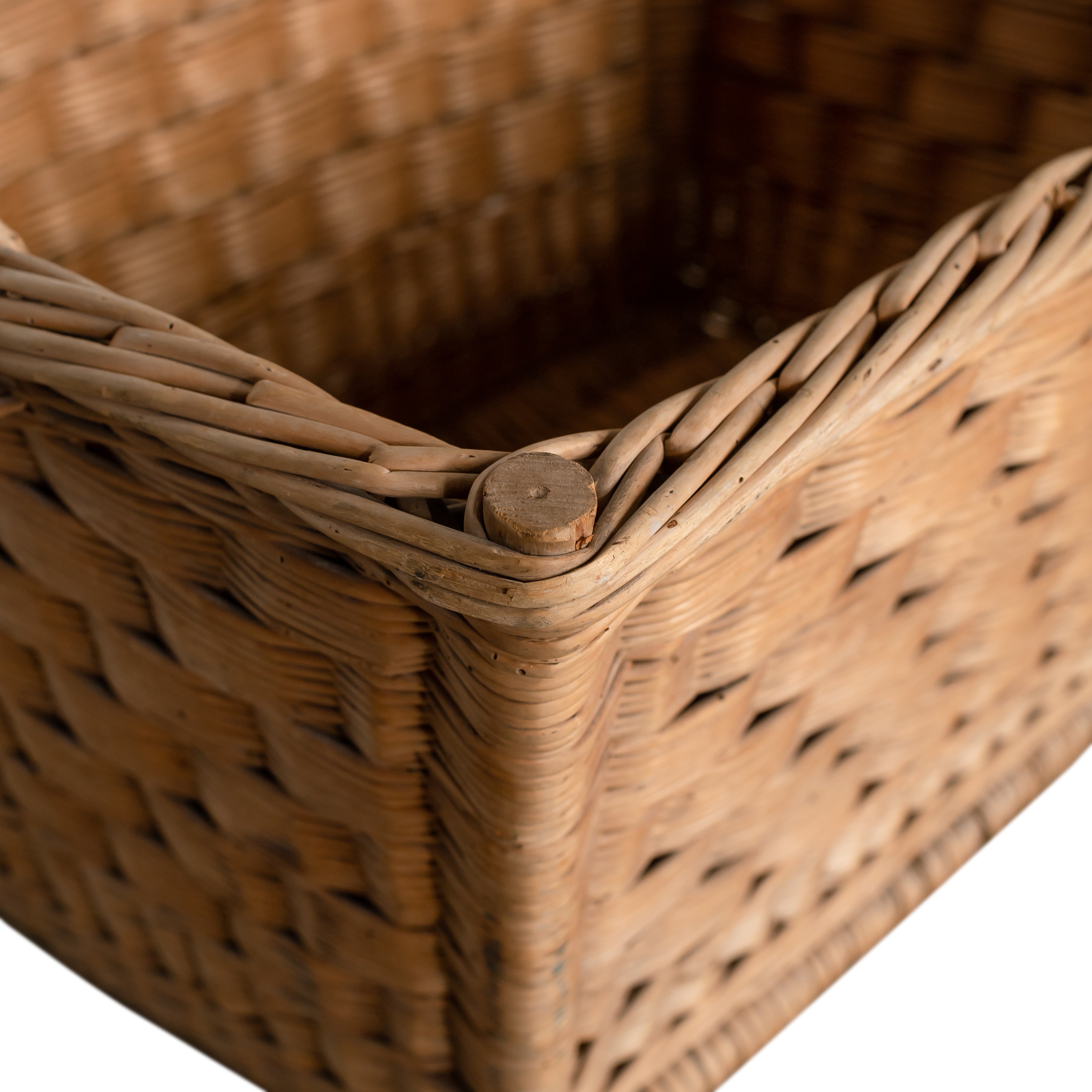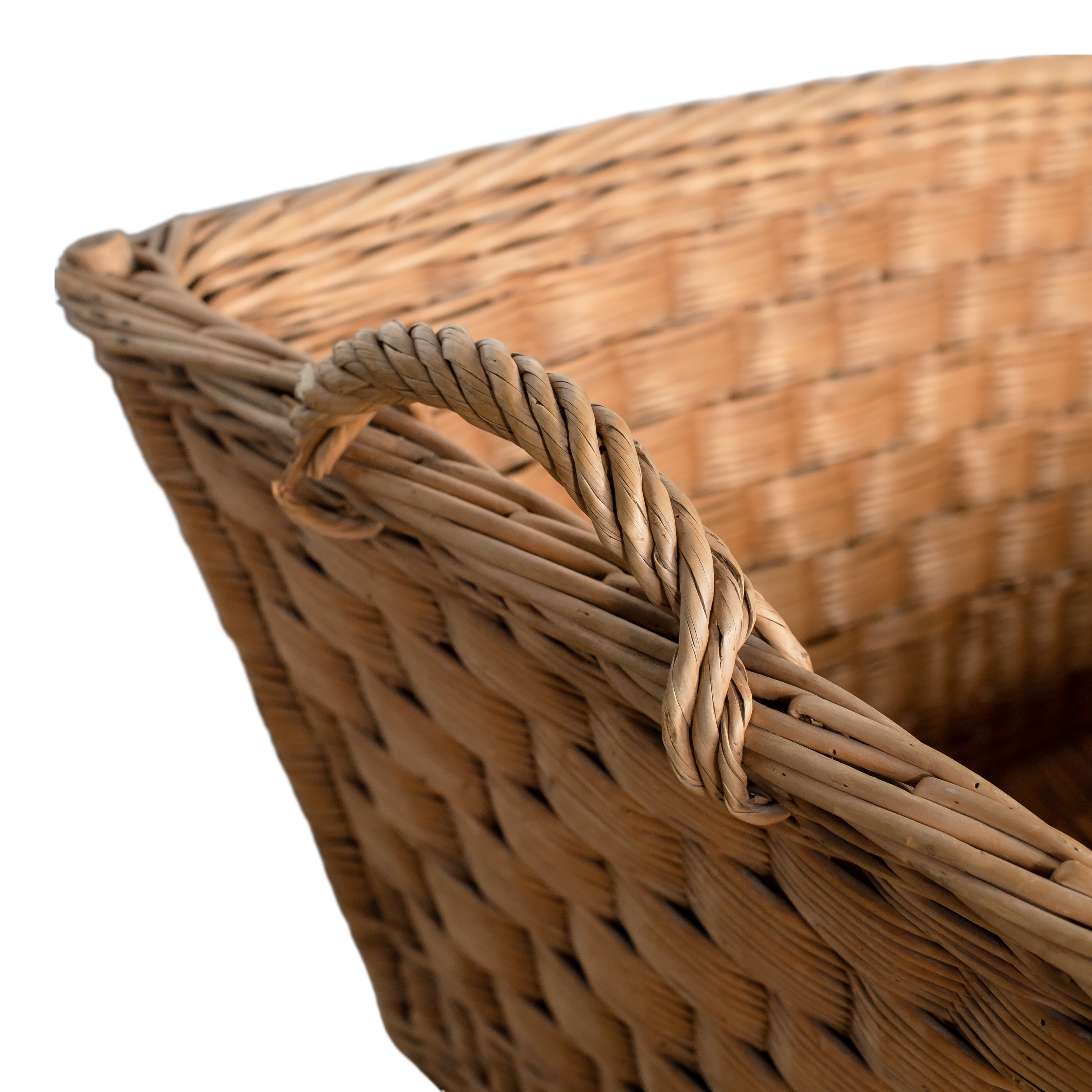 A vintage rectangular woven basket crafted in natural rattan with integrated side handles and a clean, structured shape. The tight weave and warm tone bring texture and an effortless, natural look to styling. Ideal for holding blankets, florals, favors, or layered décor elements.