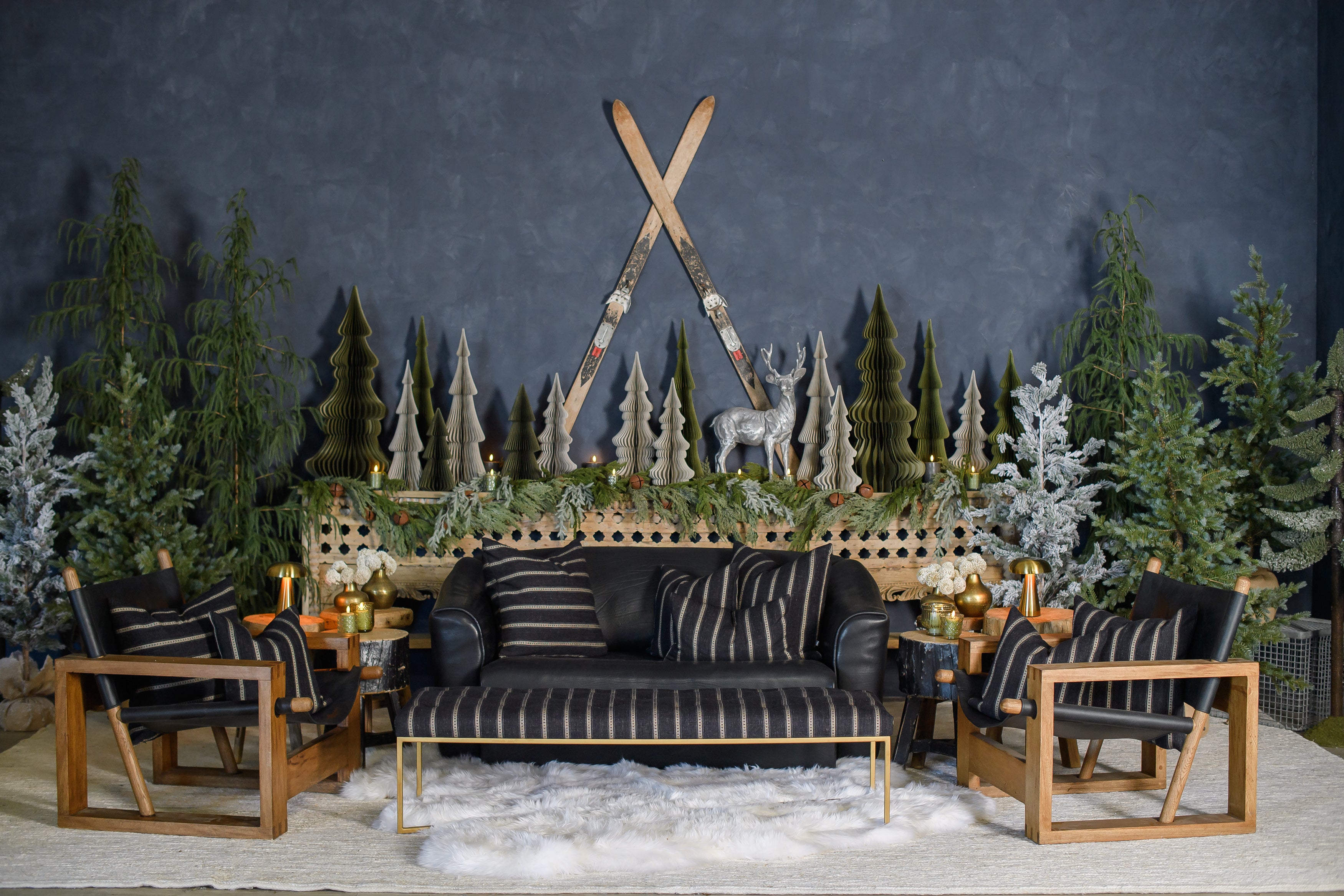 An upholstered ottoman in a tufted black stripe, set on a slim brass base.