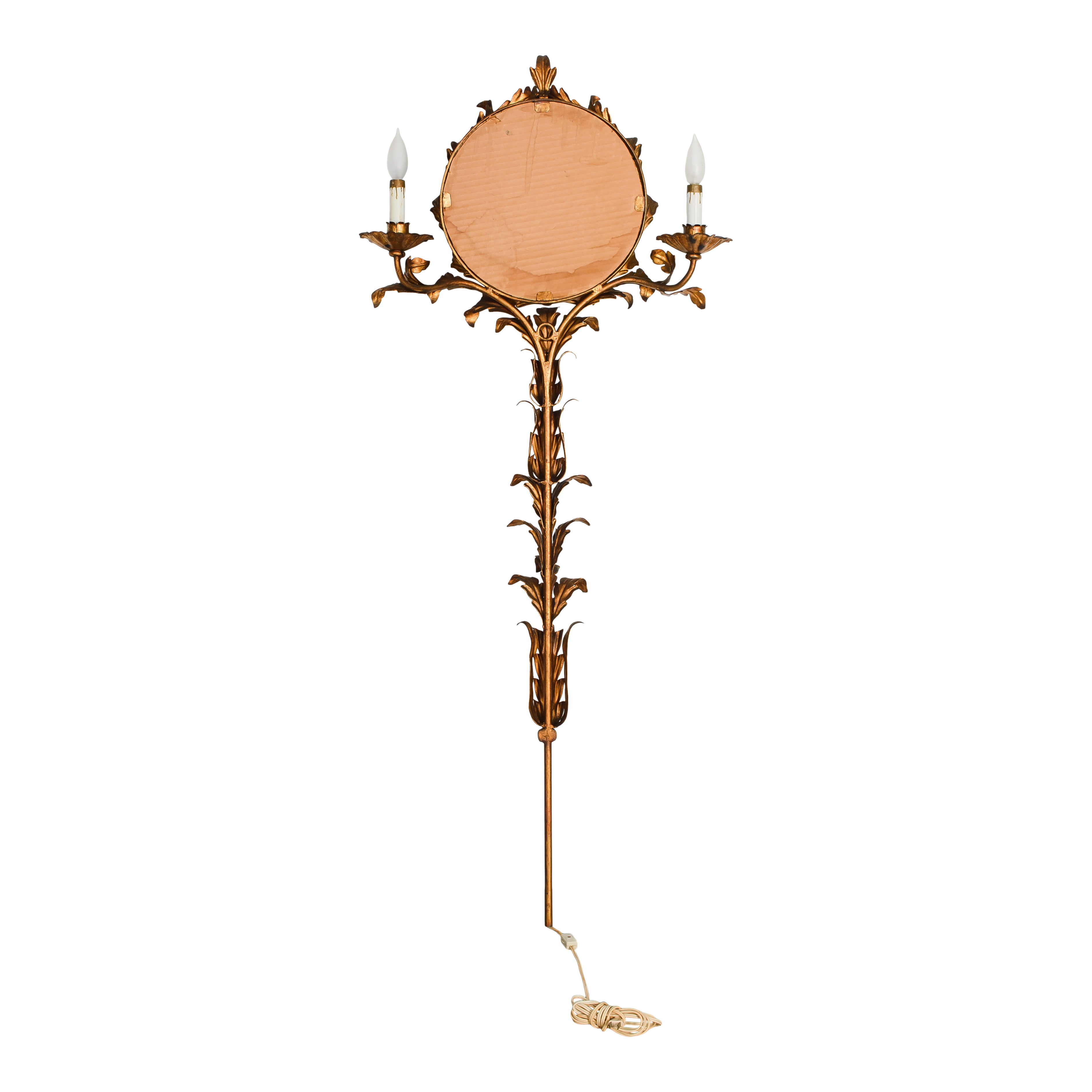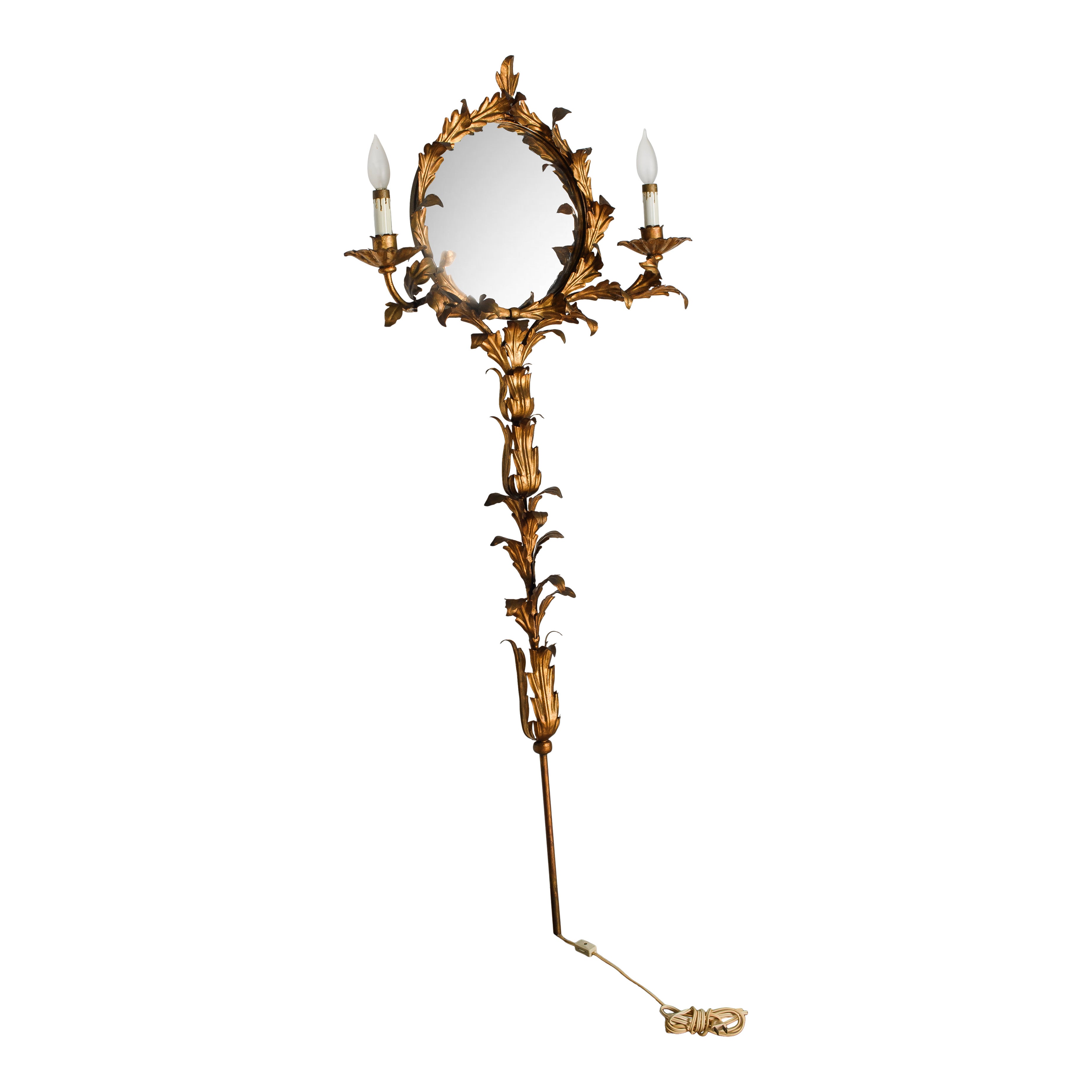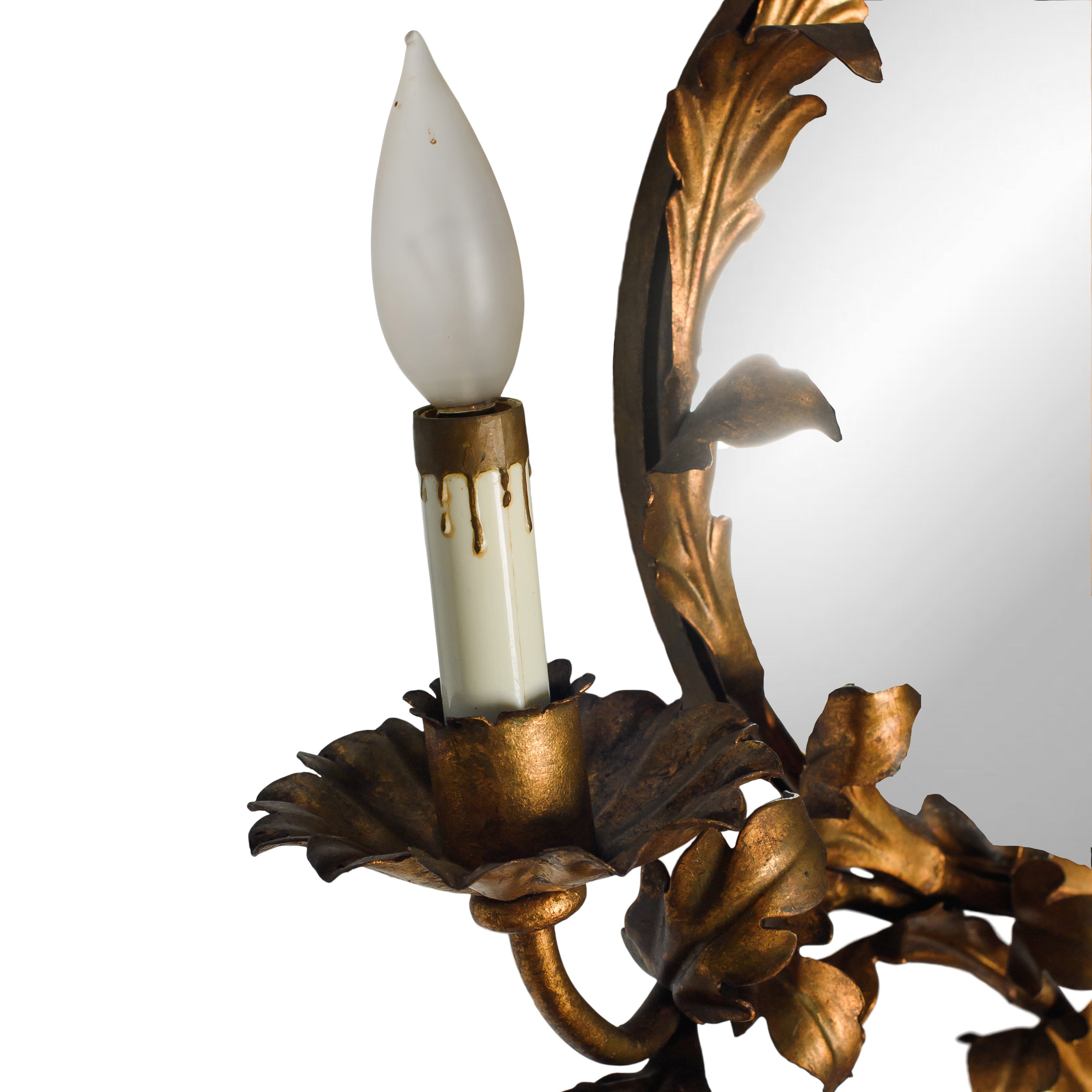 A dramatic vintage wall sconce that doubles as a statement mirror, featuring an ornate gilt frame with sculptural foliage details climbing the entire length. The round mirror sits at the center, surrounded by intricate leafwork and flanked by two candle-style electric lights that provide a warm, atmospheric glow. Its tall, slender silhouette adds vertical interest, while the richly aged gold finish brings character and old-world artistry to any space.