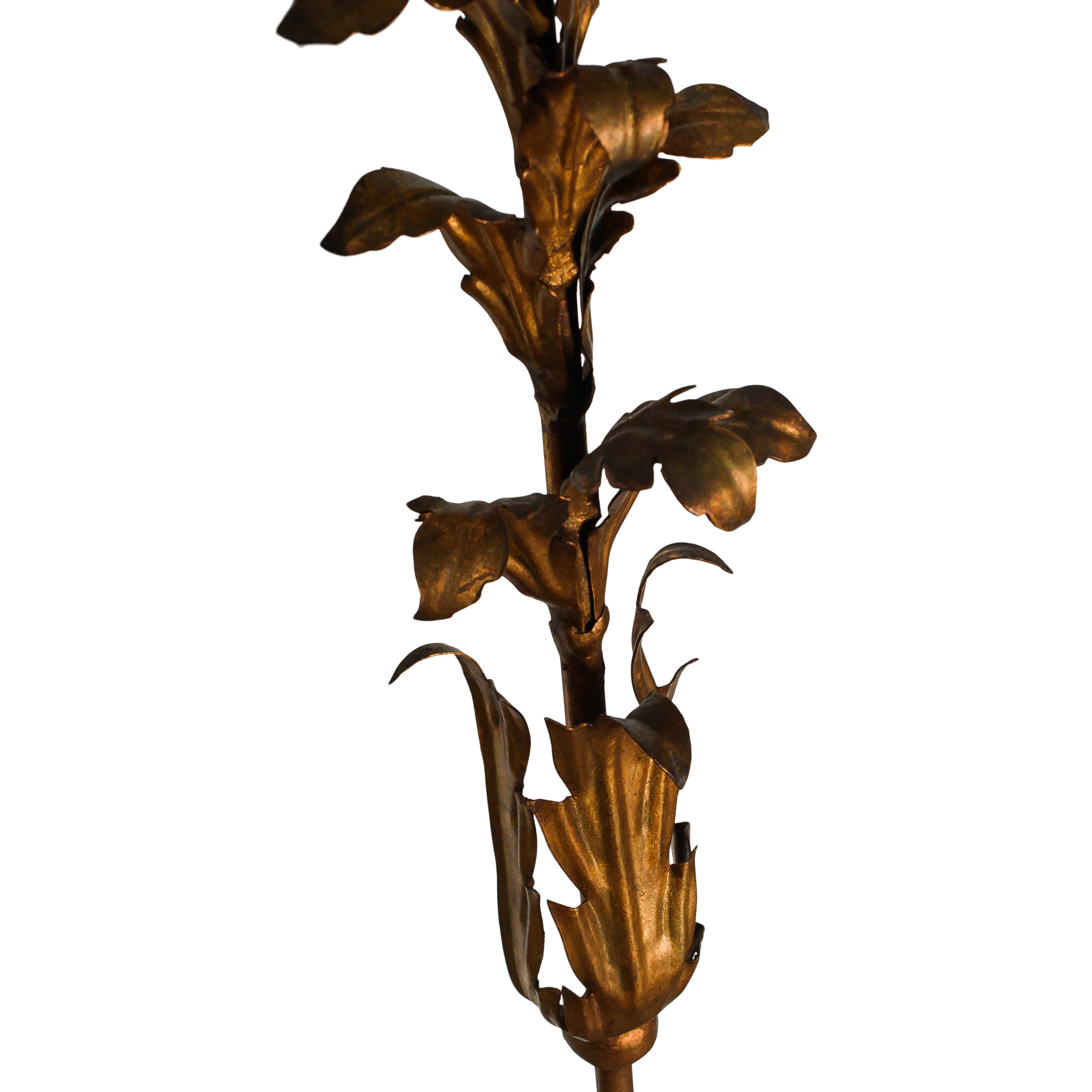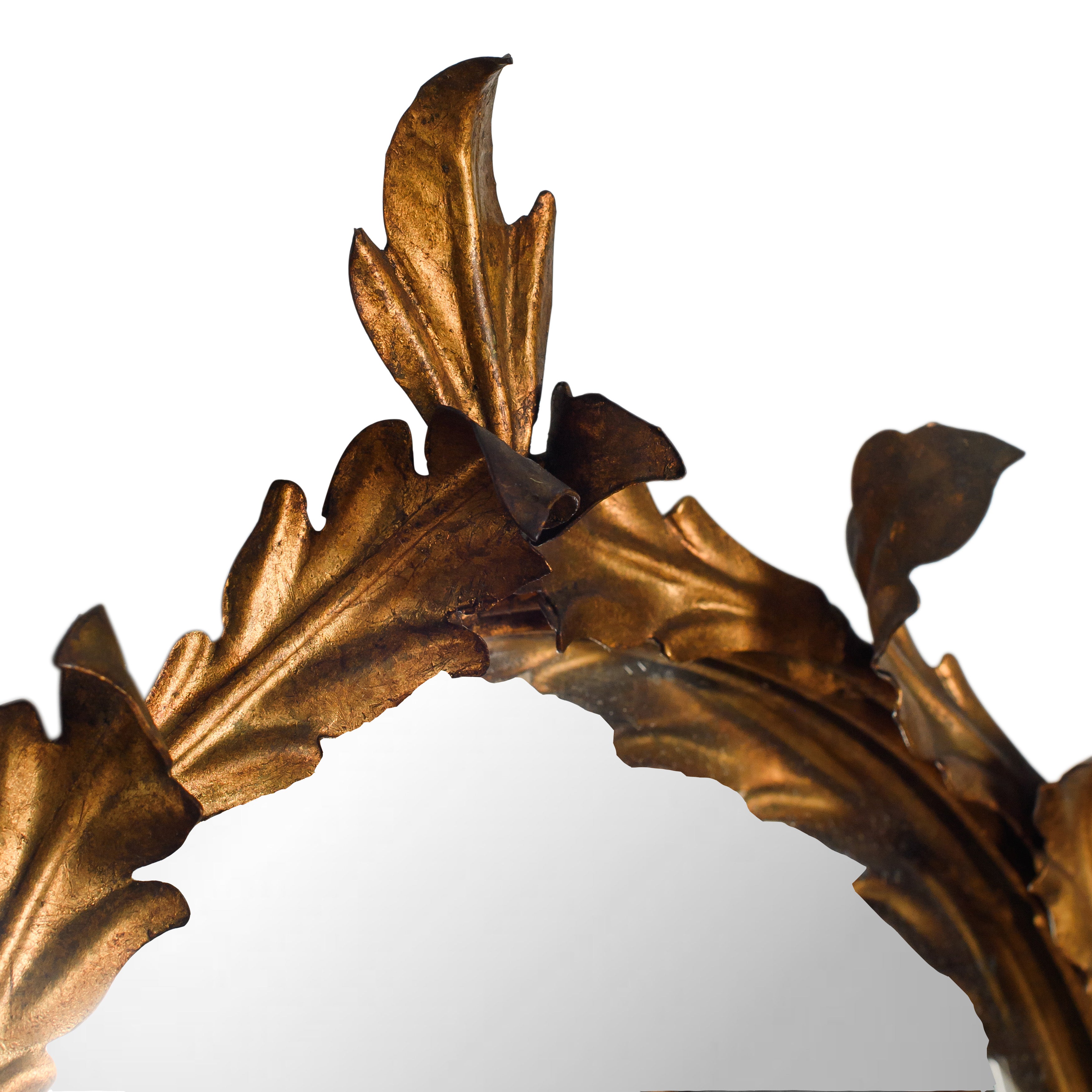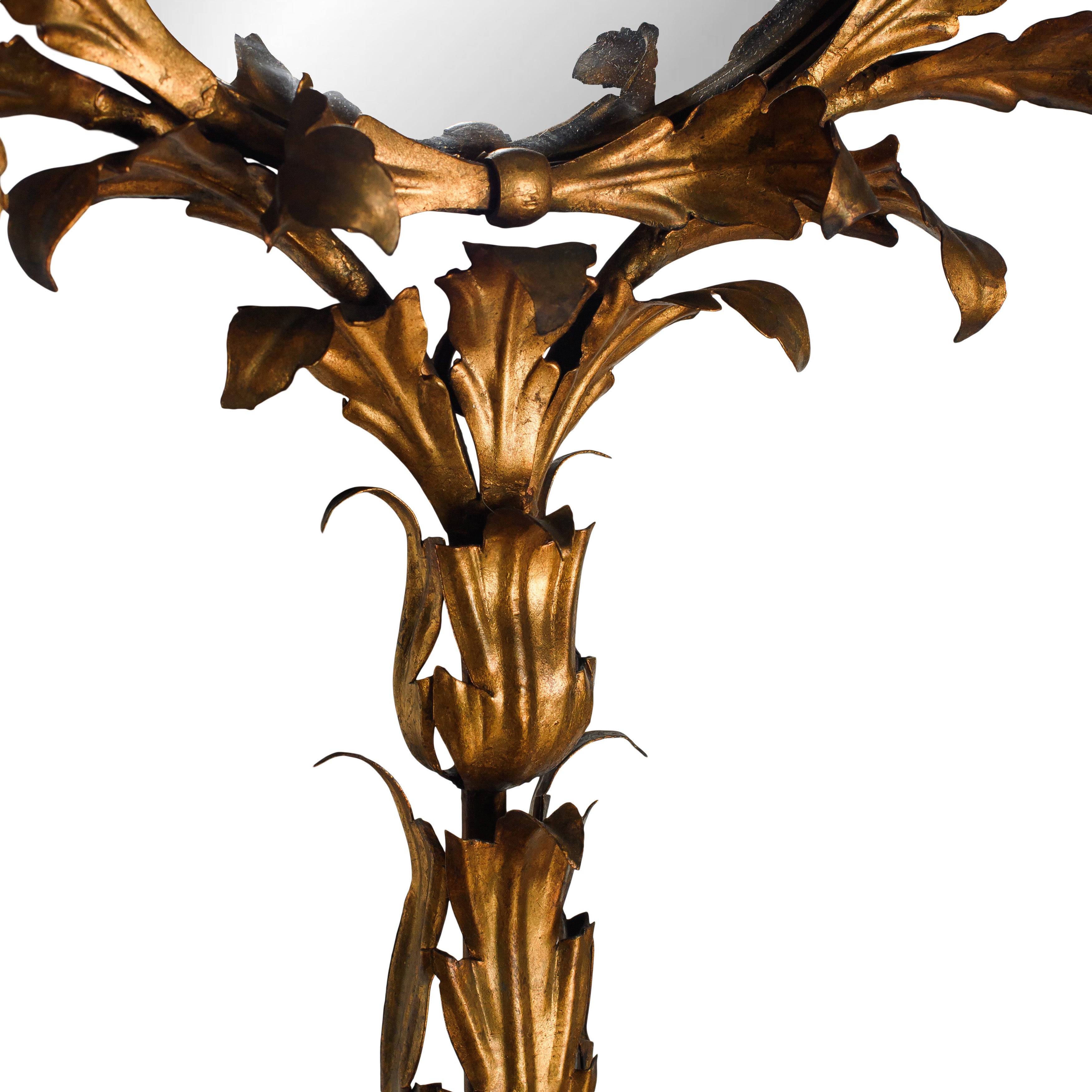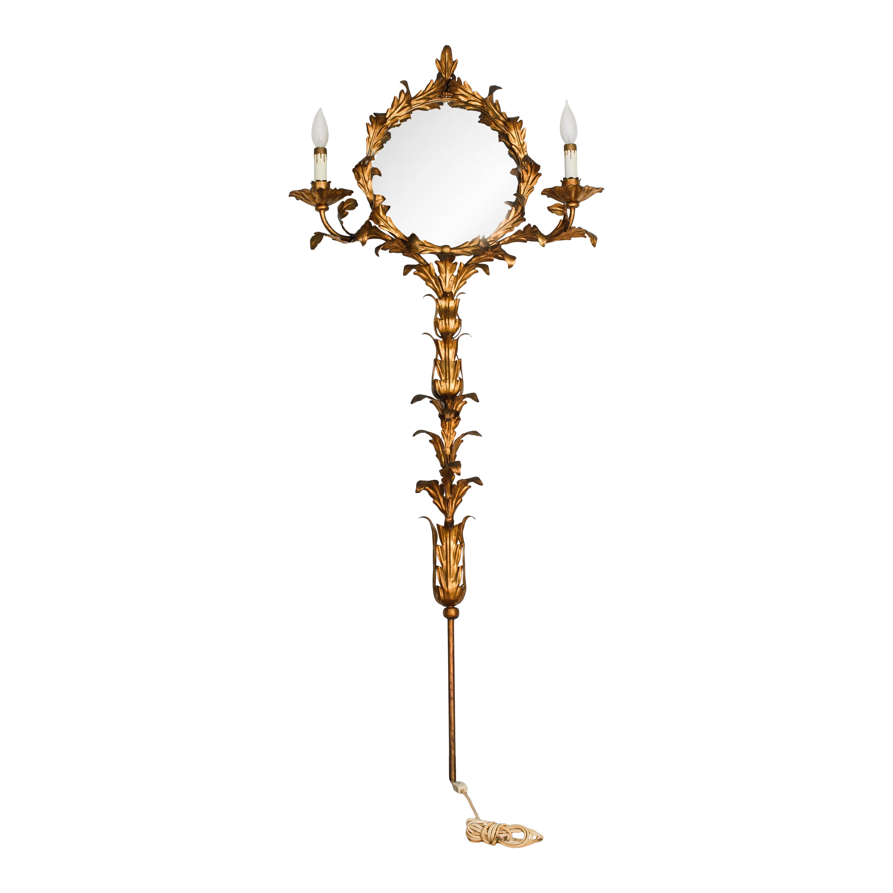 A dramatic vintage wall sconce that doubles as a statement mirror, featuring an ornate gilt frame with sculptural foliage details climbing the entire length. The round mirror sits at the center, surrounded by intricate leafwork and flanked by two candle-style electric lights that provide a warm, atmospheric glow. Its tall, slender silhouette adds vertical interest, while the richly aged gold finish brings character and old-world artistry to any space.