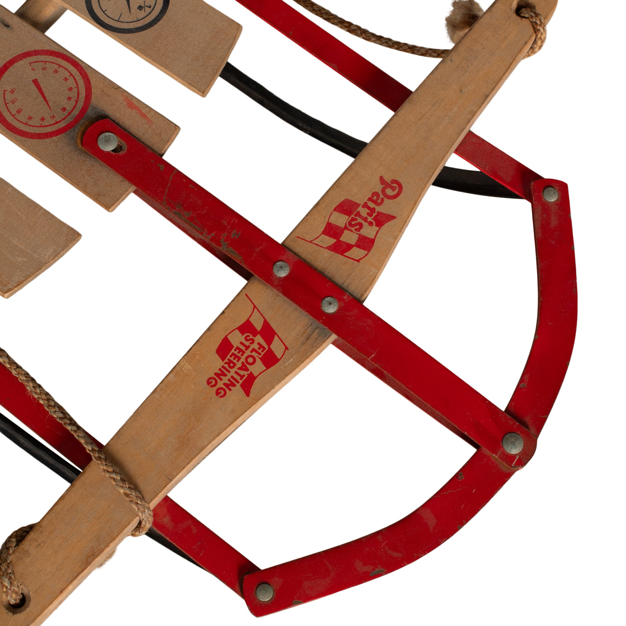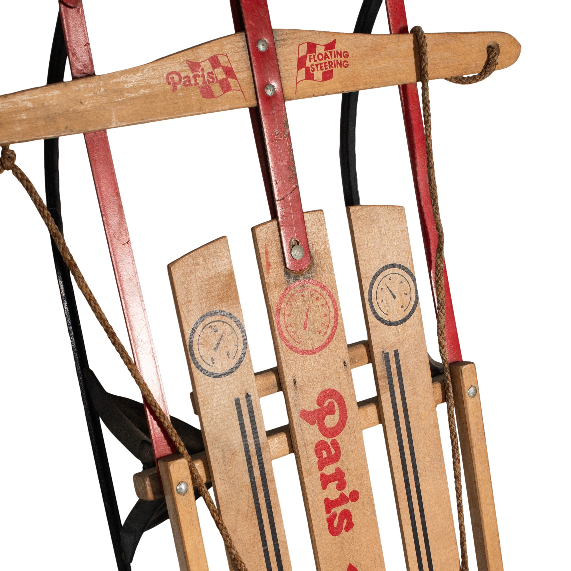 A vintage wooden sled with classic red detailing and black metal runners. Its nostalgic winter feel makes it a playful accent for holiday vignettes, seasonal displays, or cozy lodge-inspired styling.