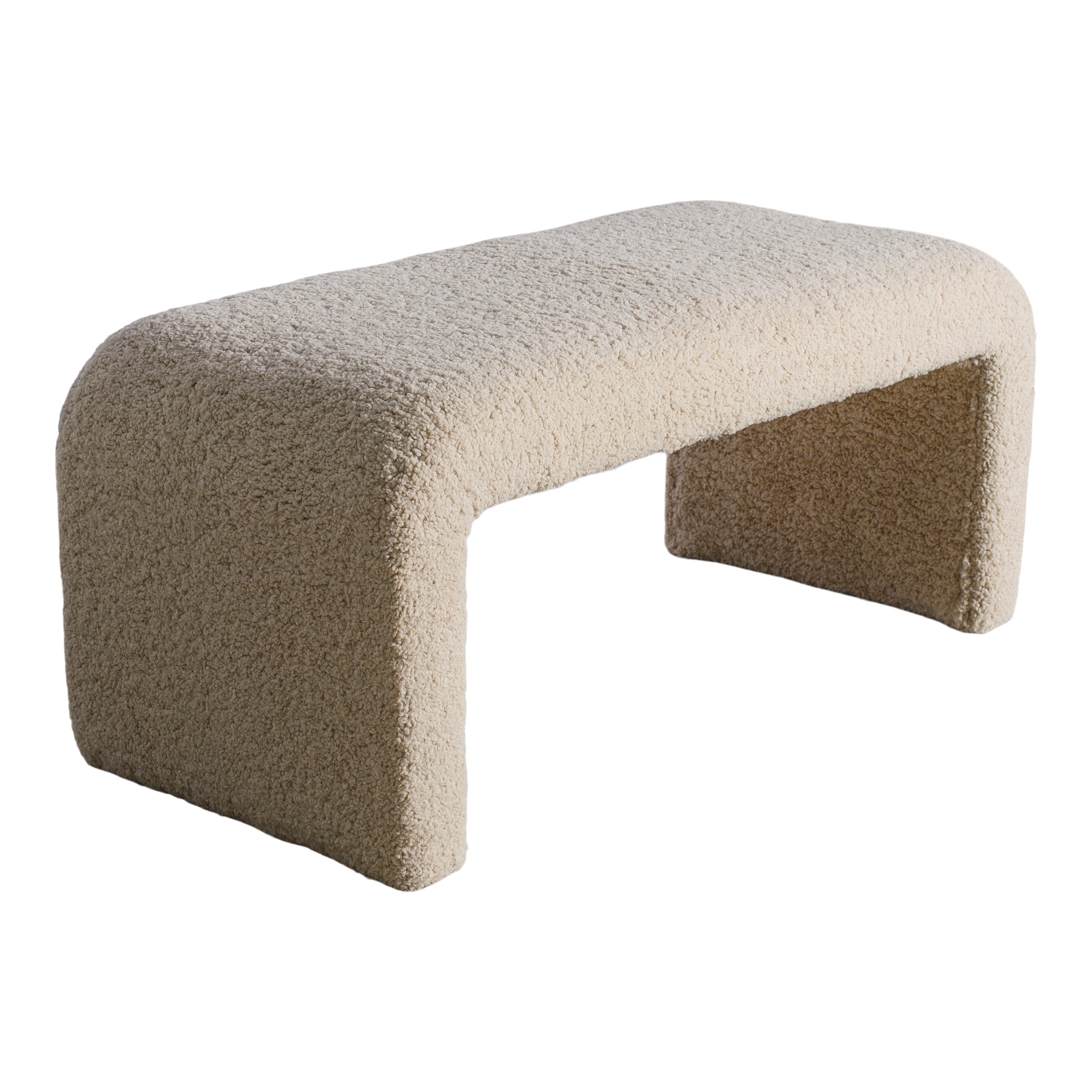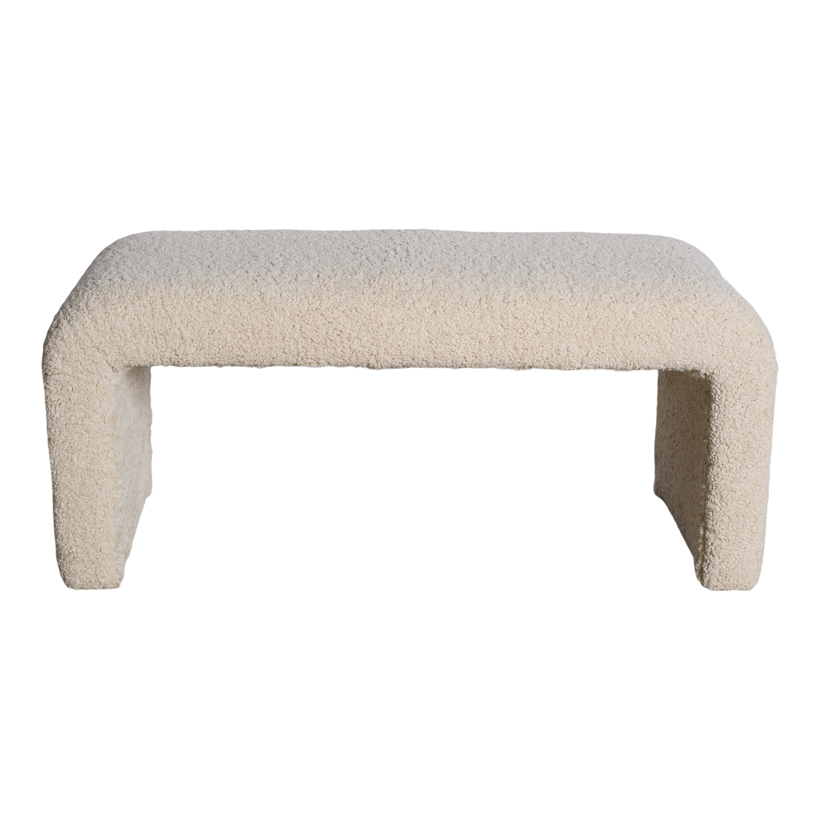 The Leland Bench features a clean, sculptural silhouette fully upholstered in soft boucle. Its waterfall-style frame and plush texture create a bold yet minimal statement.