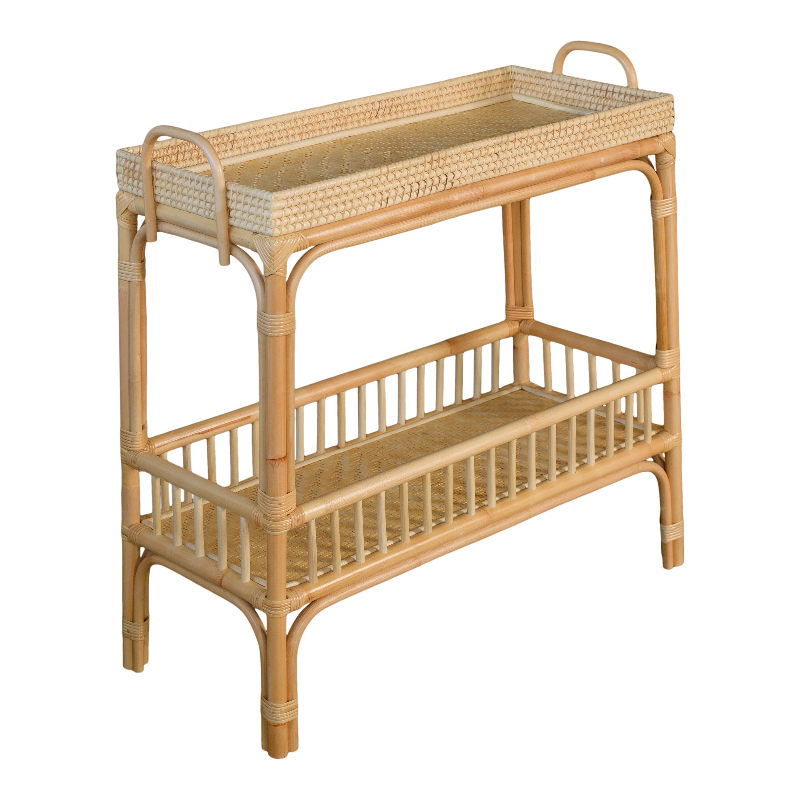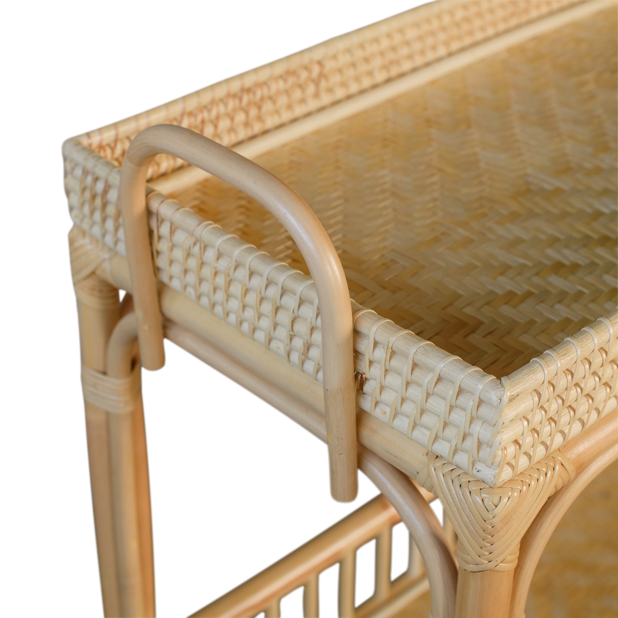 The Libby Natural Console Table features a tiered natural rattan design with a woven top shelf. Perfect for displaying drinks and sweet treats.