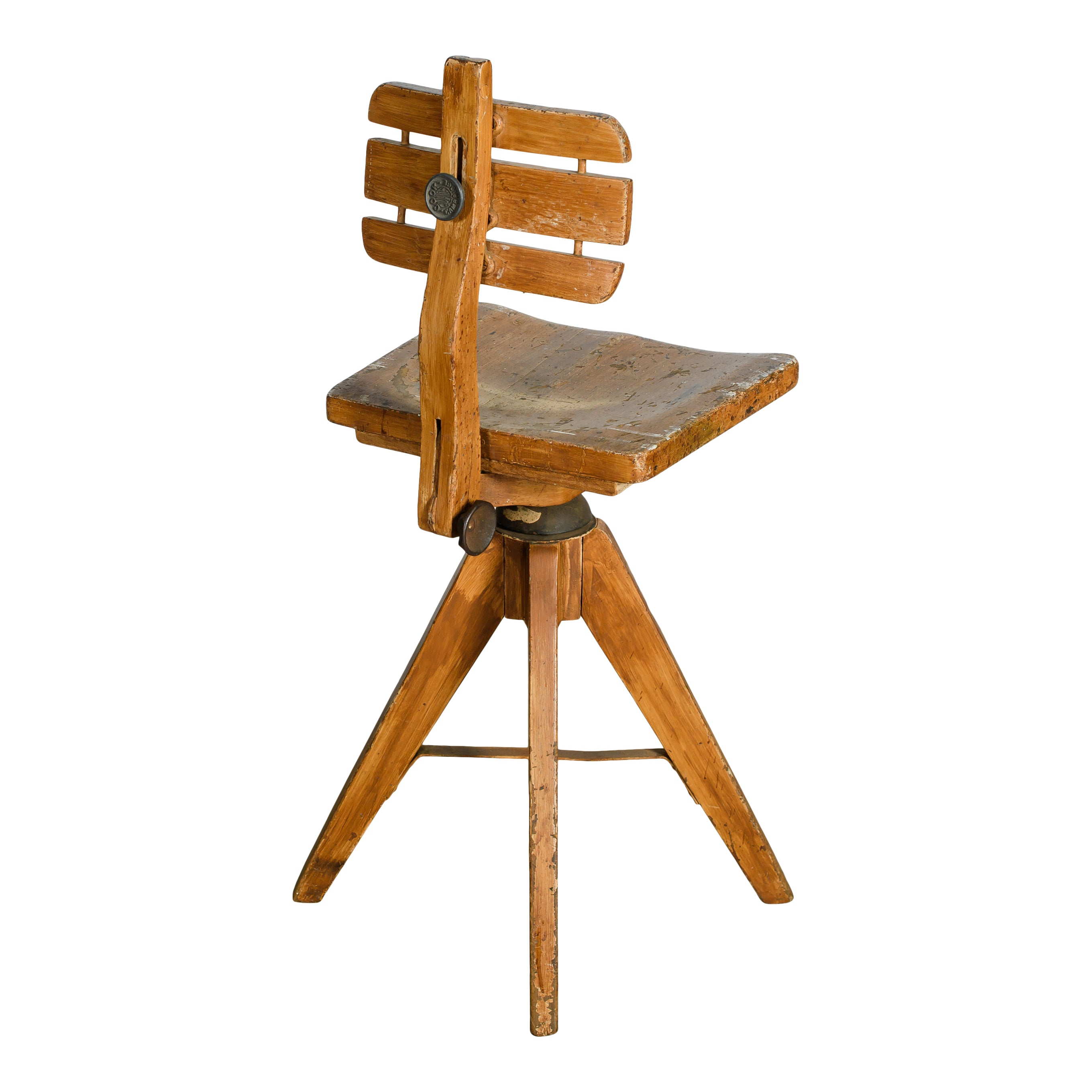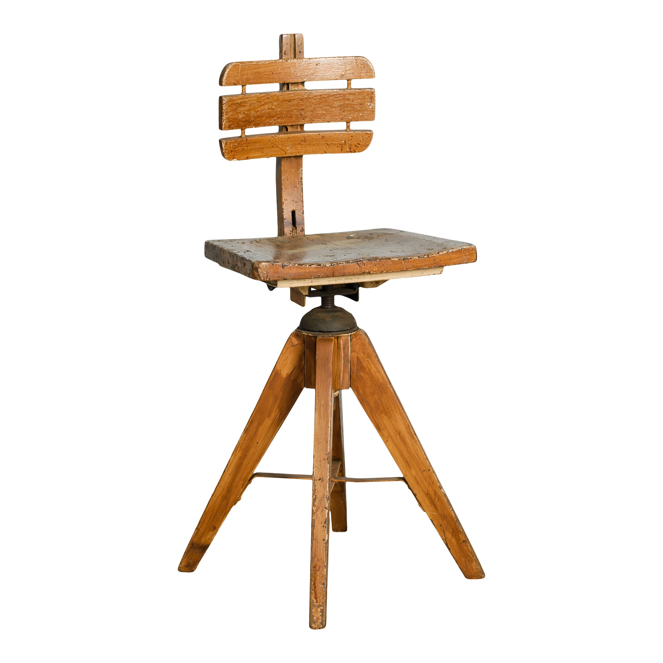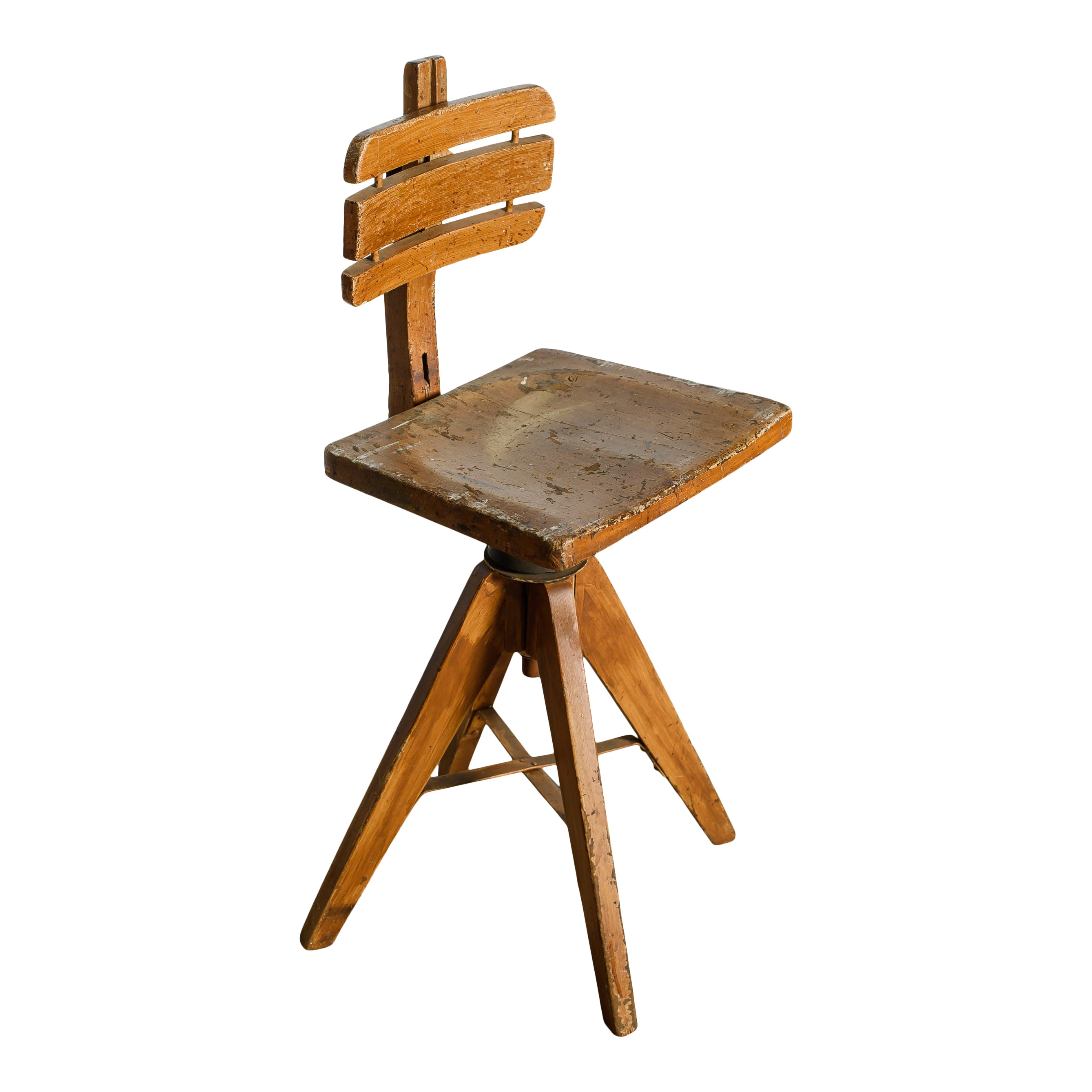 A vintage wooden swivel chair with a sculptural tripod base, slatted backrest, and beautifully worn patina. The character marks and aged finish highlight its utilitarian past, giving it a one-of-a-kind presence.