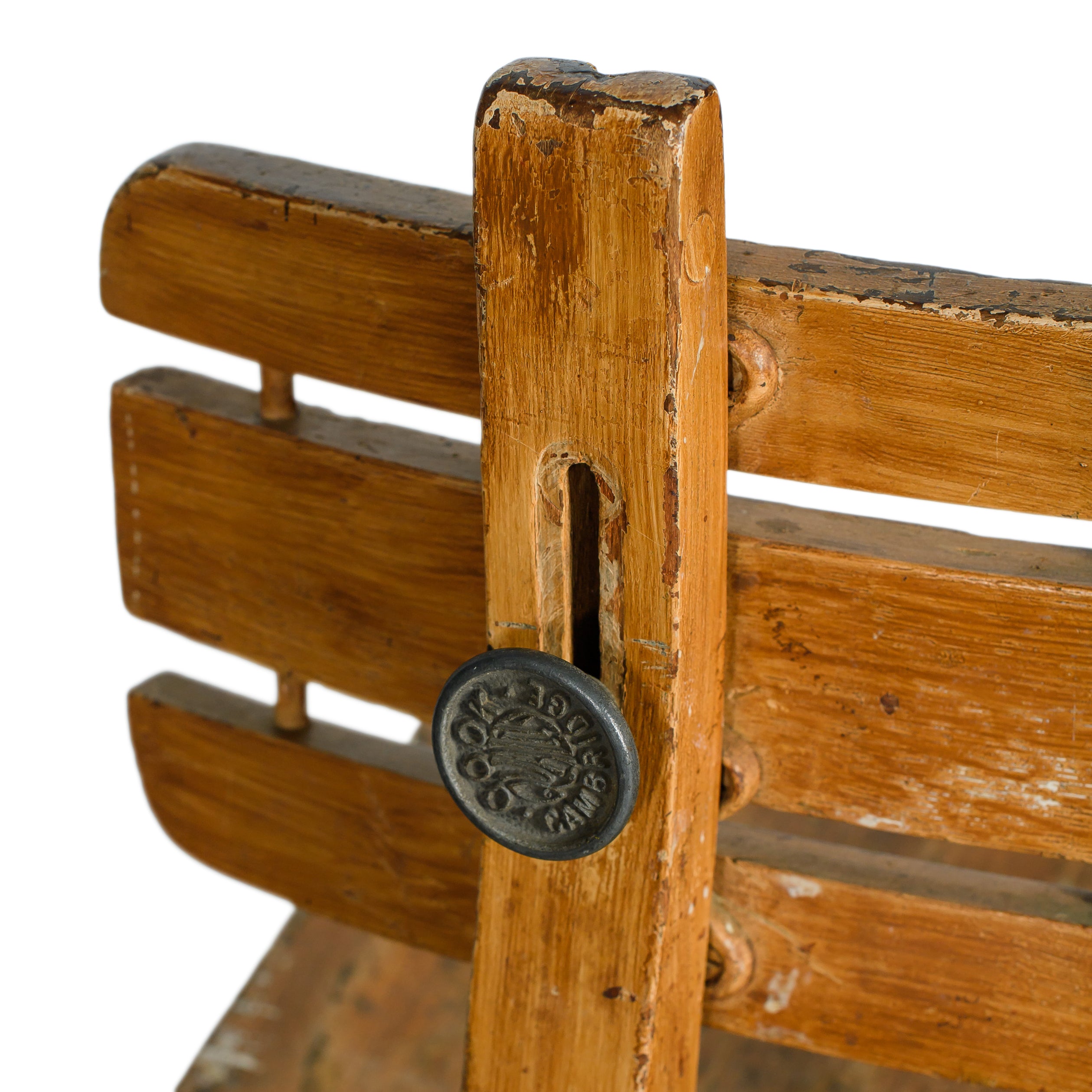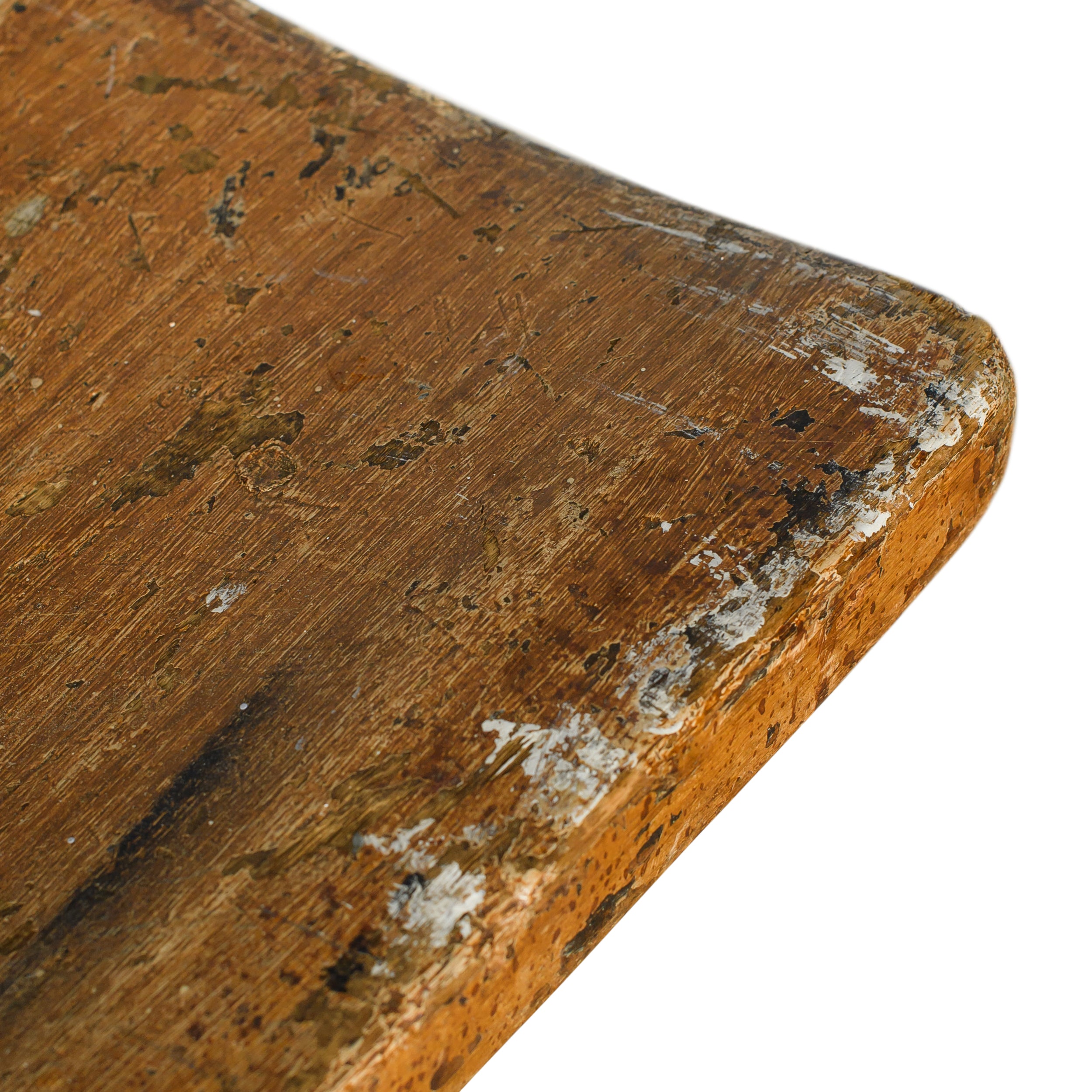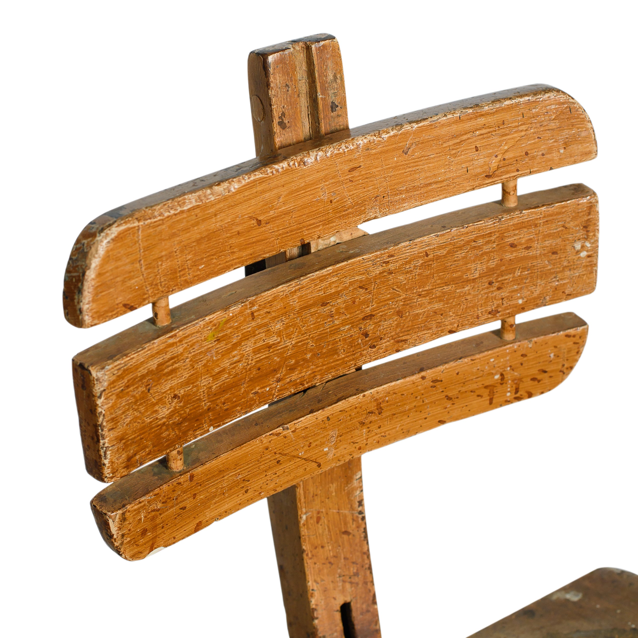 A vintage wooden swivel chair with a sculptural tripod base, slatted backrest, and beautifully worn patina. The character marks and aged finish highlight its utilitarian past, giving it a one-of-a-kind presence.