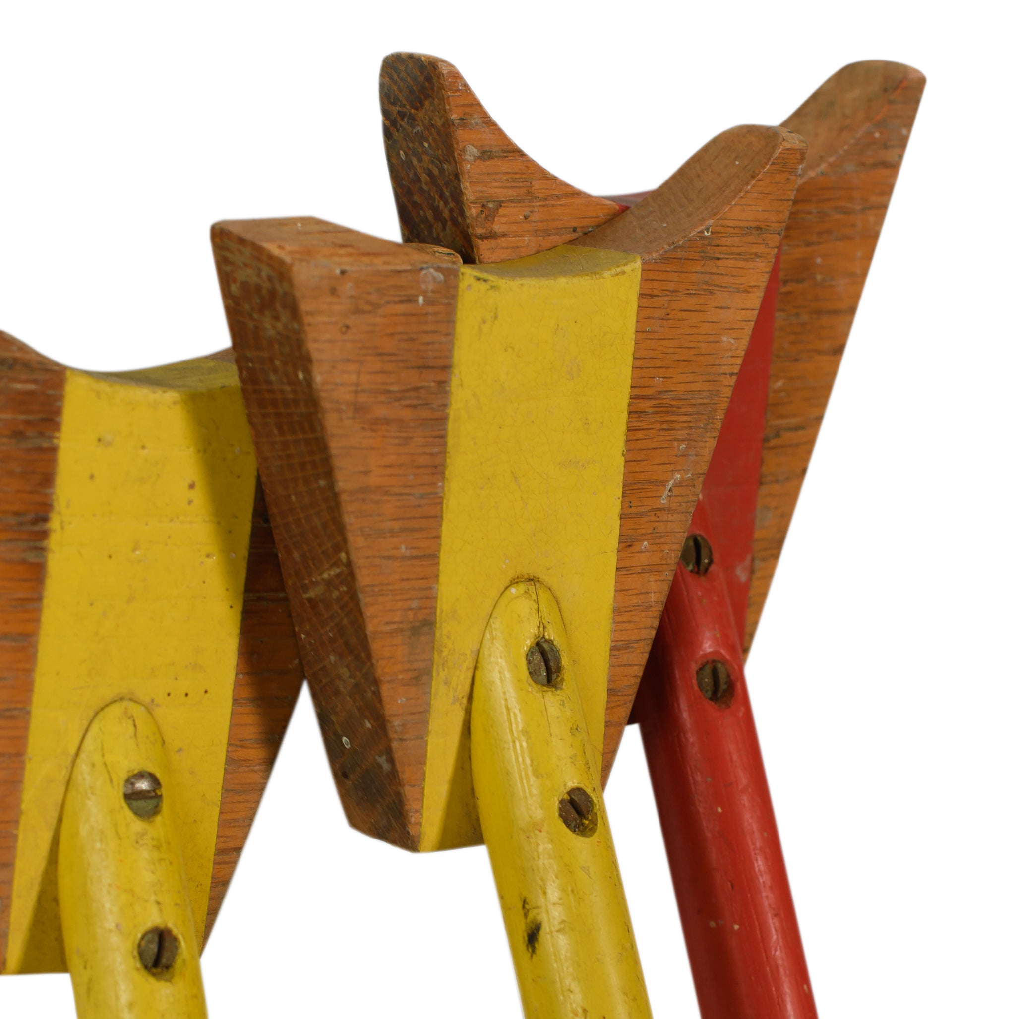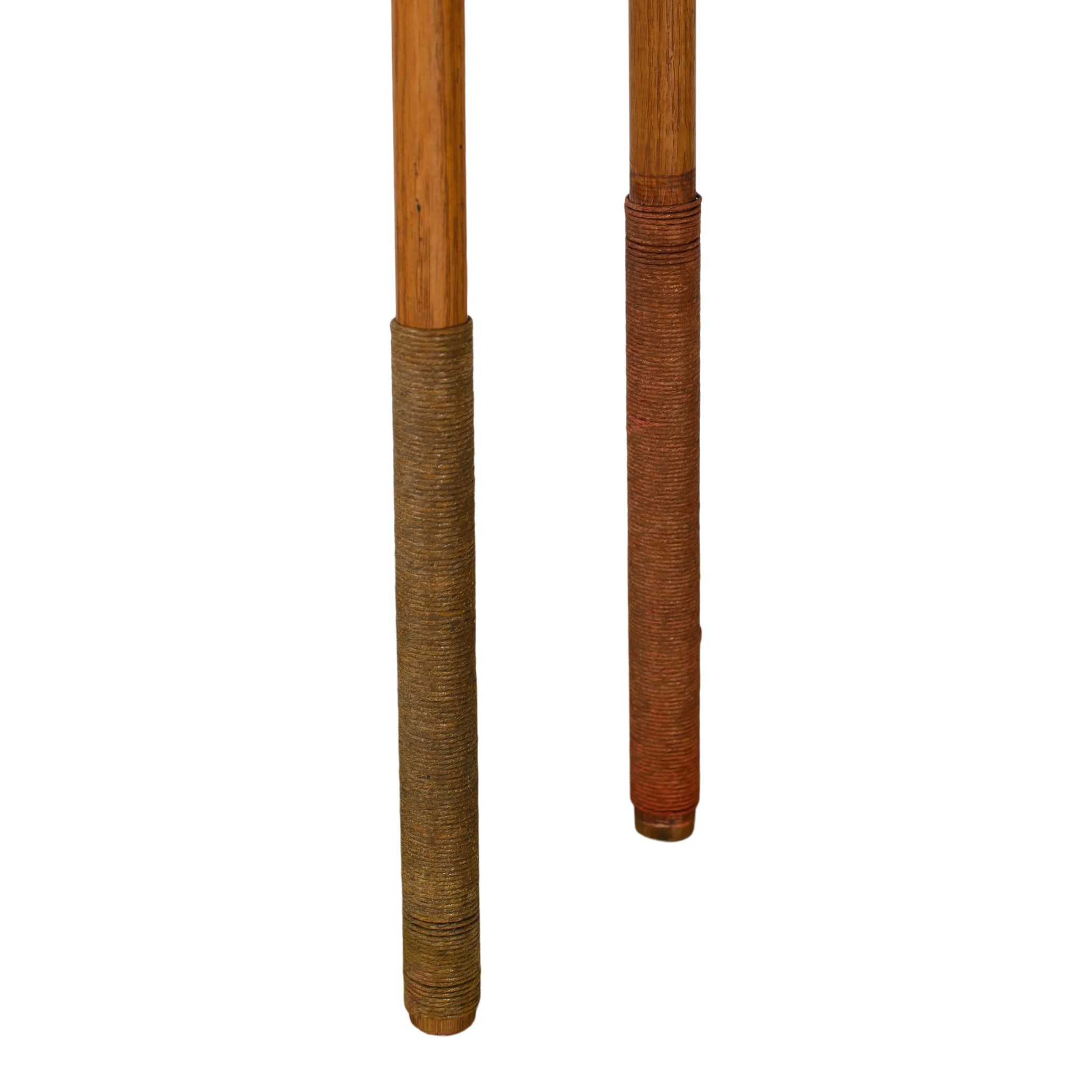 A set of vintage shuffleboard cues featuring warm wood tones and color-tipped heads. They bring an easy nostalgic, sporty energy to any event setting, adding character and a playful touch. Dimensions: 4 x 2 x 63