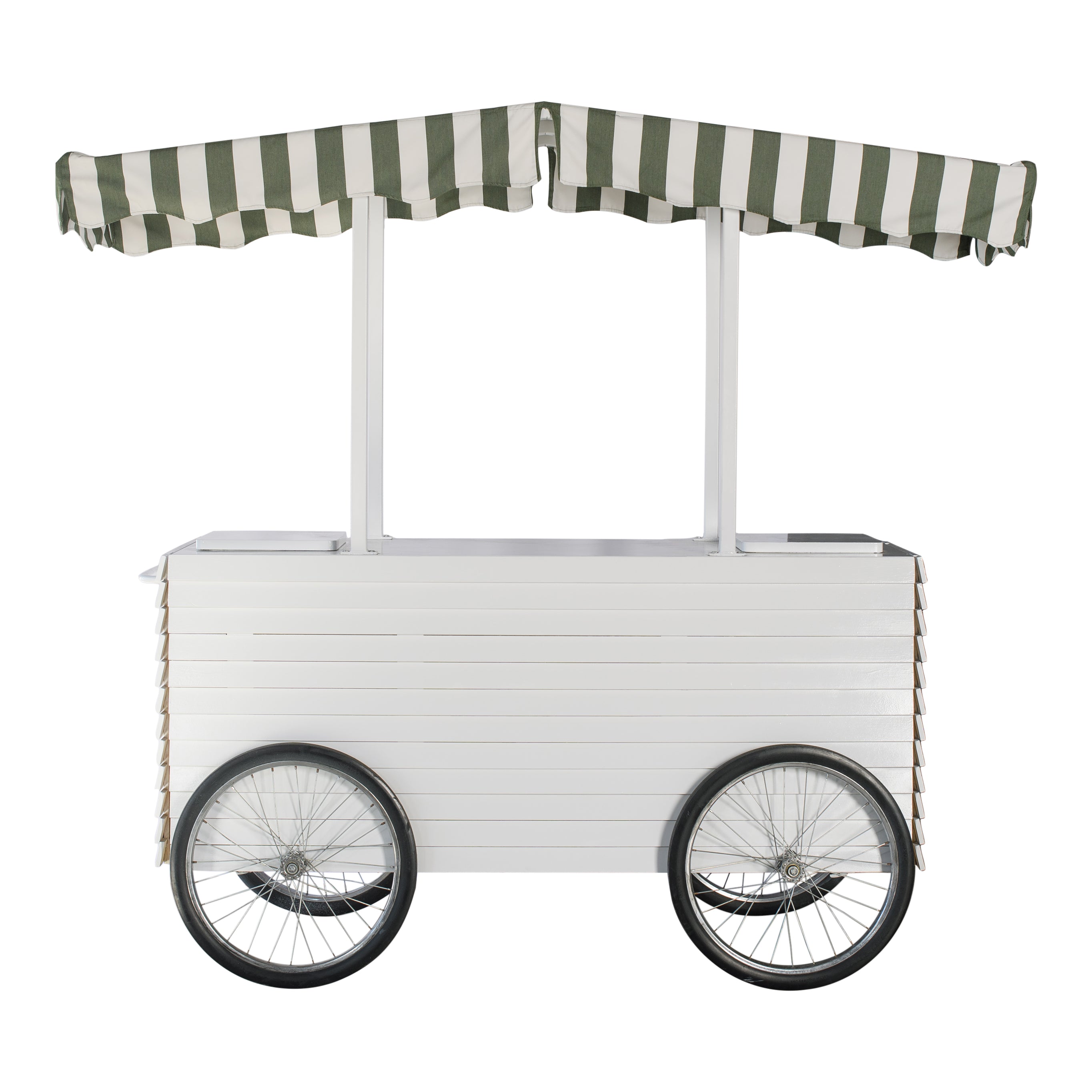 The Nixie Bar Cart brings a playful touch with its crisp white frame and scalloped canopy top. Designed for serving or styling, it includes three interchangeable canopy options to match a variety of looks. Perfect for cocktails, desserts, or event displays, this cart is both functional and eye-catching.