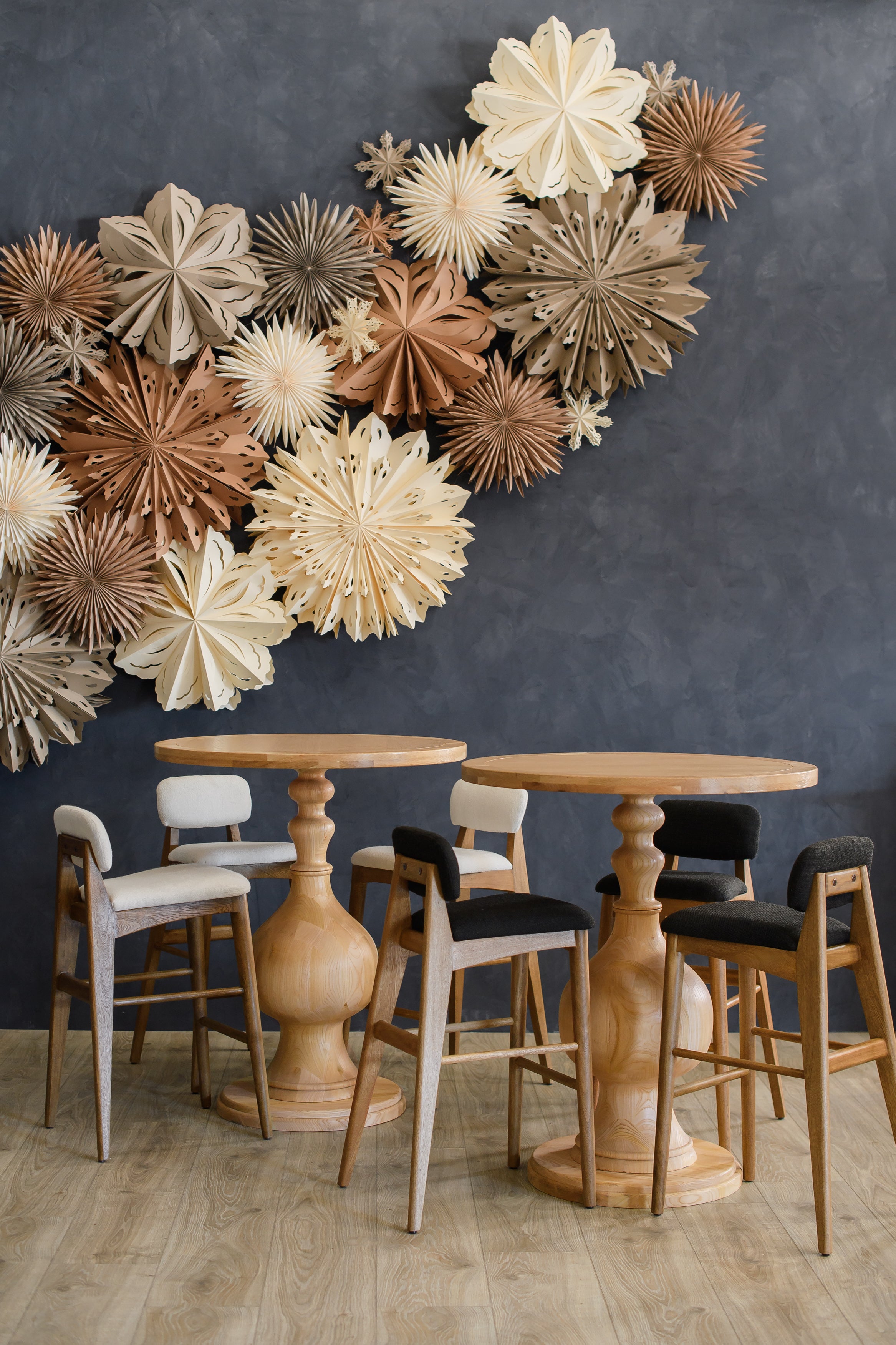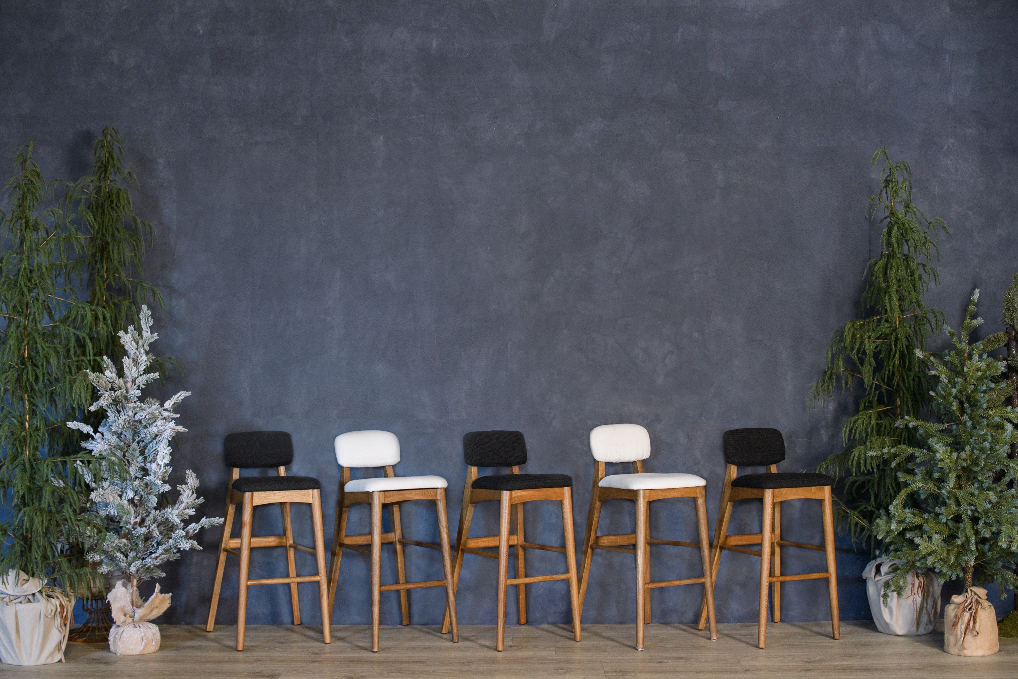 The Pablo Black Bar Stool features a wood barstool with a black upholstered back and seat. A natural and minimal rental for the curated wedding or event of your dreams.