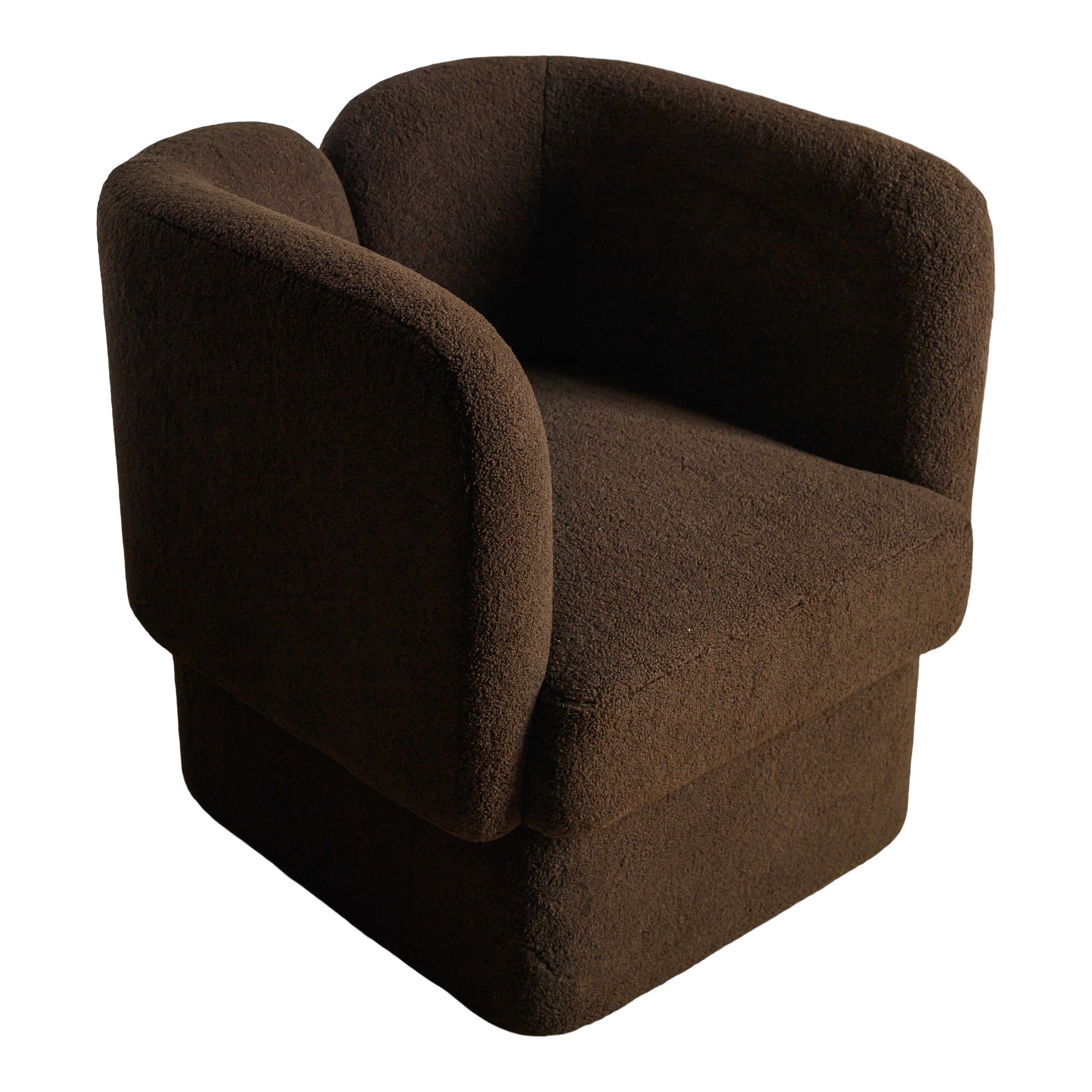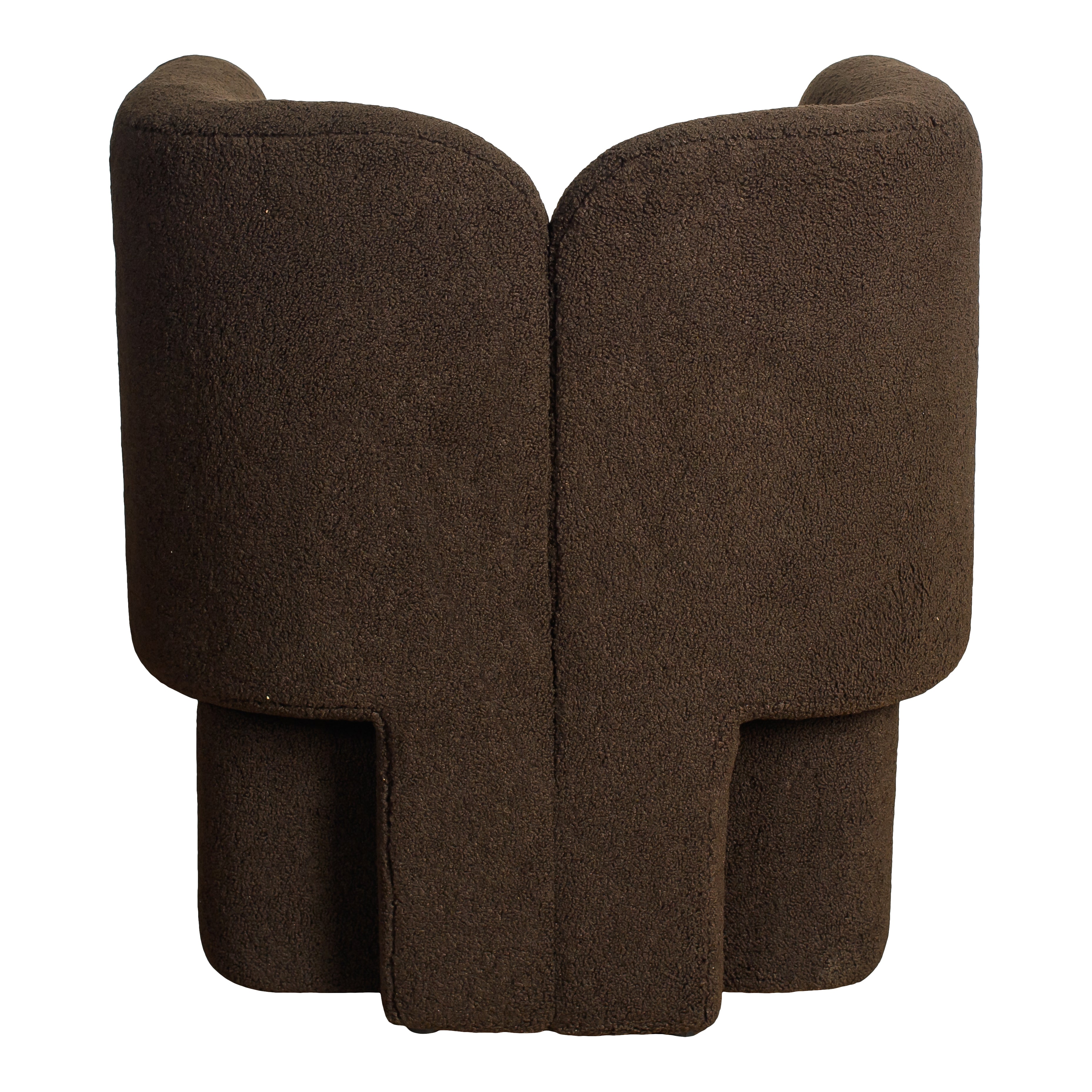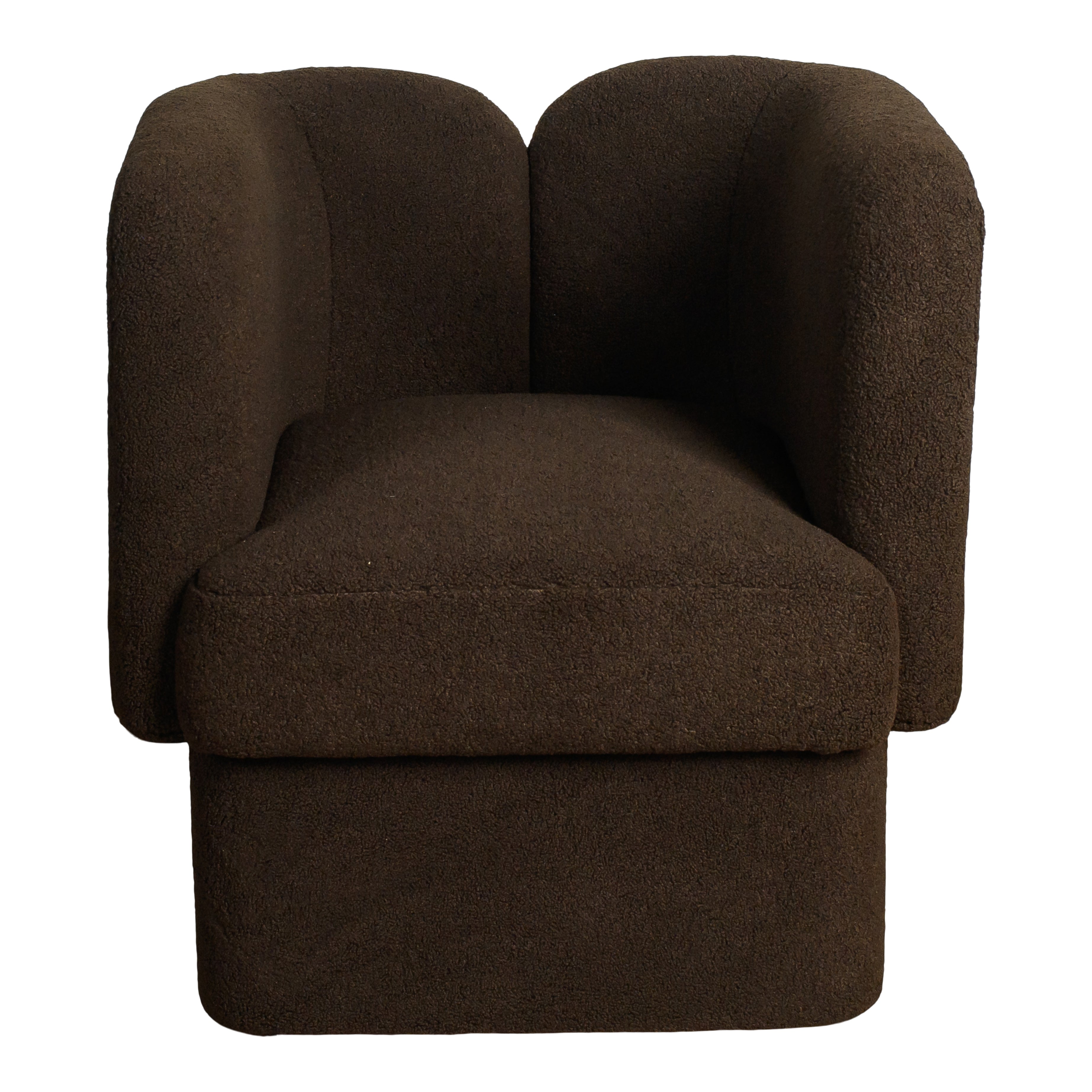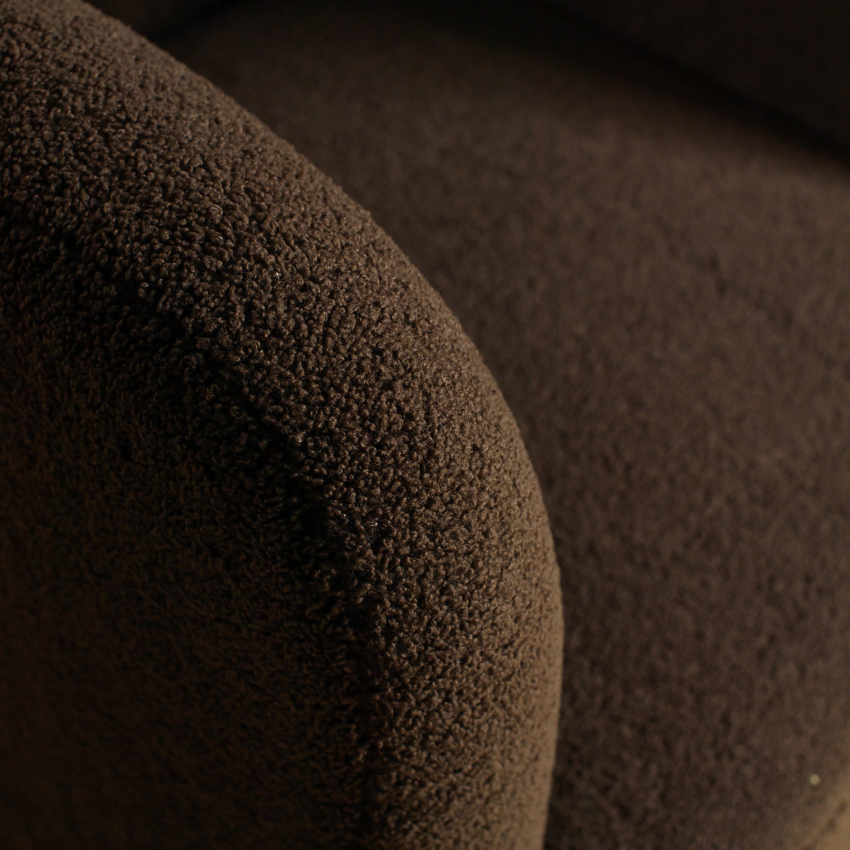 The Paddington Armchair features a rounded silhouette upholstered in rich mocha boucle. Its low profile and wrapped arms give it a modern, sculptural feel that blends seamlessly into lounge groupings or cozy seating areas.