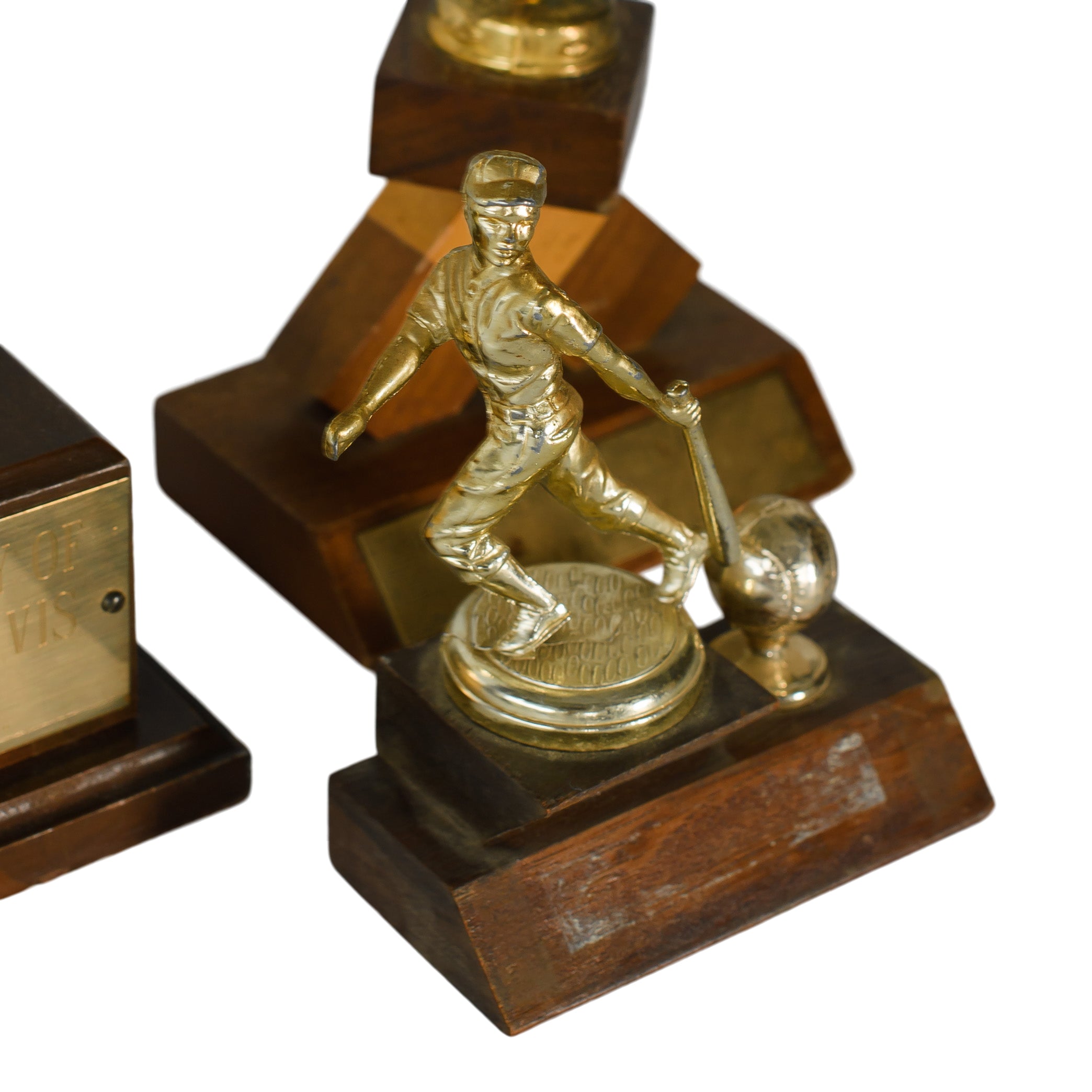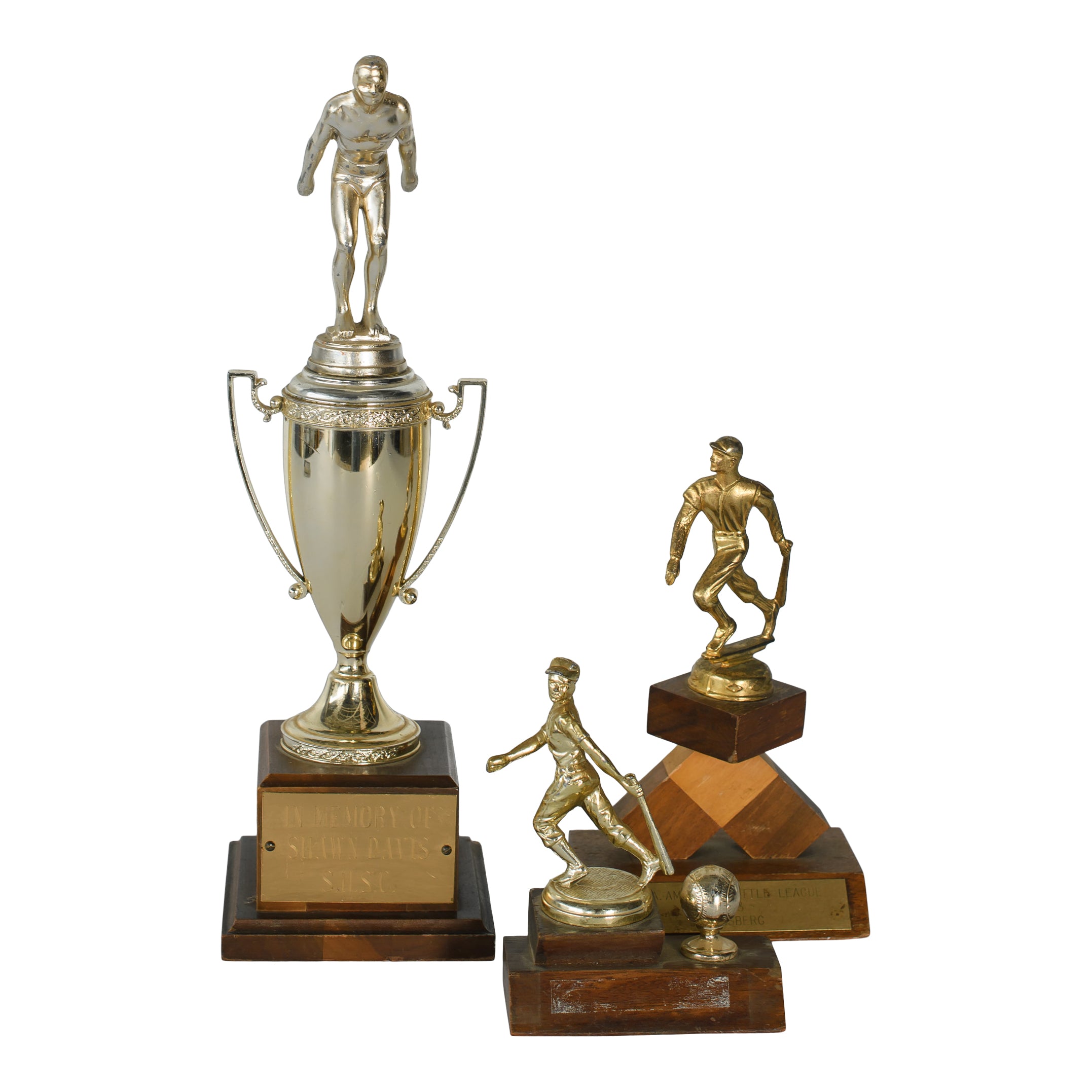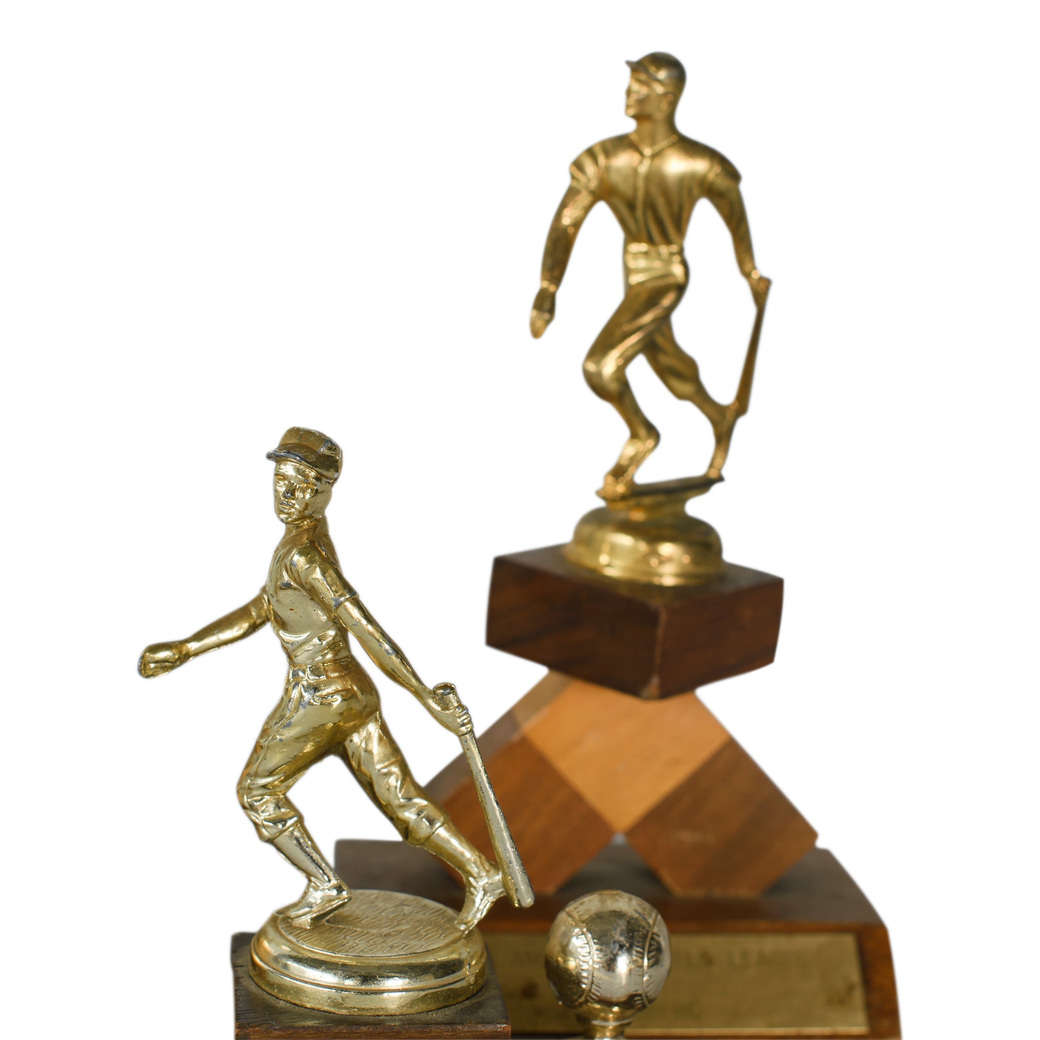 A trio of vintage sports trophies featuring classic metal figures and warm wood bases. Their mixed shapes and heights make them great as styled accents for bar displays or playful vignette setups that nod to old-school athletics.