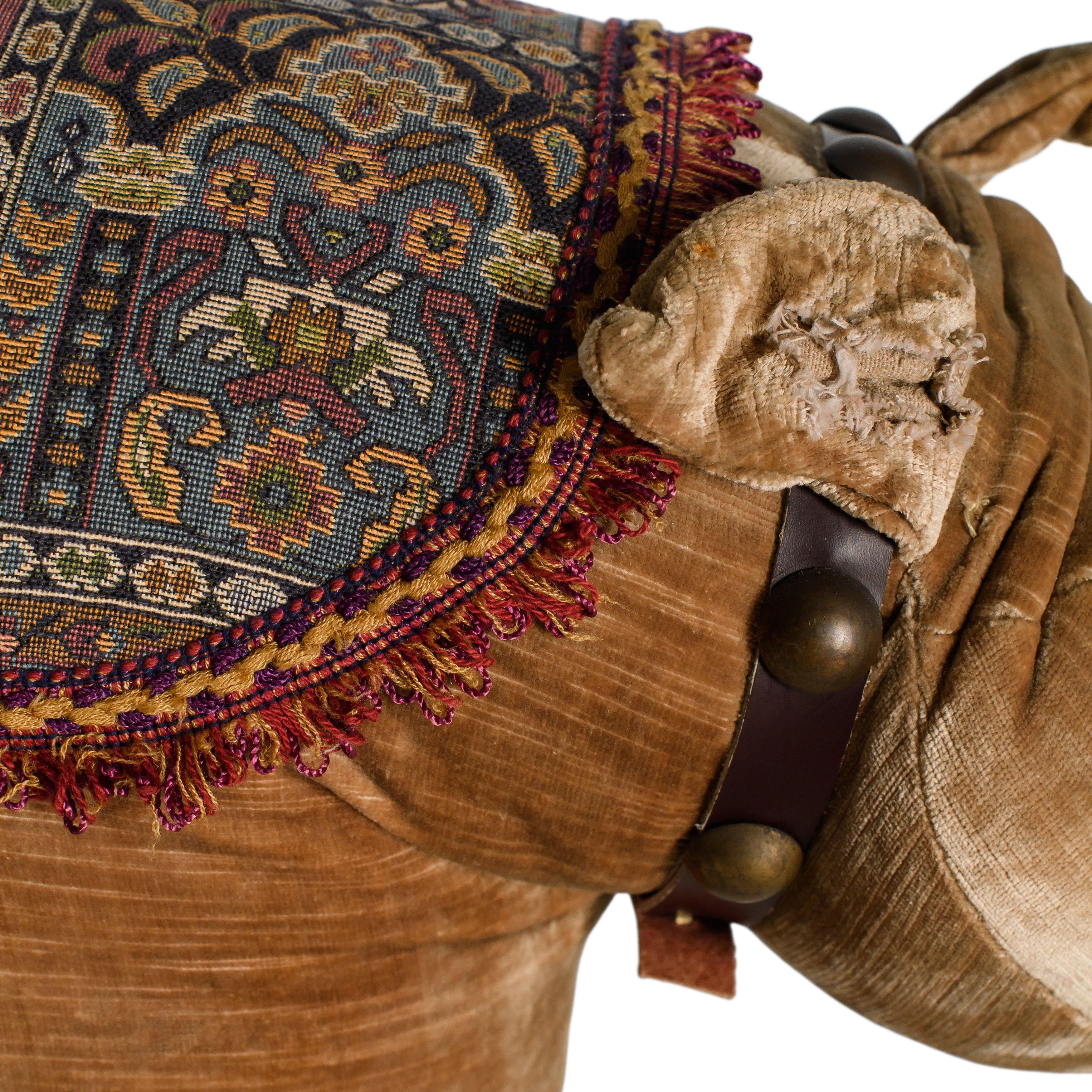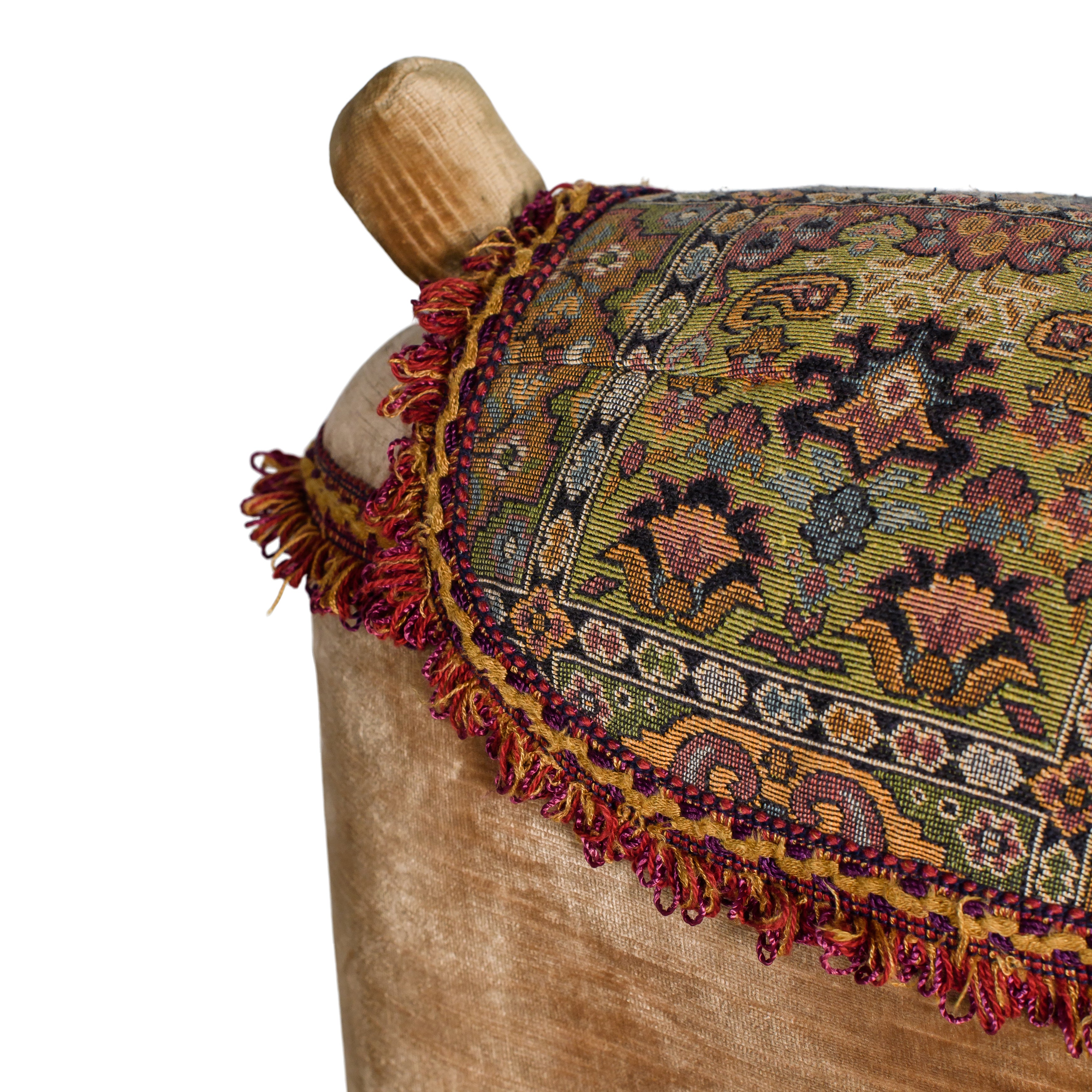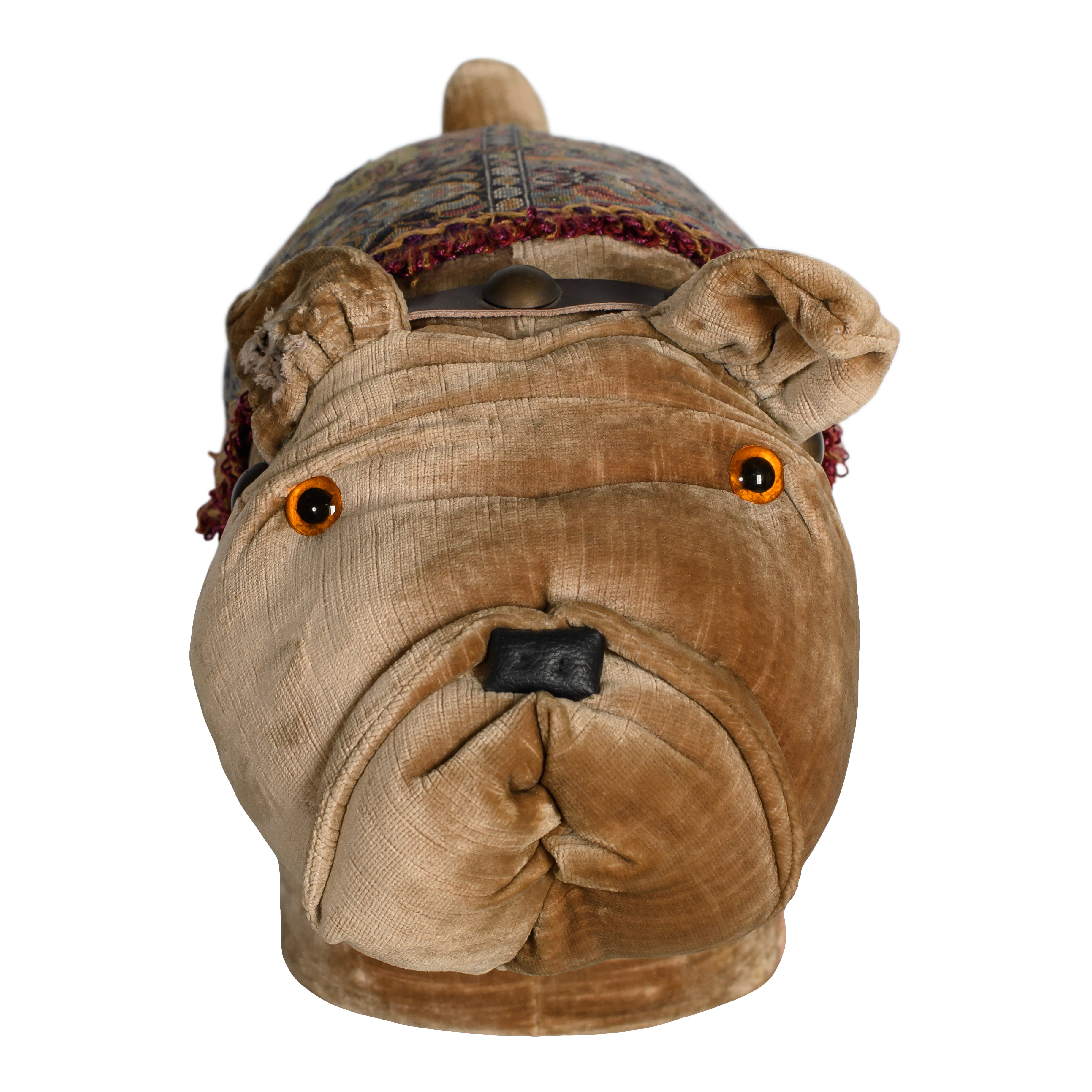 The Selenny Bulldog Footrest is a playful vintage find, upholstered in soft caramel velvet with a patterned tapestry saddle and leather collar detail. Its sculptural form doubles as a conversation piece, adding whimsy and character to lounge vignettes or styled displays.