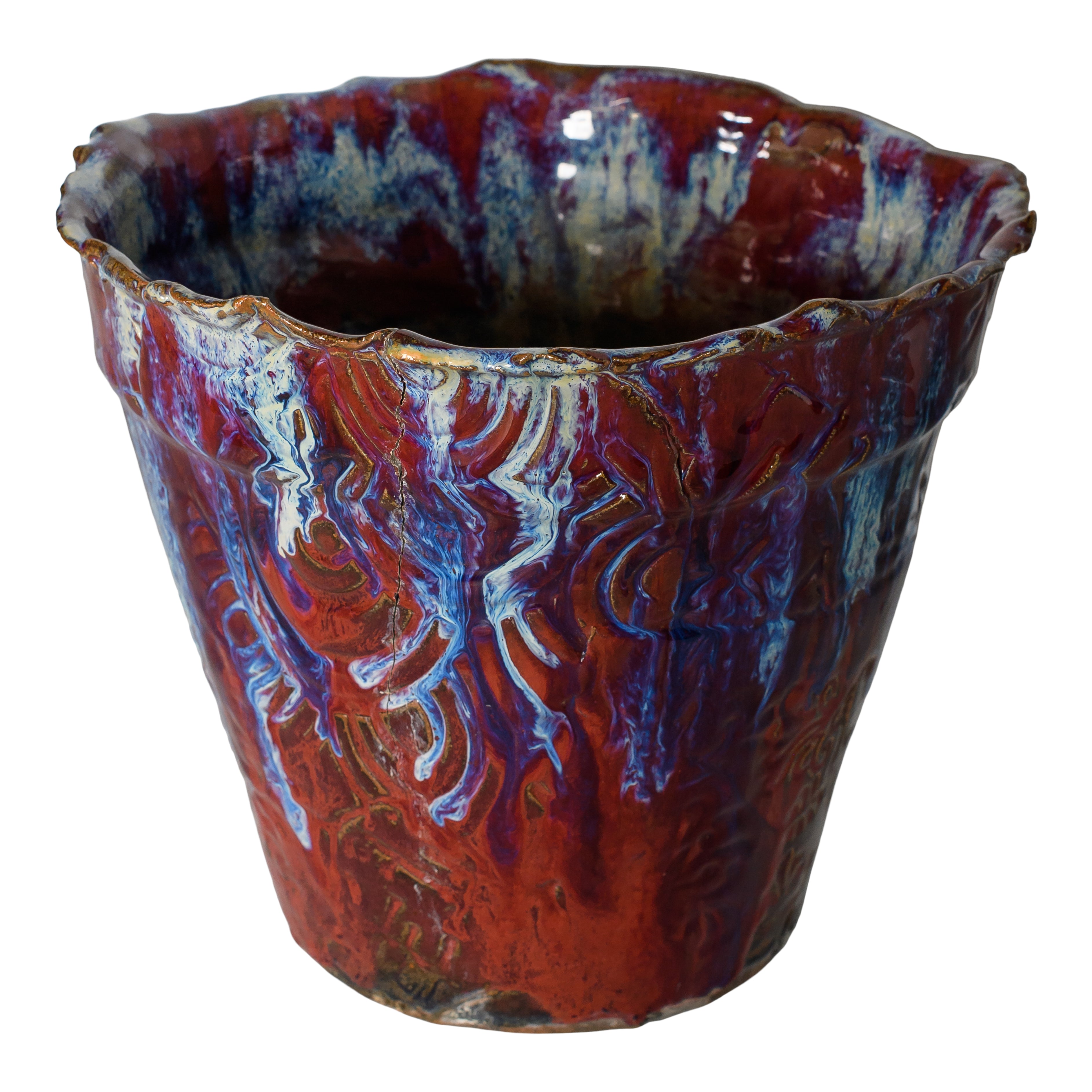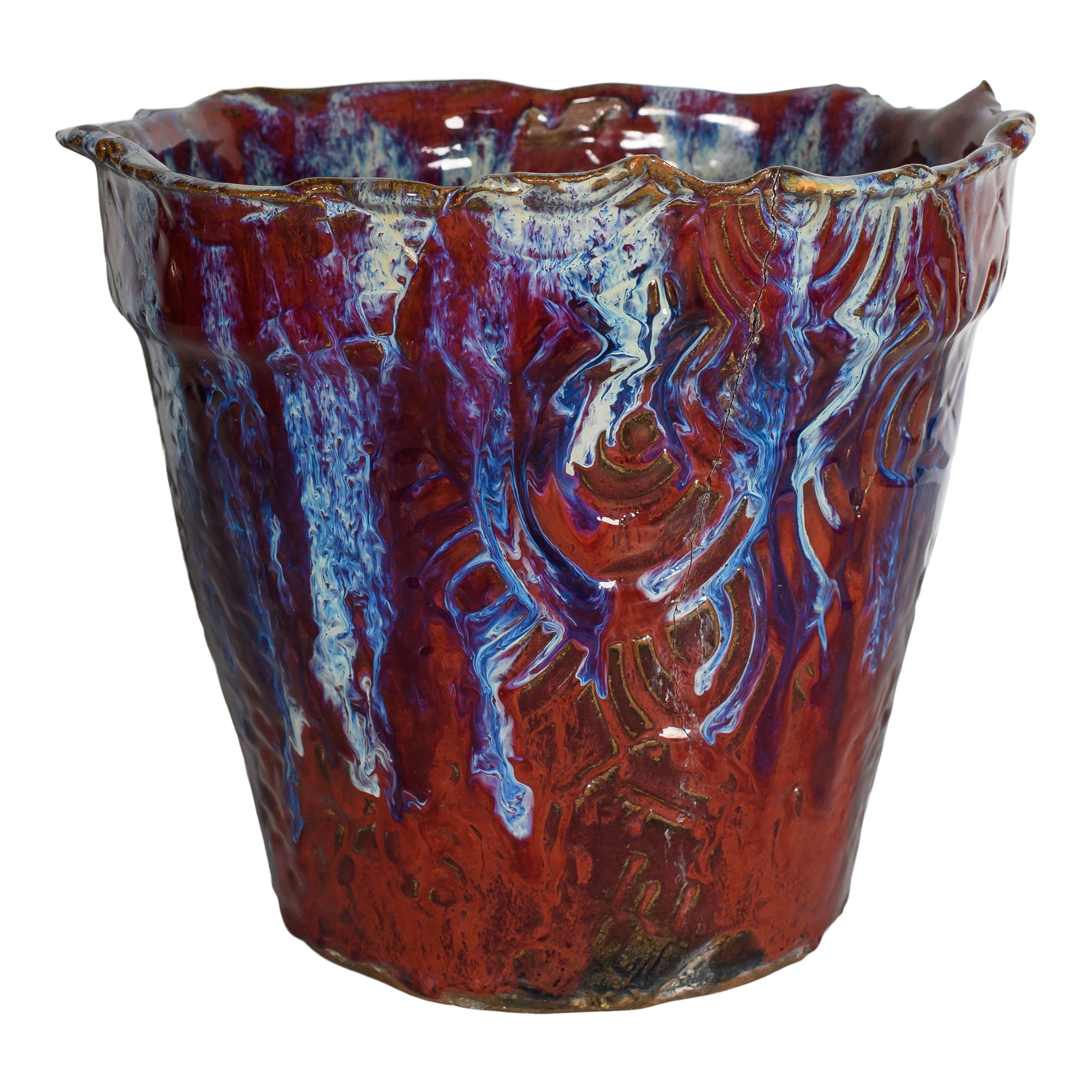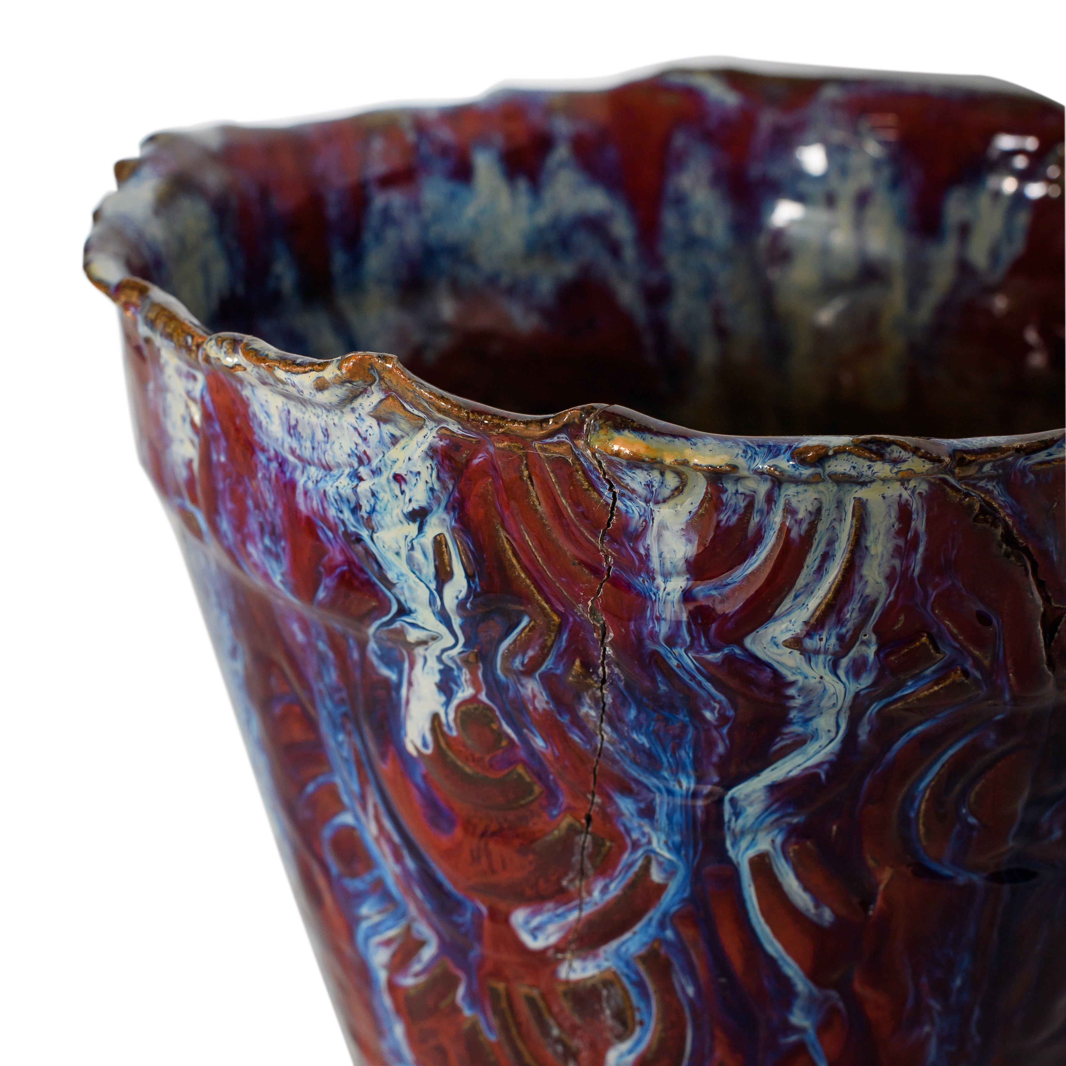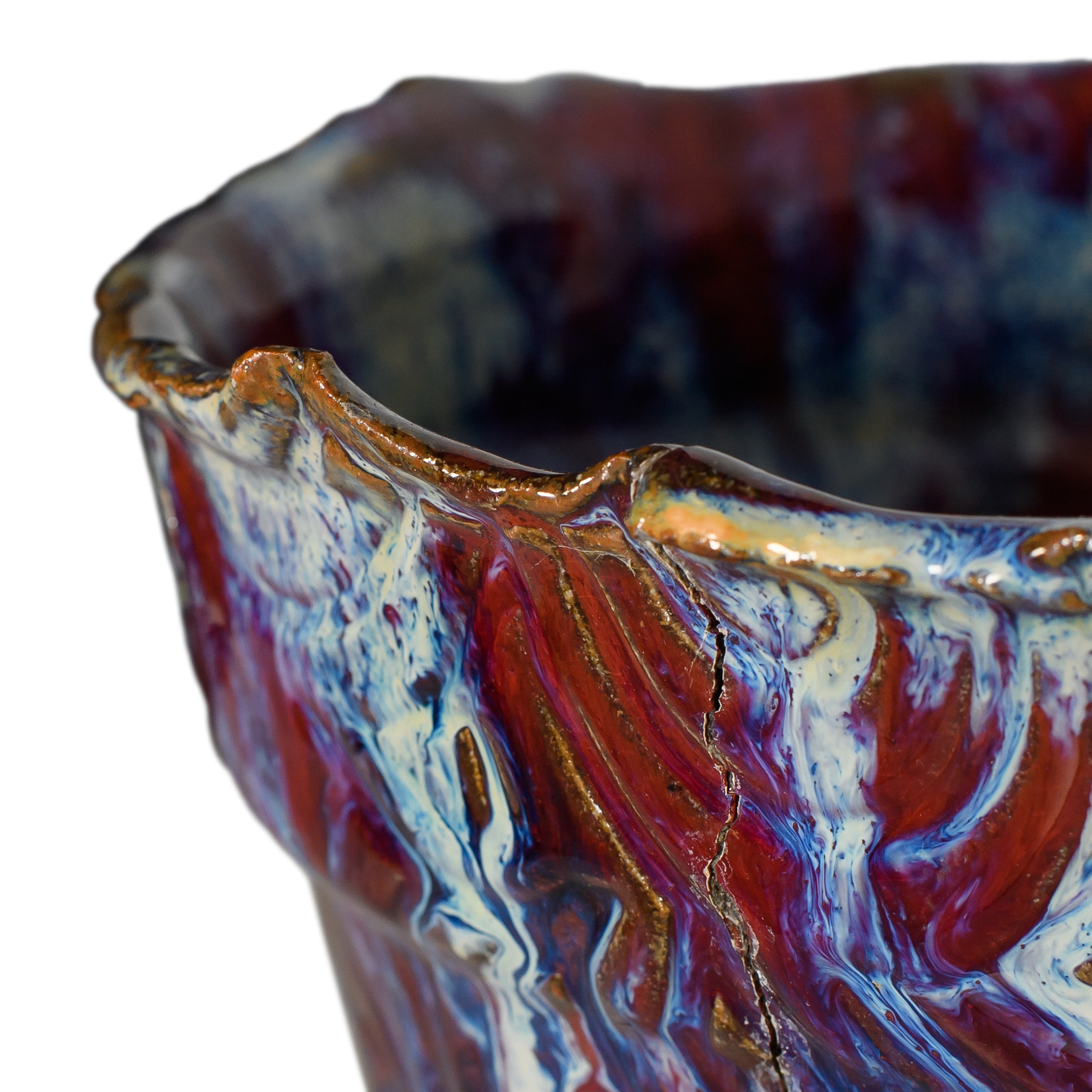 A vibrant ceramic vessel with a rippled silhouette and a bold, layered glaze in rich reds, deep blues, and soft periwinkle tones. The hand-formed texture and fluid patterning give it an artistic, one-of-a-kind look. Use it as a standout accent for florals, branches, or styled displays at events where color and character take center stage.