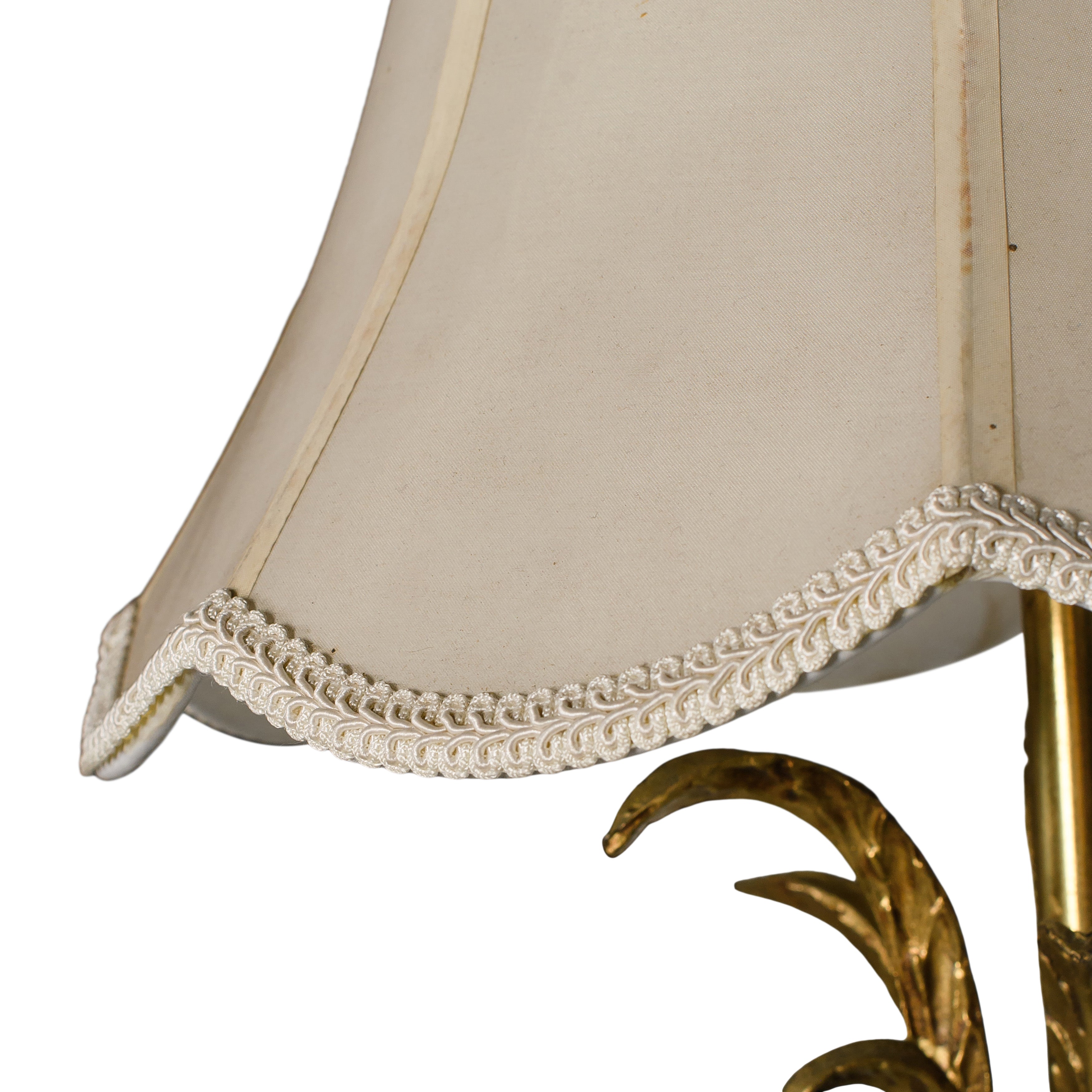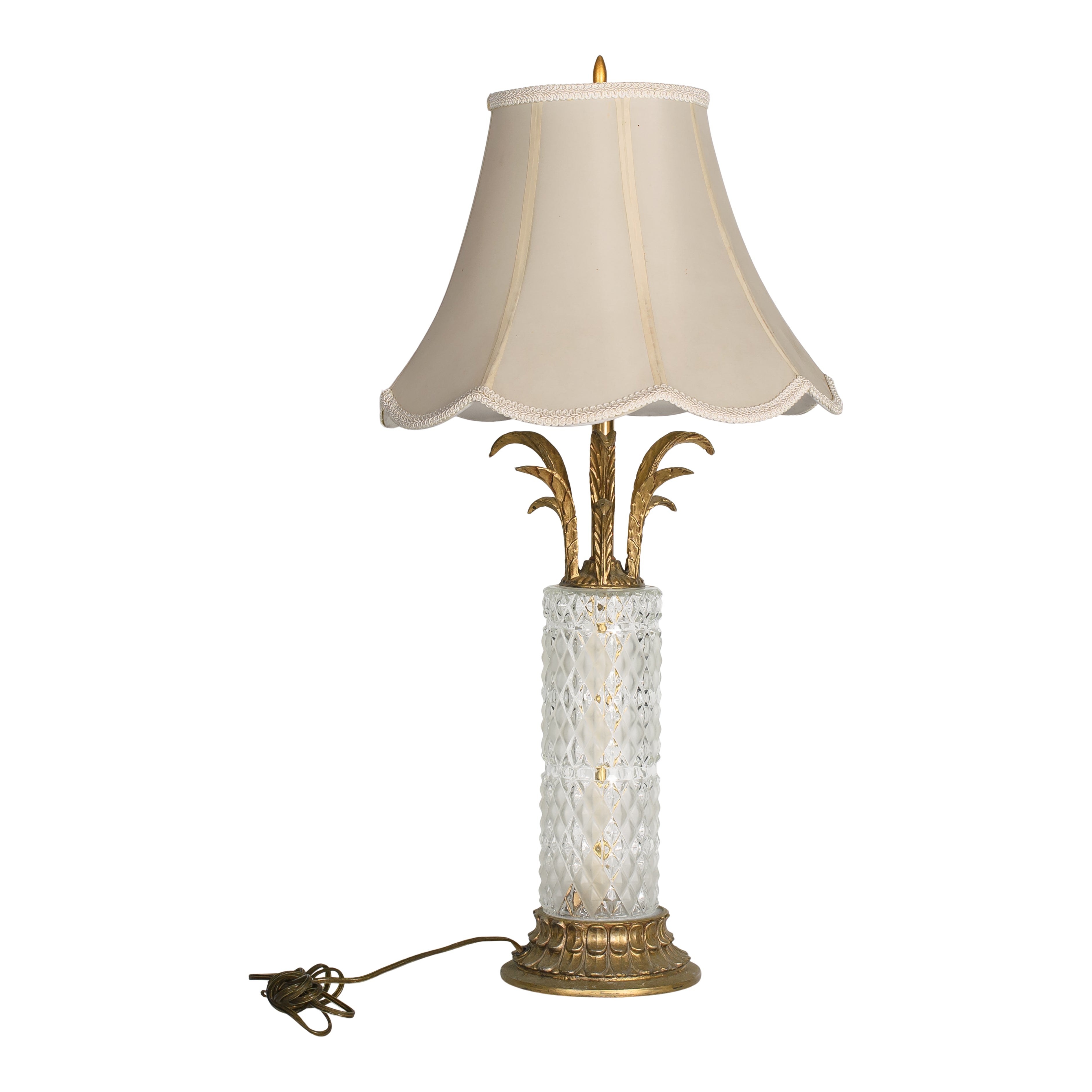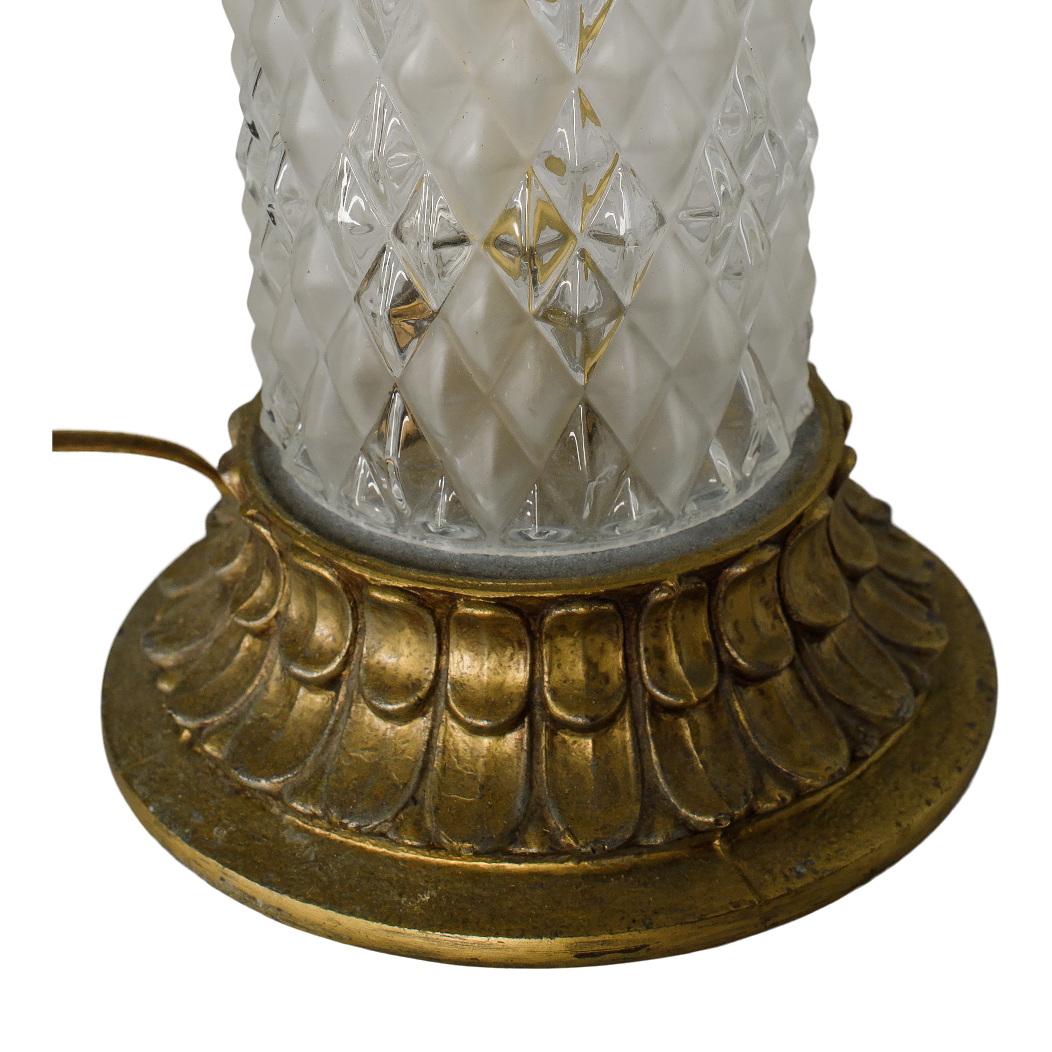 A classic table lamp with a sculpted brass base, a clear glass column with diamond pattern detailing, and a soft beige scalloped shade. It brings a warm polished presence to tabletops or styled events.