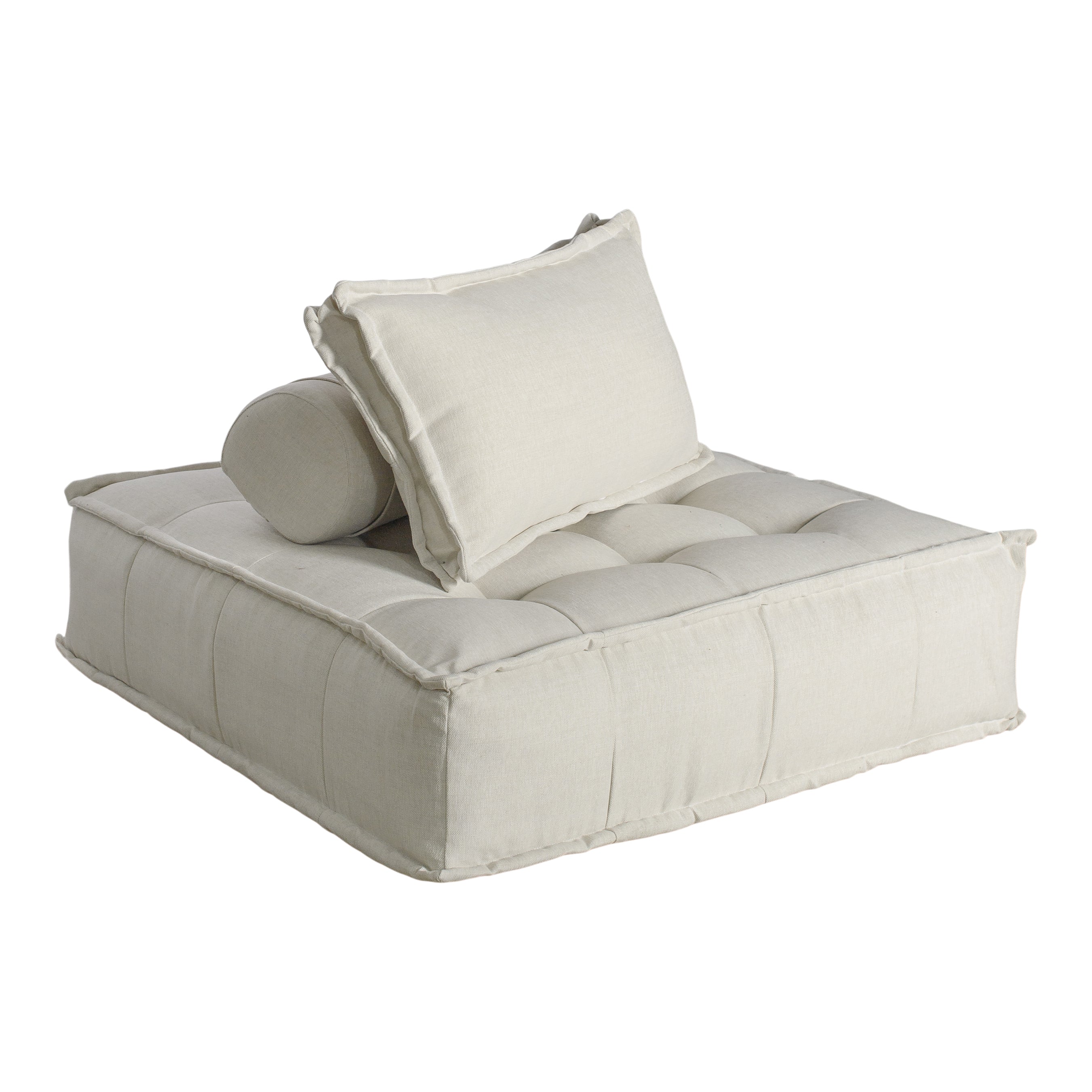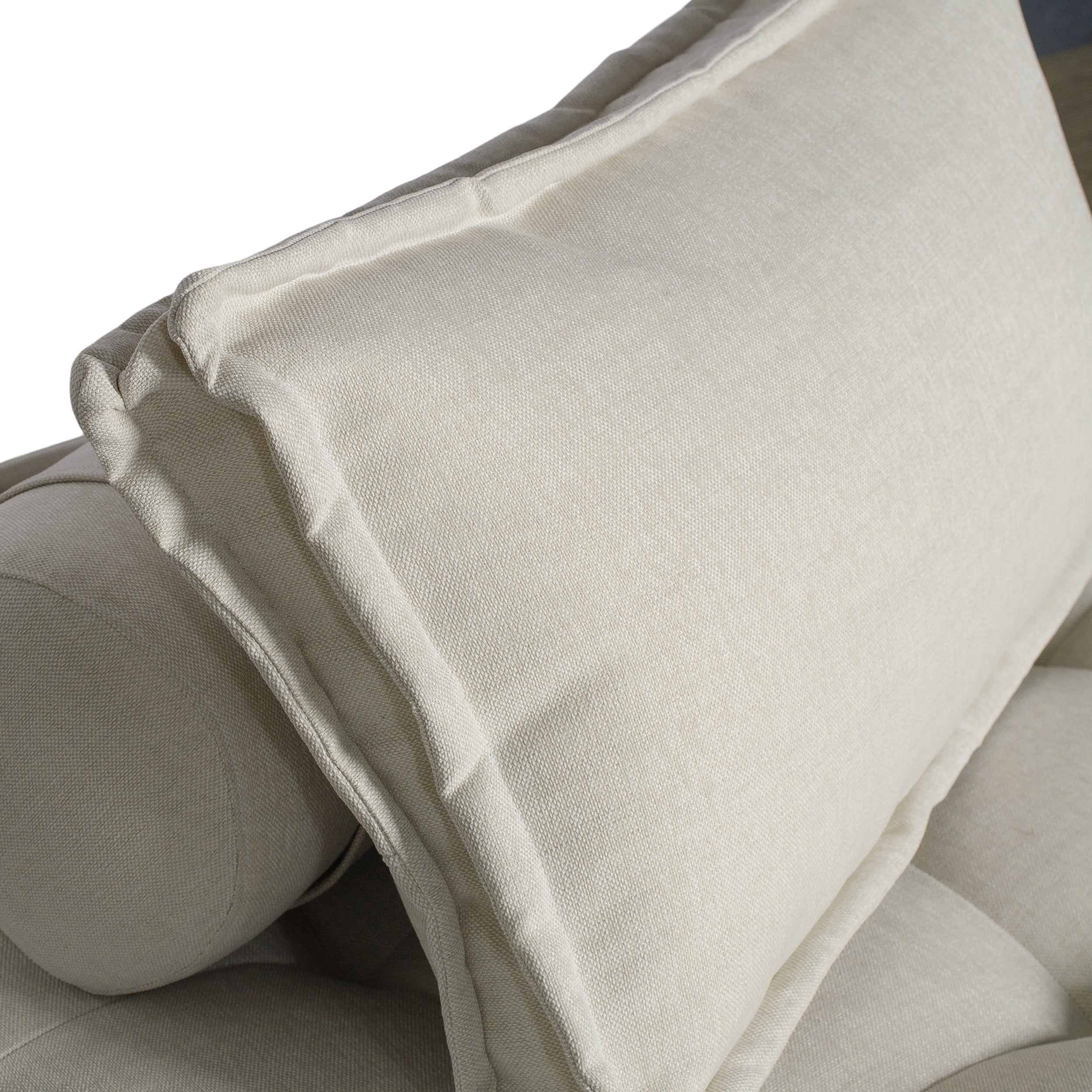 Ivory linen lounger with removable cushions. Perfect for large scale seating and a chic lounge area at any wedding, corporate party, or special event. Available in multiple colors. Can be sat on either side. Seat height: 15"