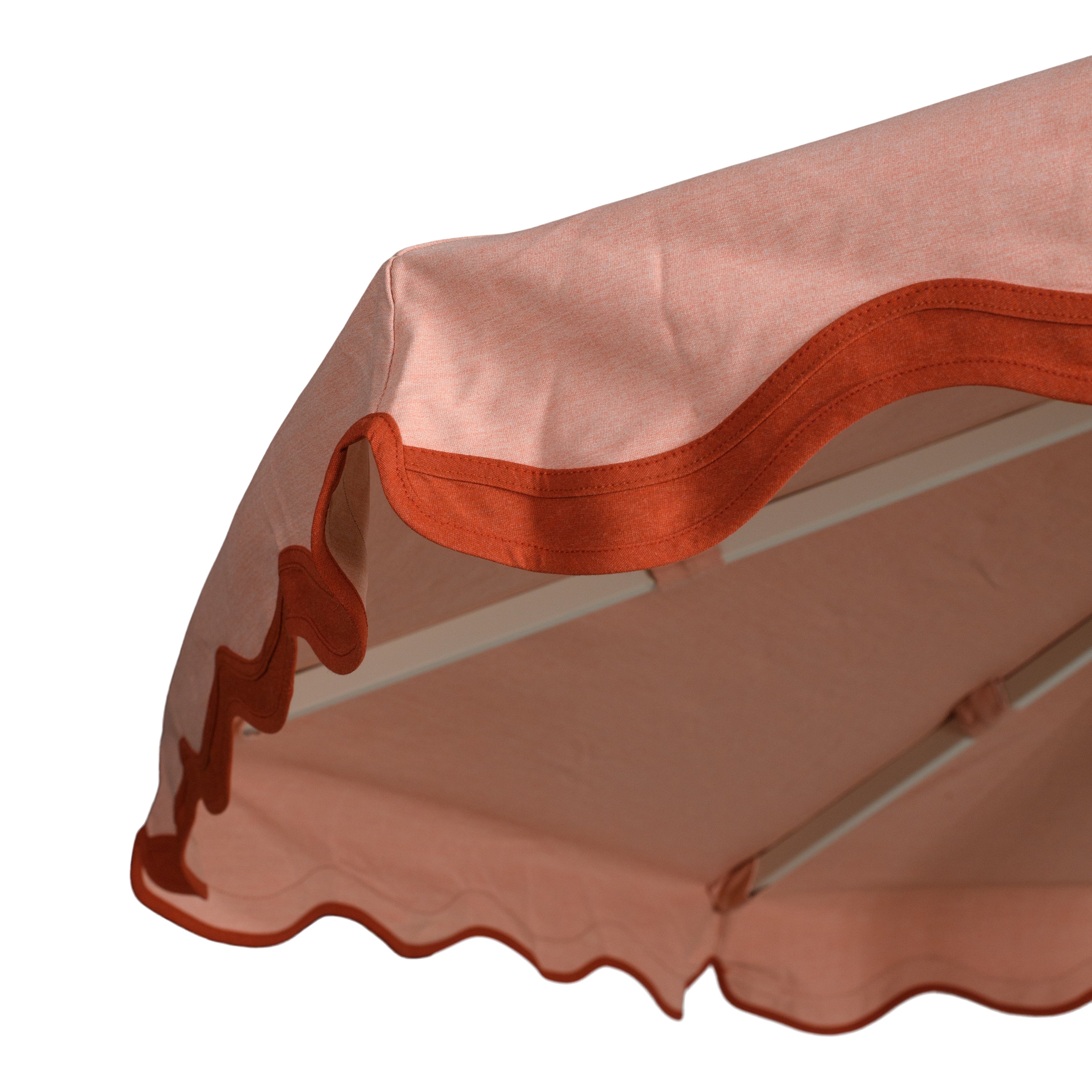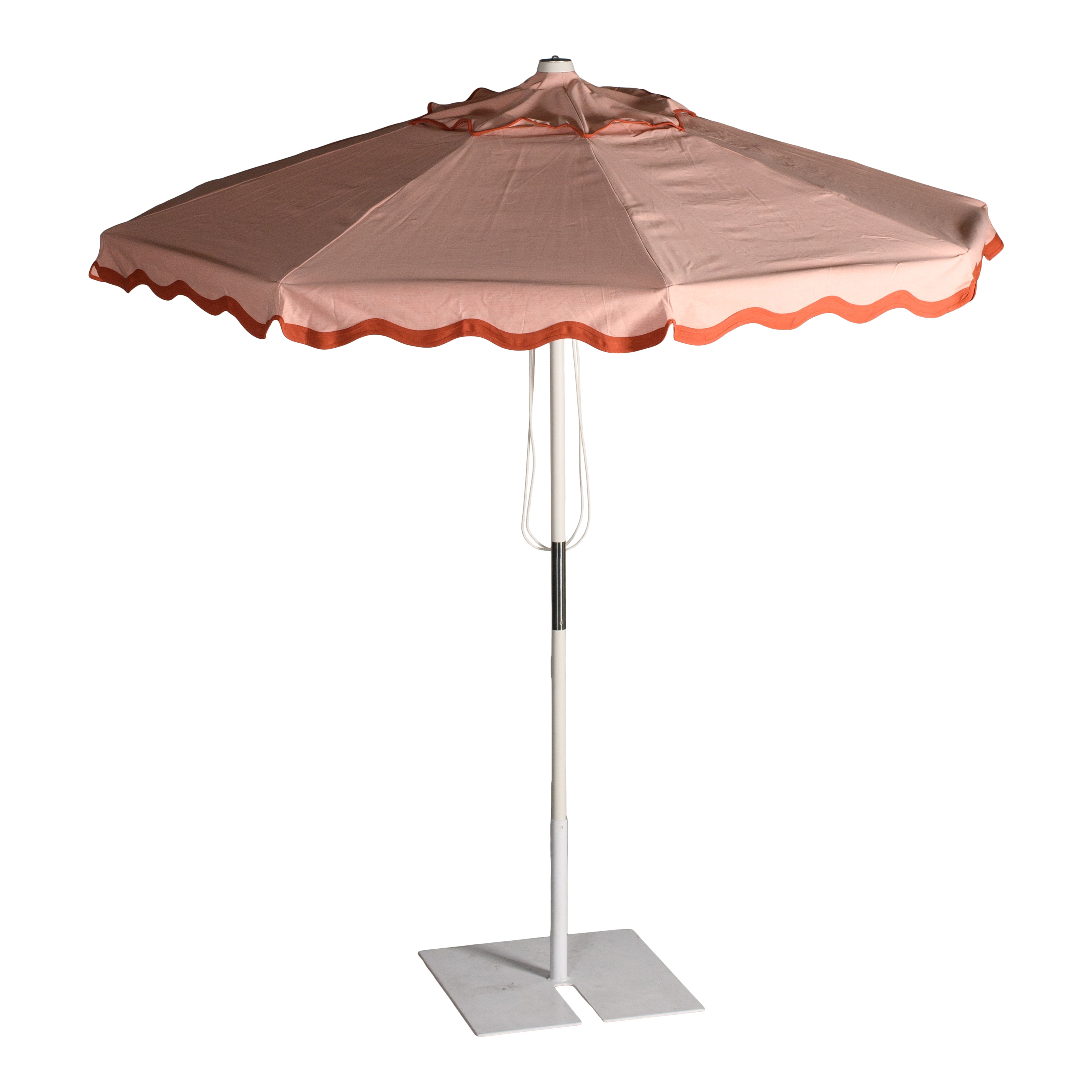 A playful take on classic shade, the Sunny Grande Umbrella by Business & Pleasure brings a splash of vintage resort style to outdoor lounges and poolside setups. Featuring a soft blush canopy with wavy rust trim, this oversized umbrella offers generous coverage while adding a cheerful pop of color. Can be used with a white or black base.
