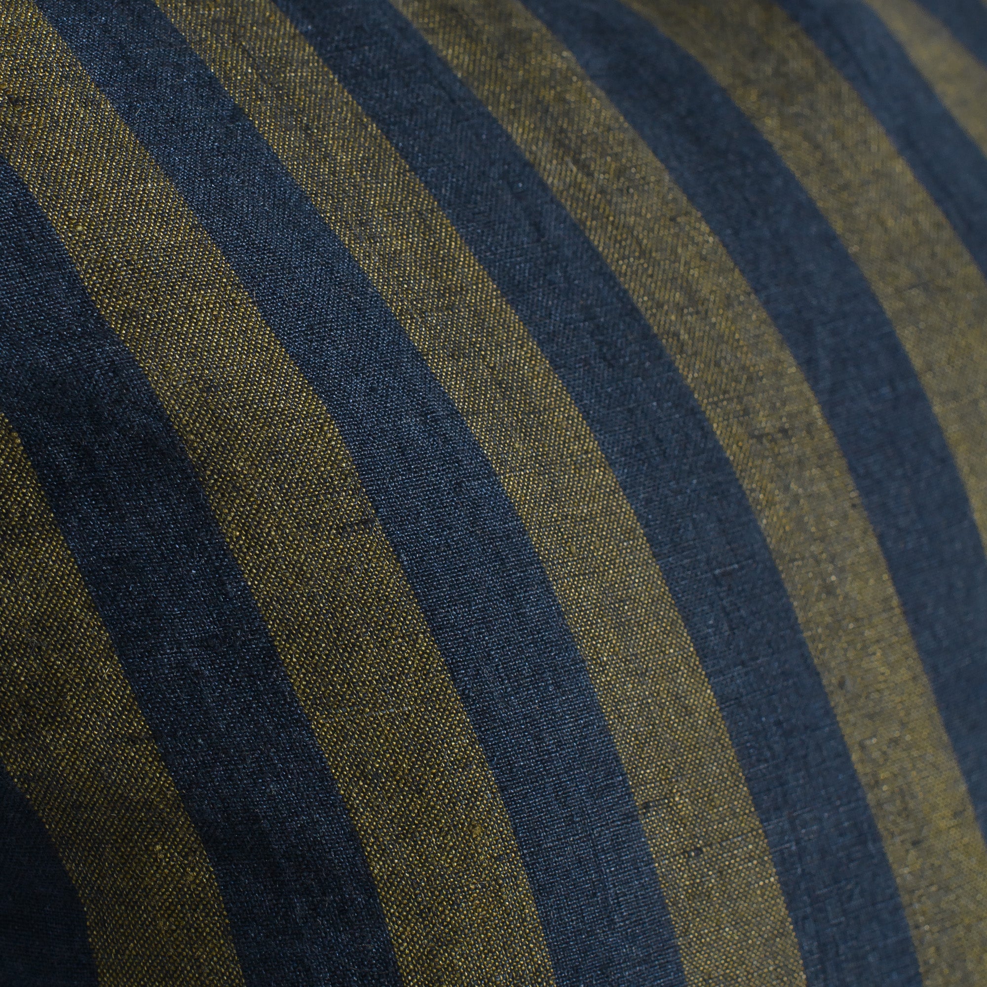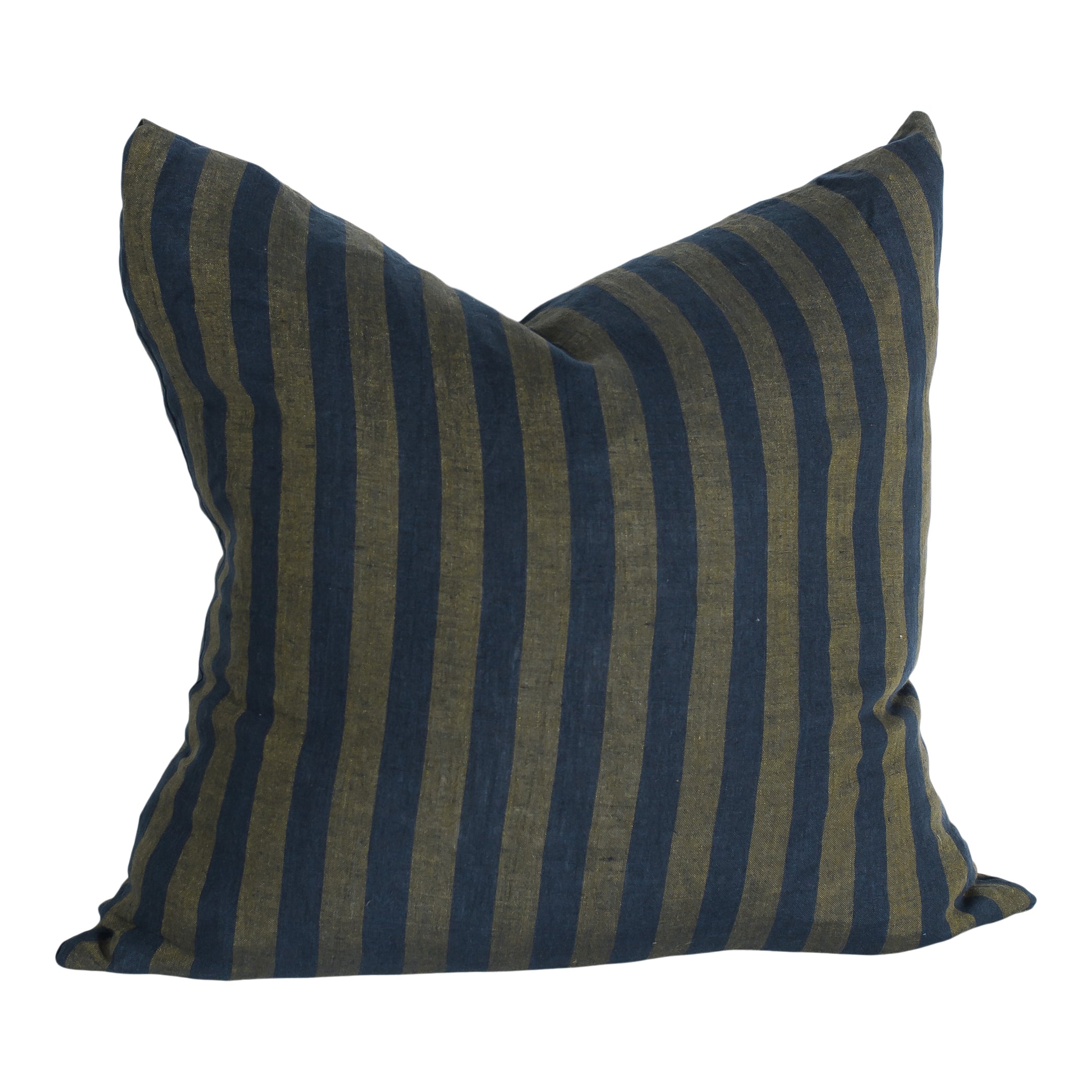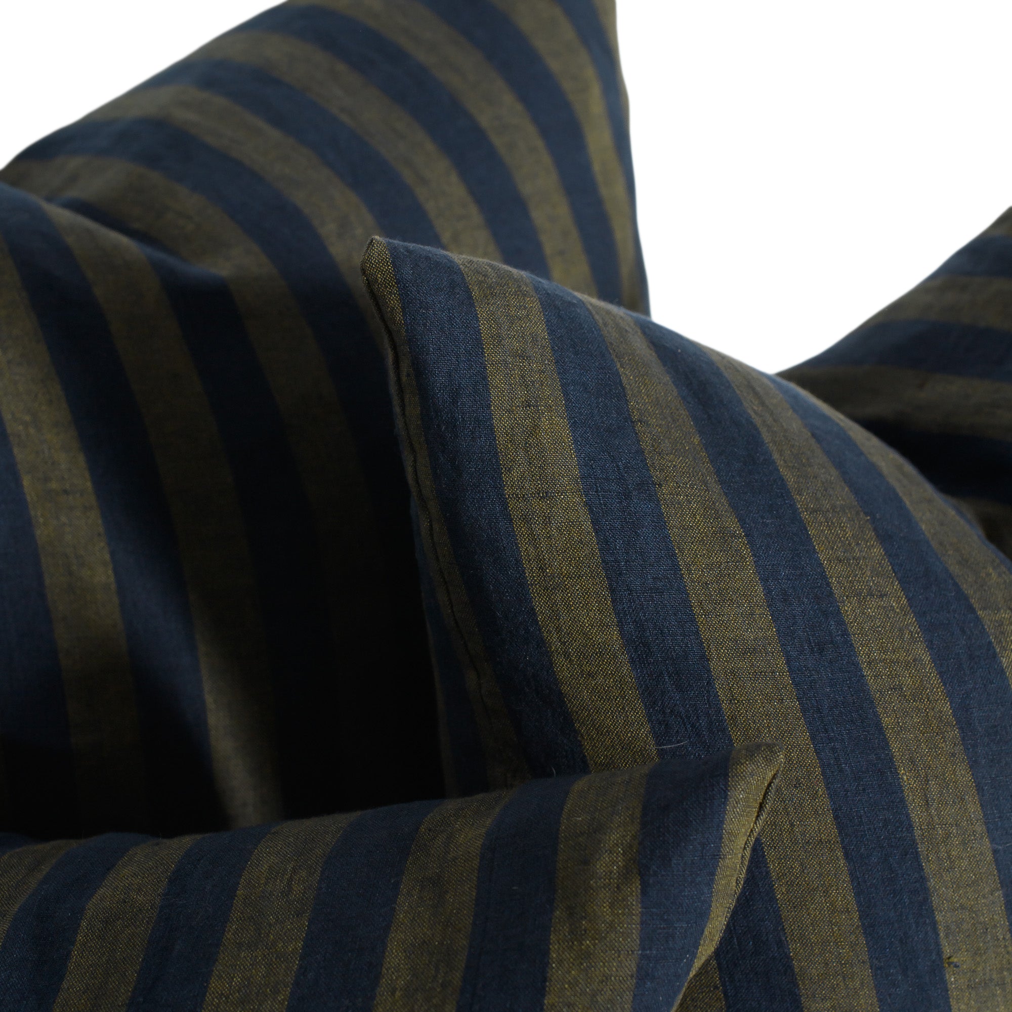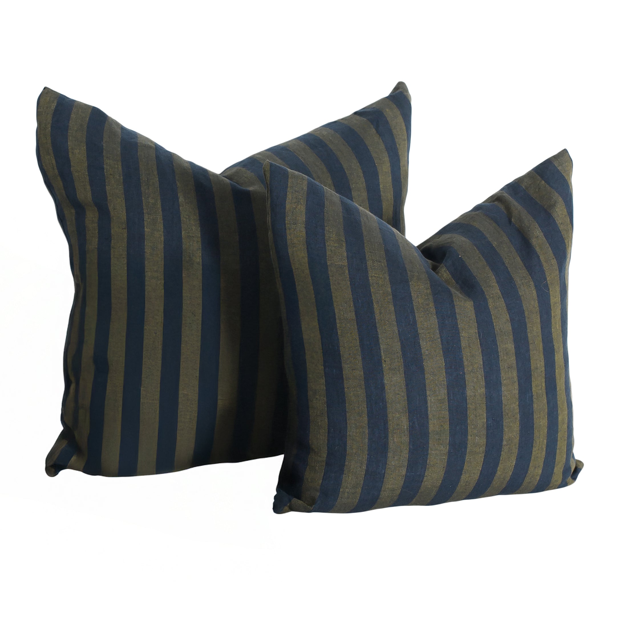 A pair of pillows in a navy and olive stripe. The bold, tailored pattern adds visual interest to any design. Size may vary.