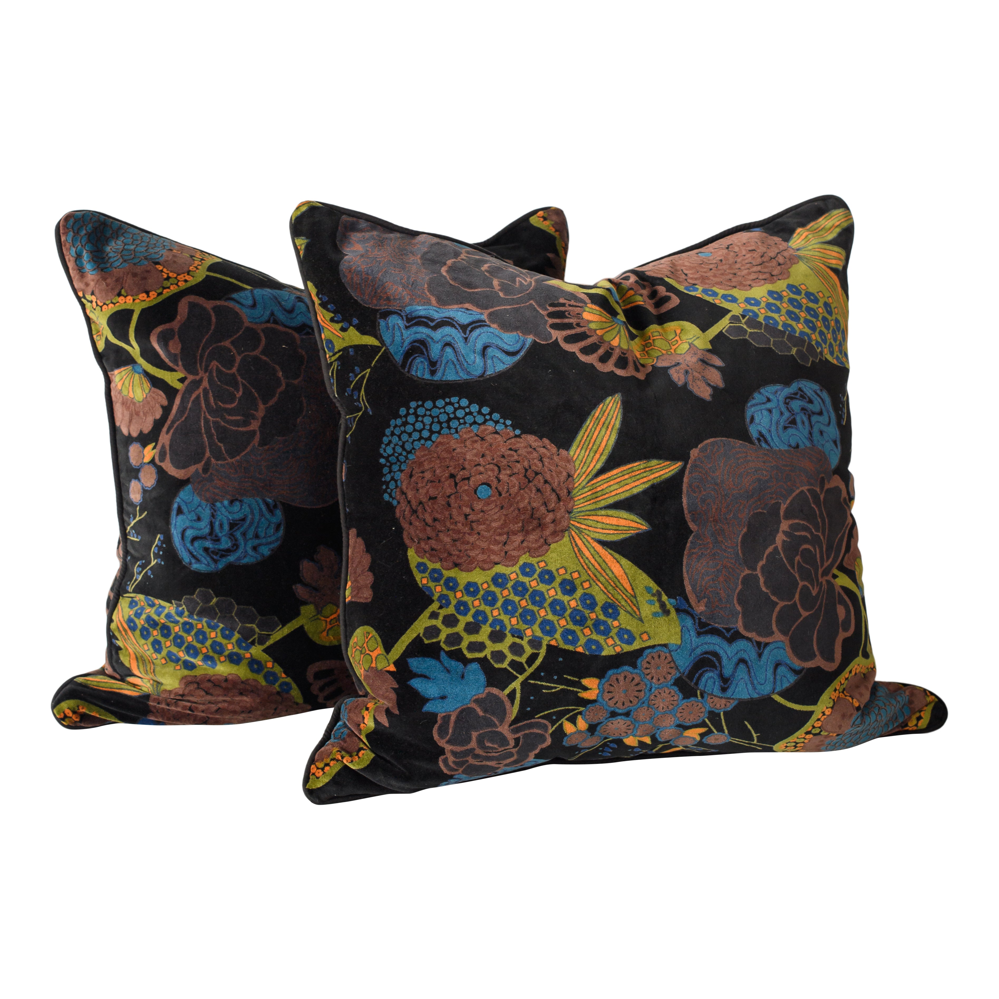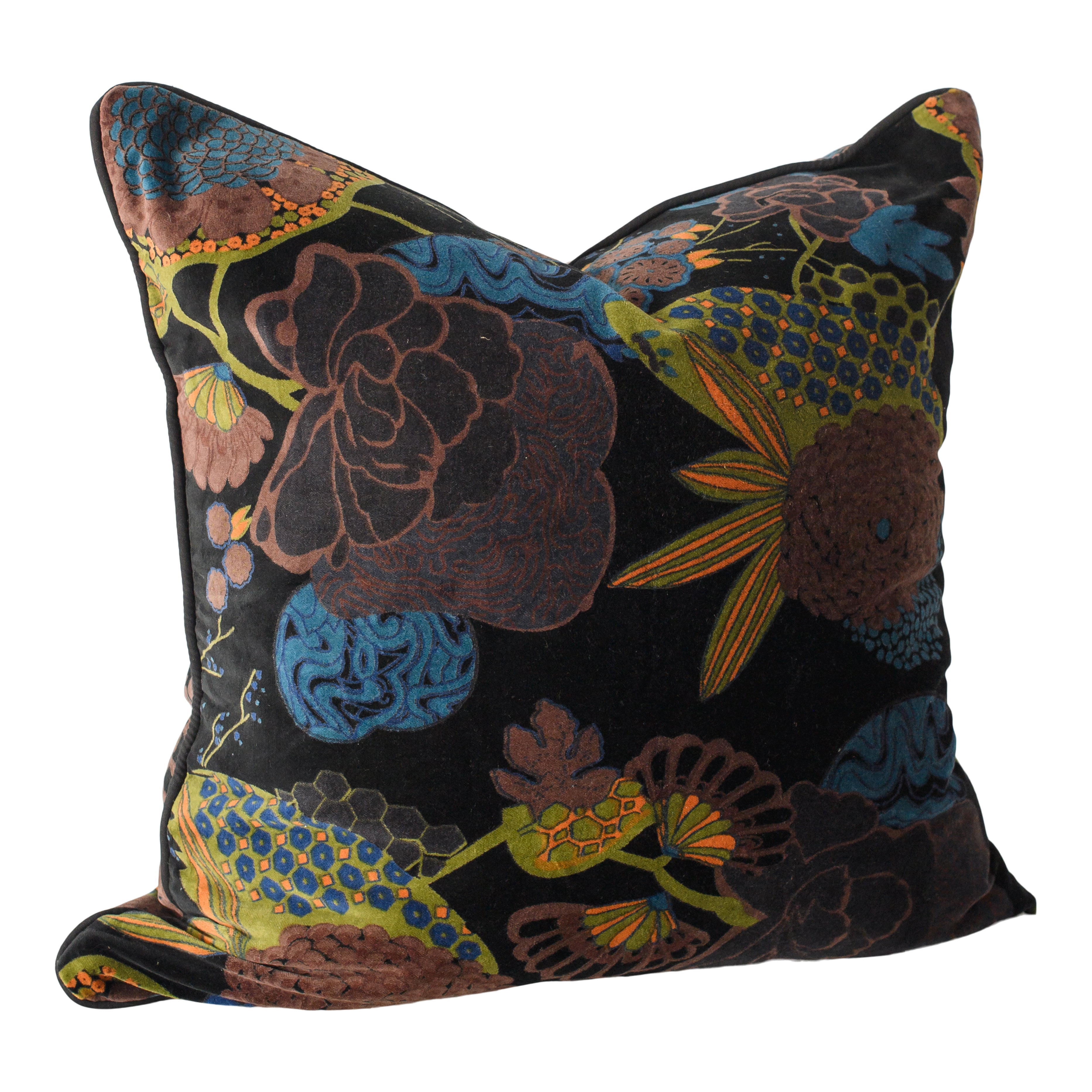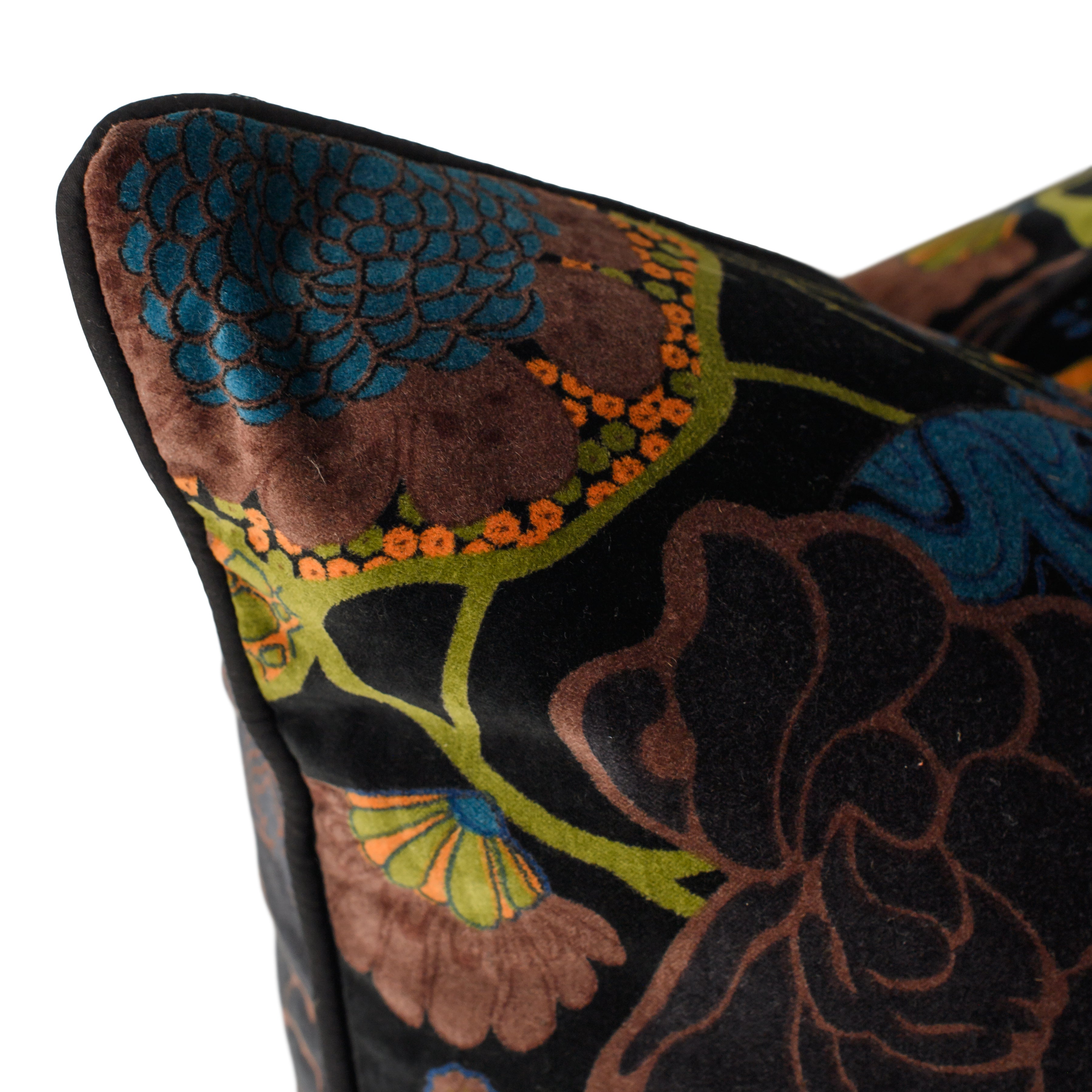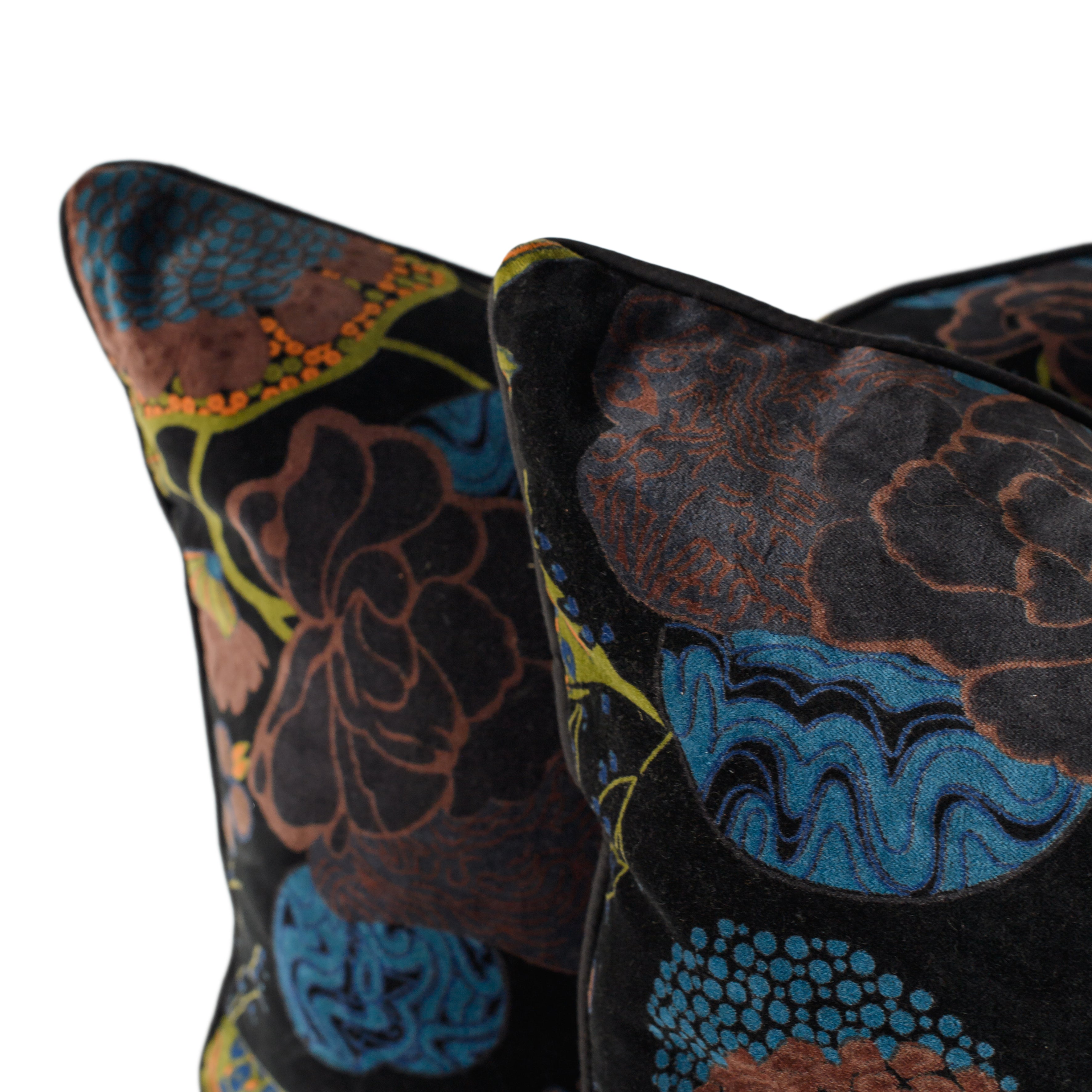 The Tamar Black Pillows feature a black velvet backdrop with a bold botanical pattern in rich hues of blue, brown, and green. Their moody palette and plush texture bring depth and visual interest to any seating area. Rented as a pair, they layer beautifully with solid velvets, vintage textiles, or patterned rugs for a collected, artful look.