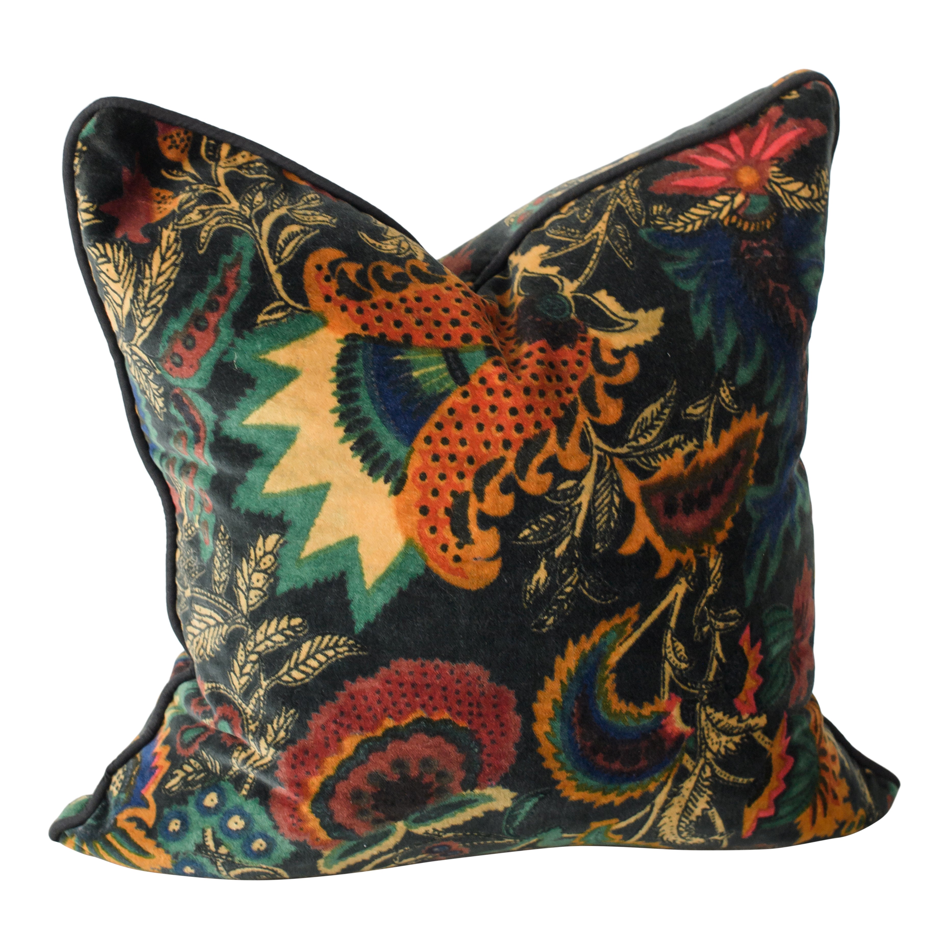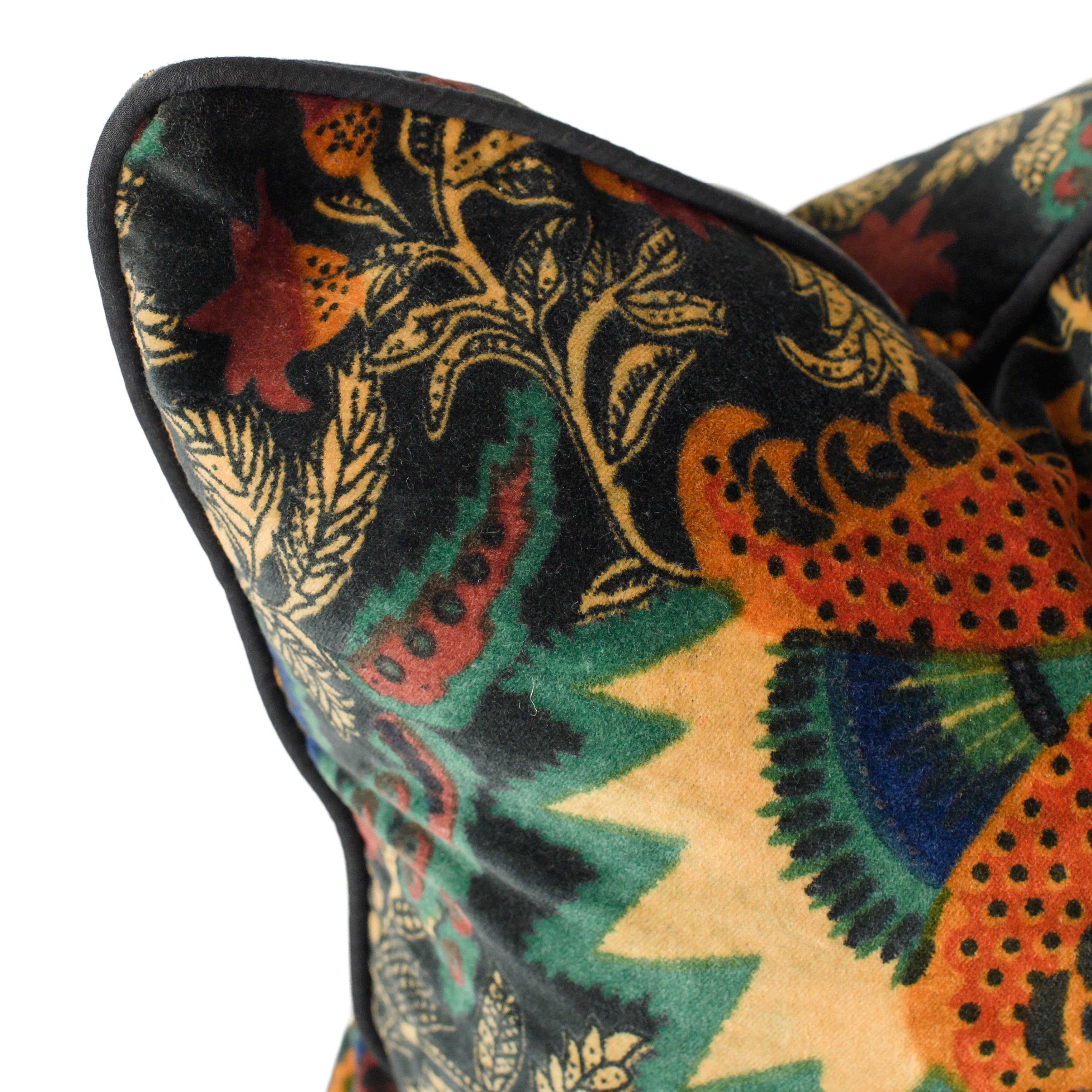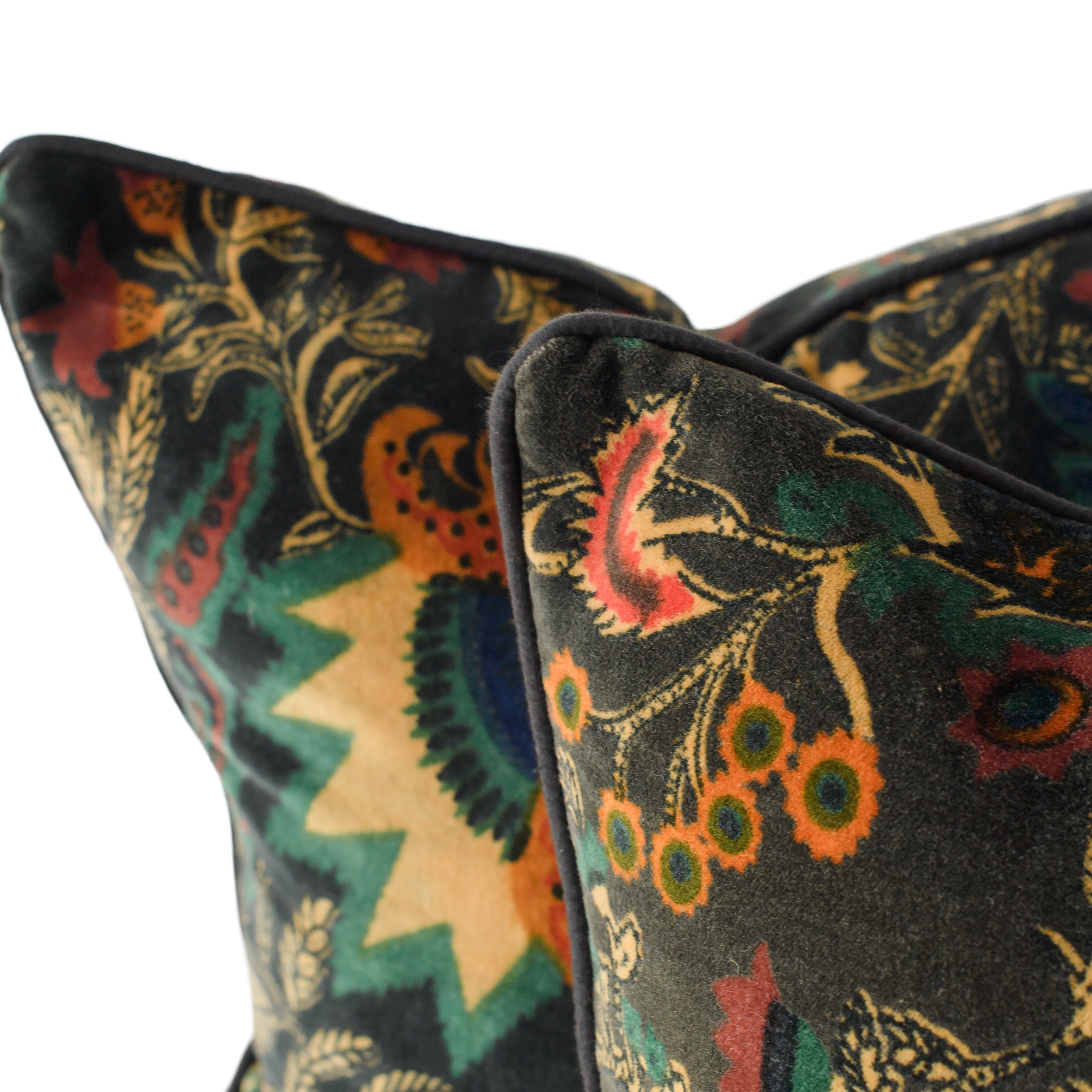 The Tamar Noir Pillow features a dramatic floral motif in golden amber, emerald, and crimson tones set against a deep black velvet backdrop. The rich pattern brings warmth and dimension to any seating arrangement, pairing beautifully with jewel-toned textiles, leathers, or vintage rugs. Rented as a pair, it adds a bold accent with timeless character.