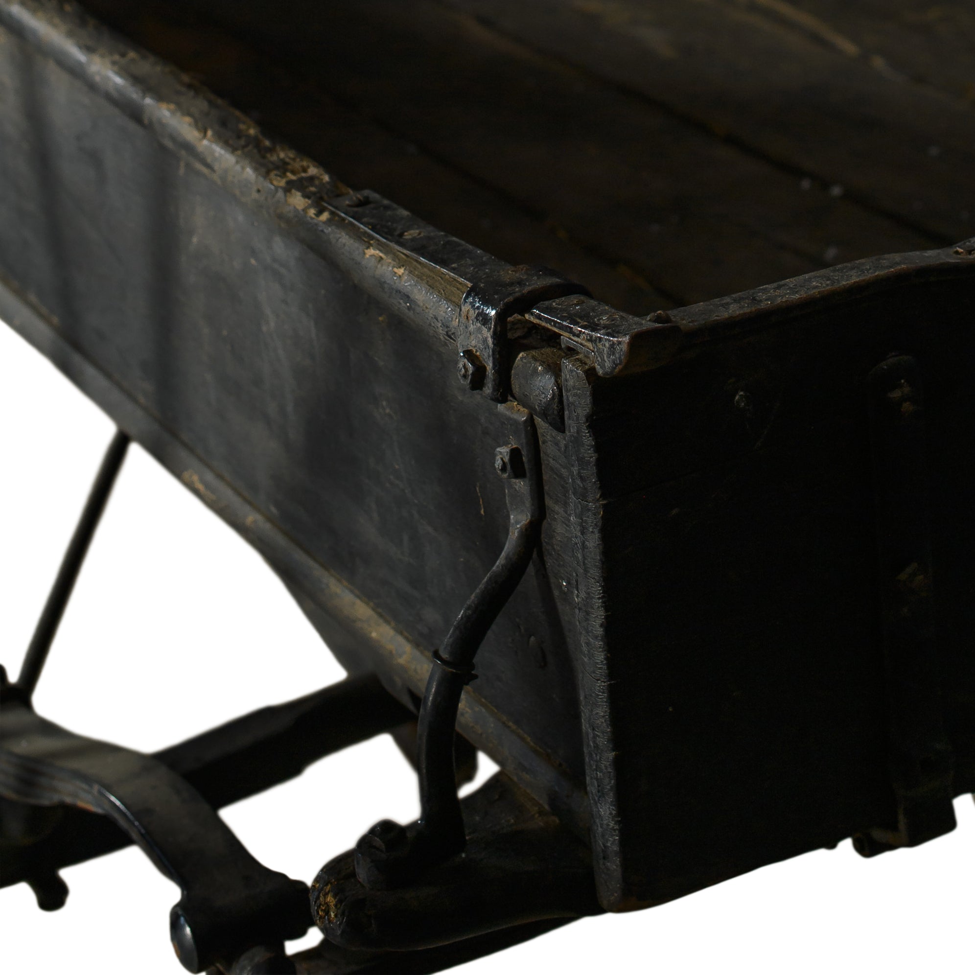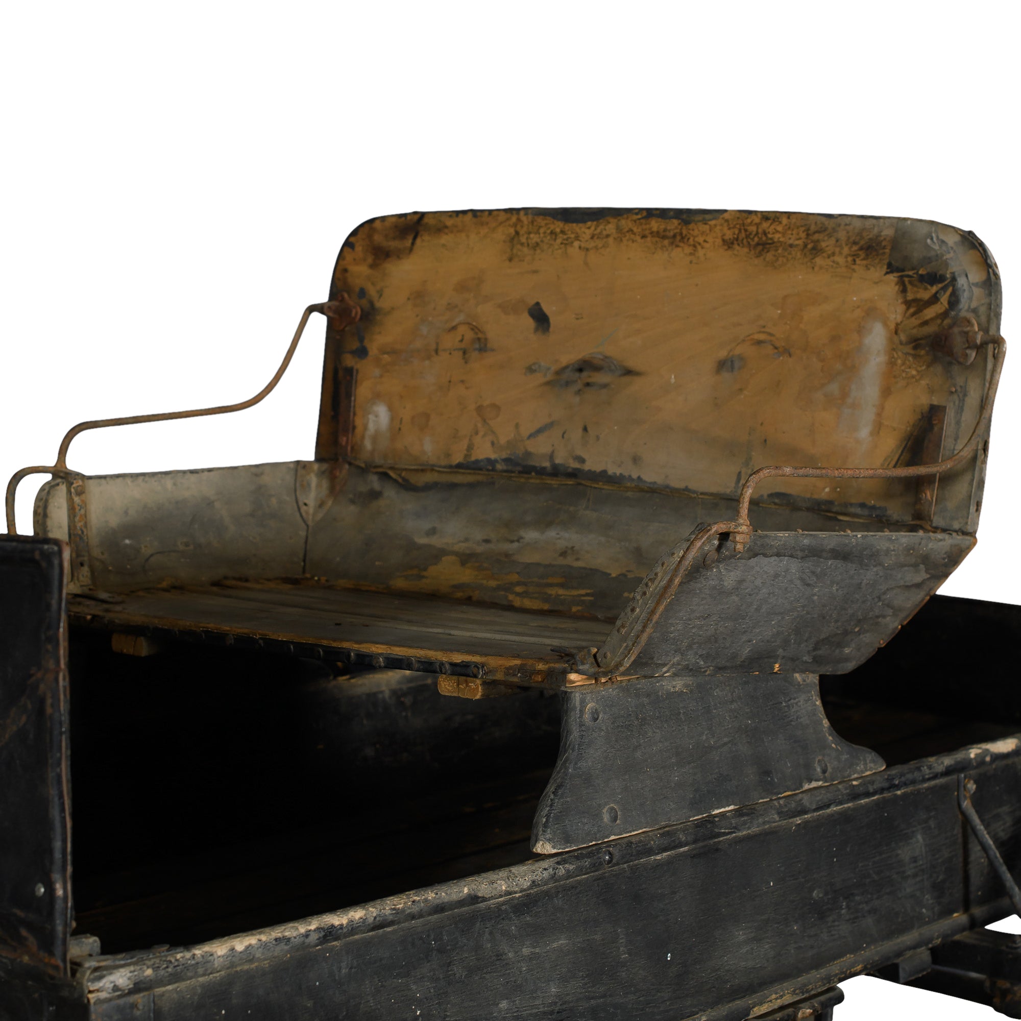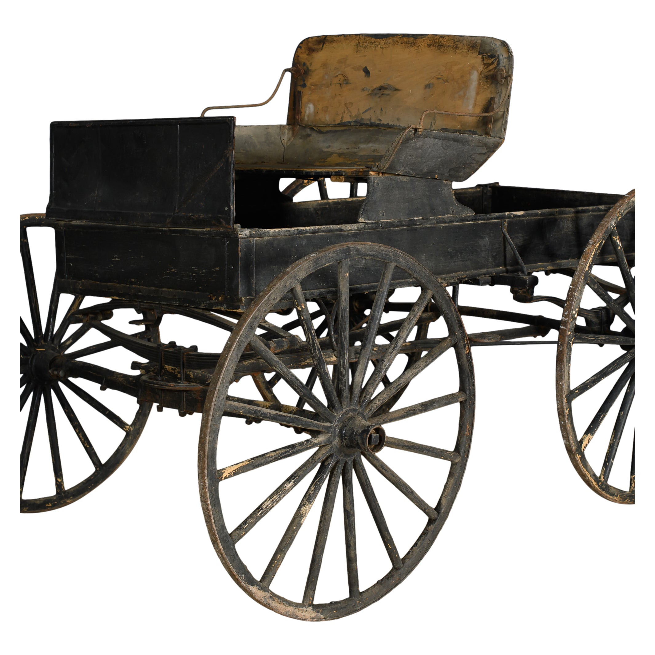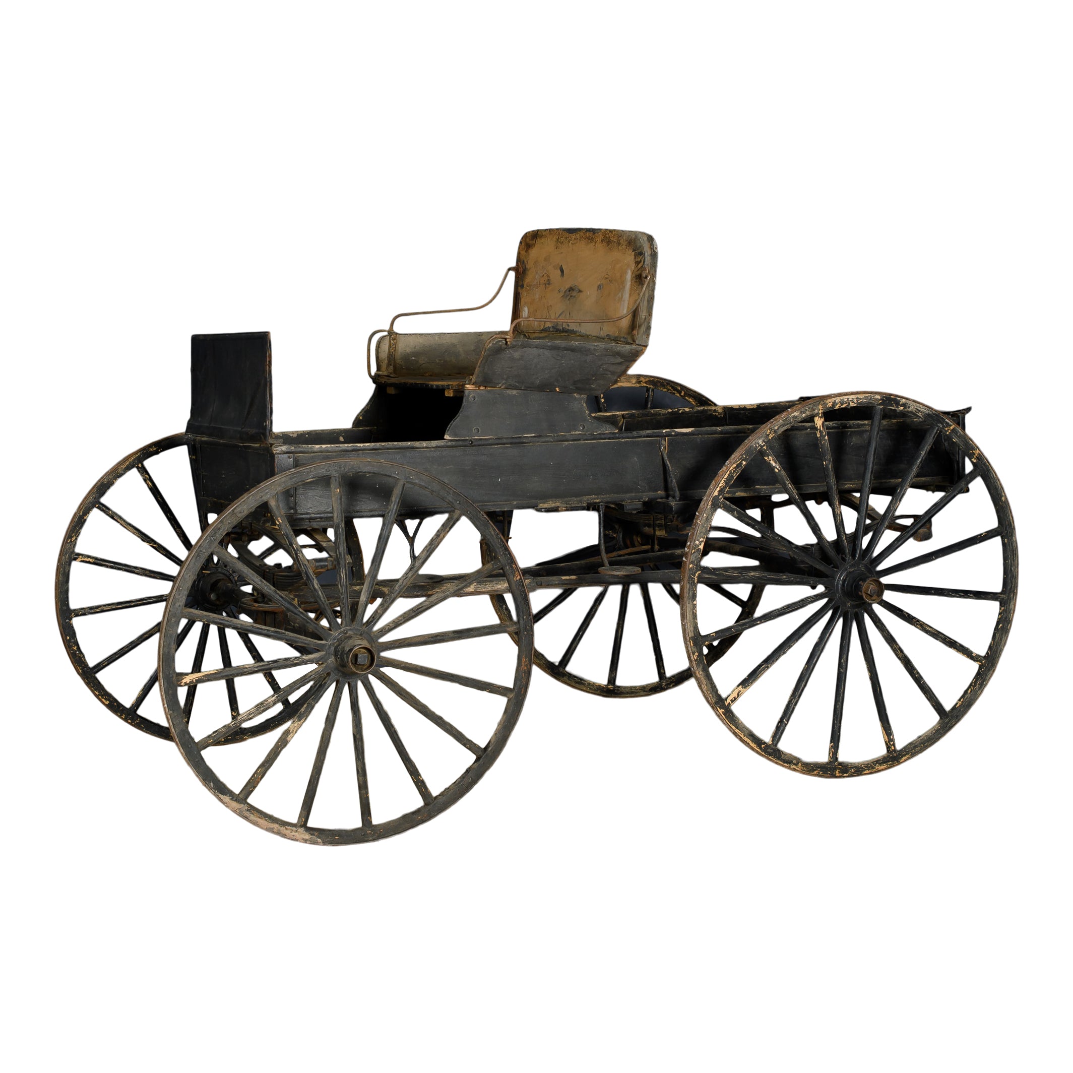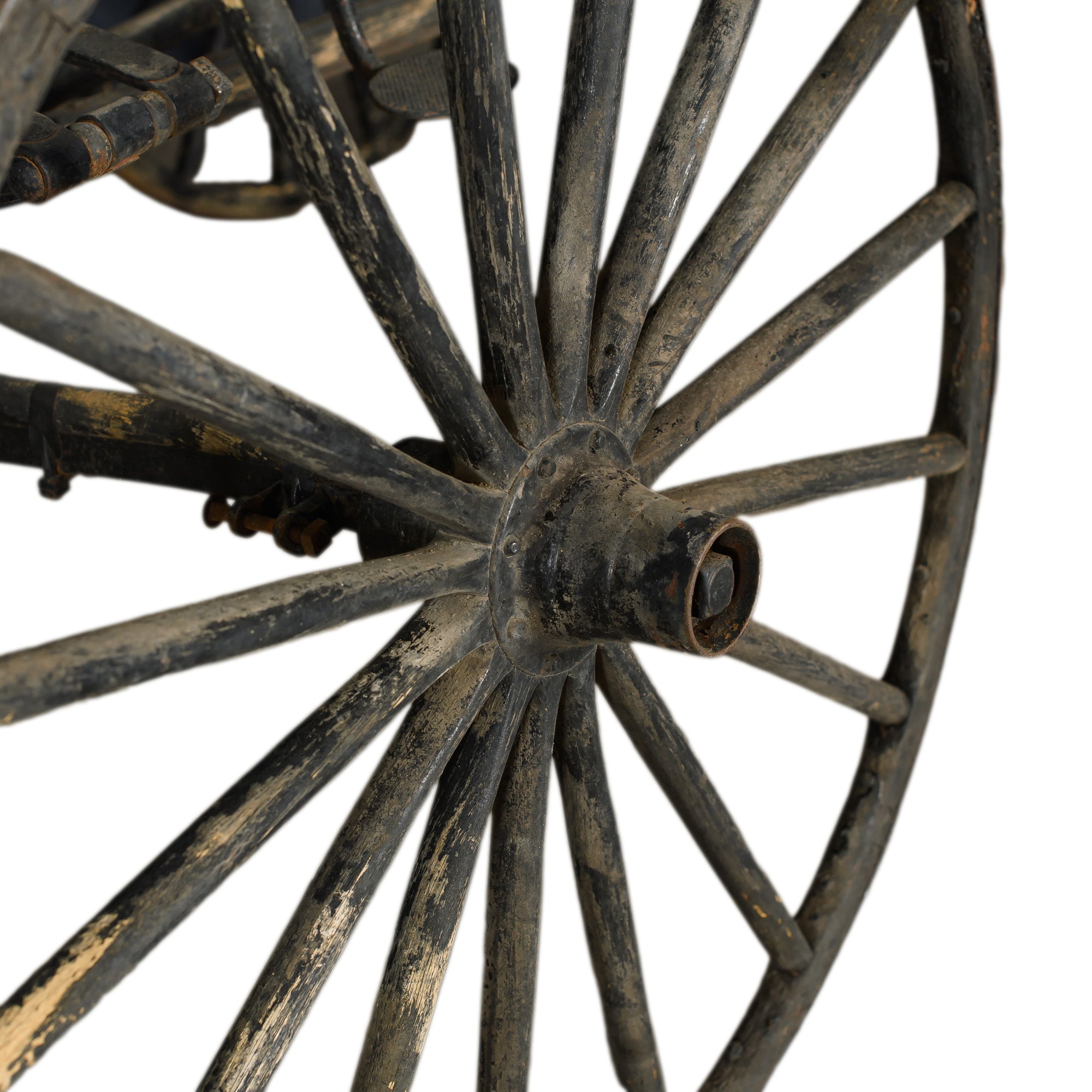 A vintage carriage with worn black paint, large spoked wheels, and a weathered seat that speaks to its age. This piece brings instant storytelling to any setup and works beautifully as a photo moment, display base, or thematic prop for seasonal and outdoor events.