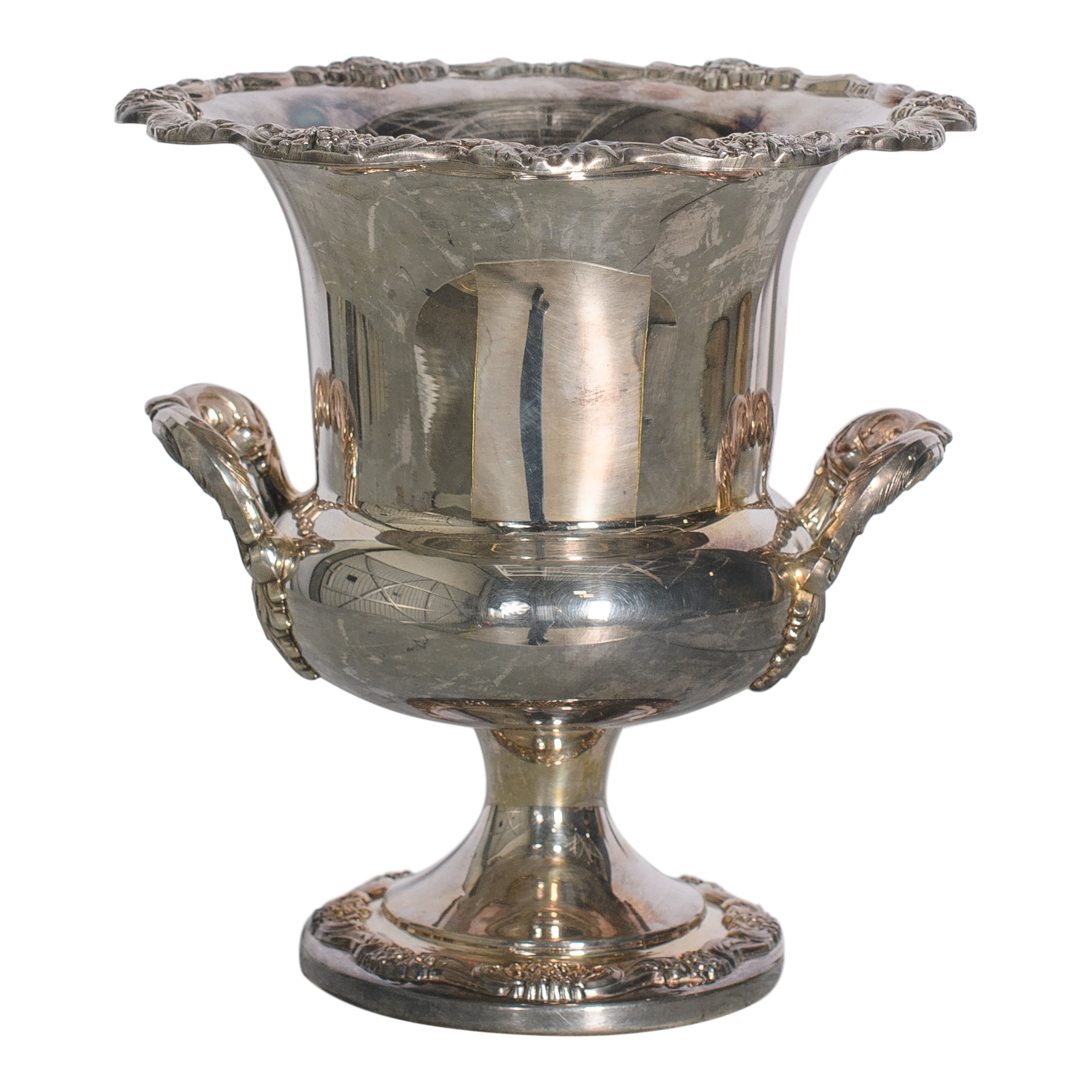 Distressed silver urn can be used for eclectic floral vessels, props on a display, or piled high with other silver pieces for a dramatic statement piece. Size may vary.